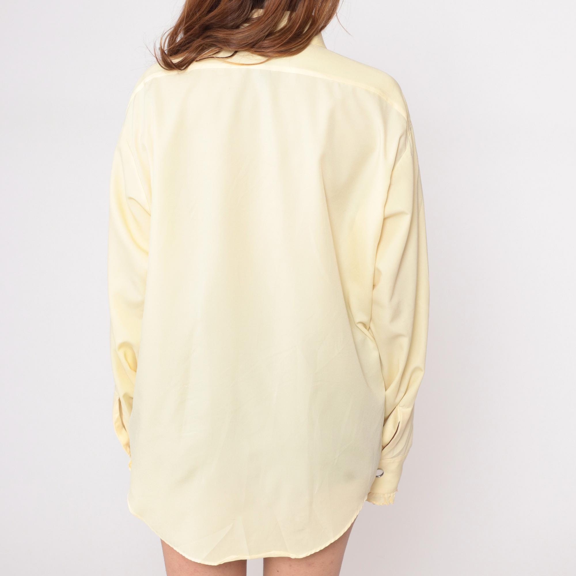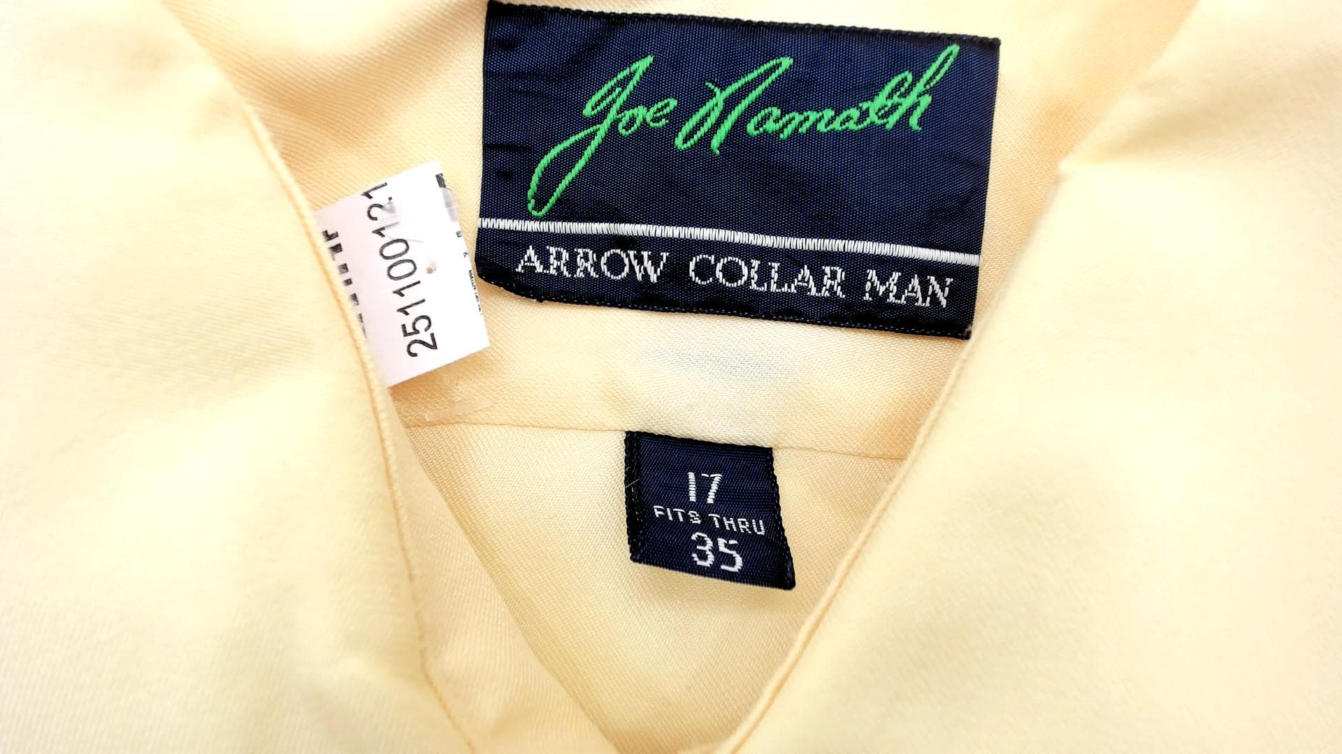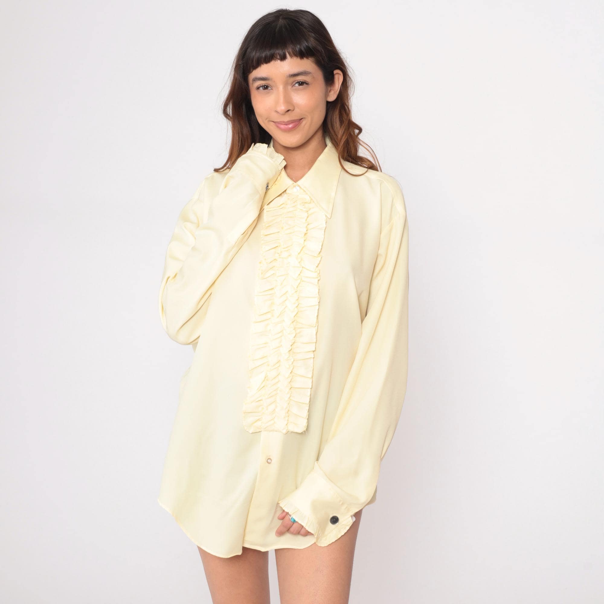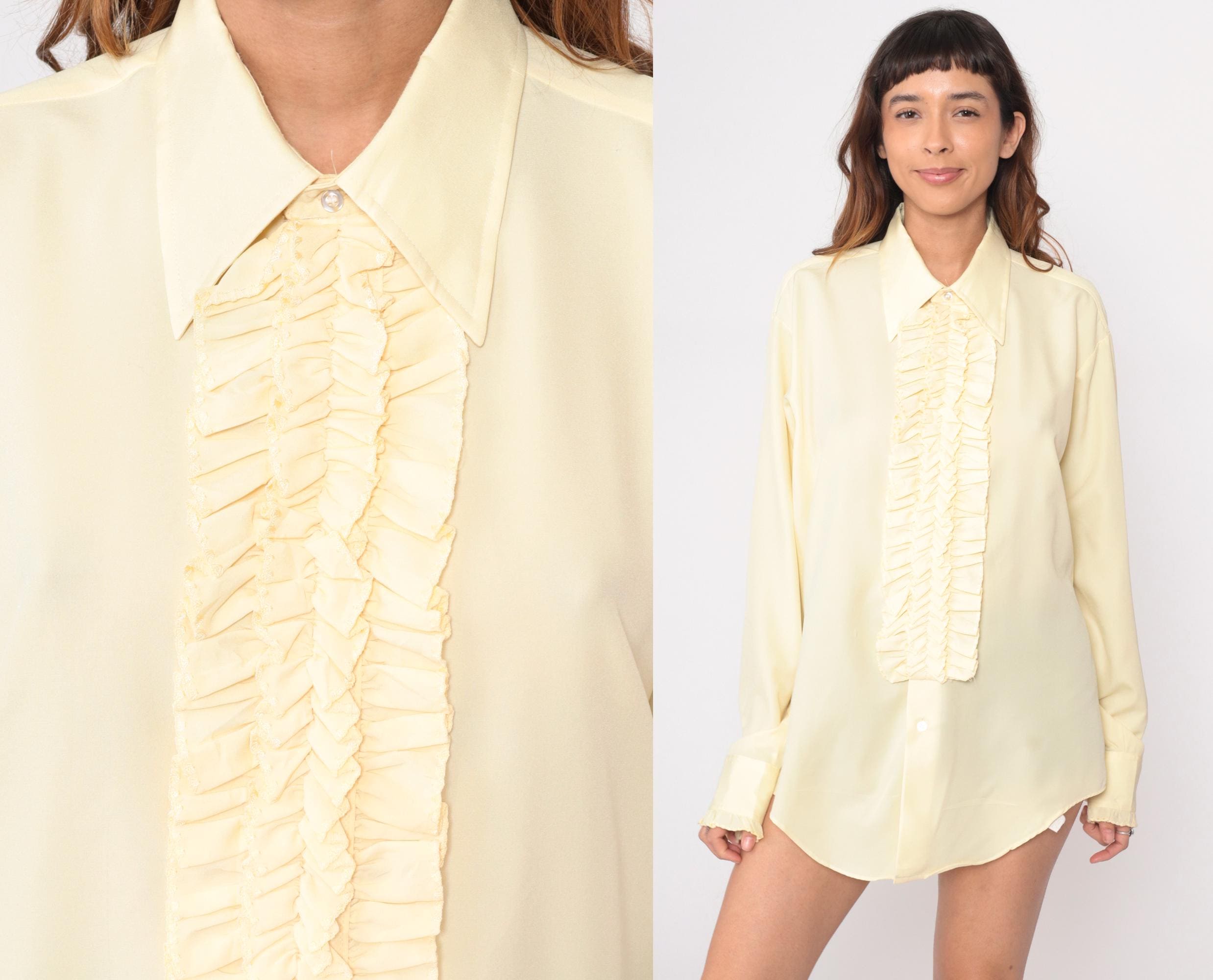 70s pale yellow shirt from Joe Namath Arrow Collar Man with wide pointed collar and ruffled front placket detail. Long sleeves with button cuffs, full button front closure with coordinating pale buttons.