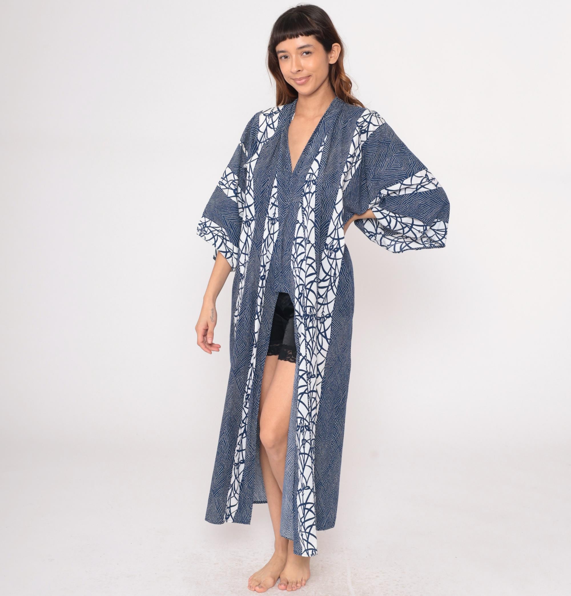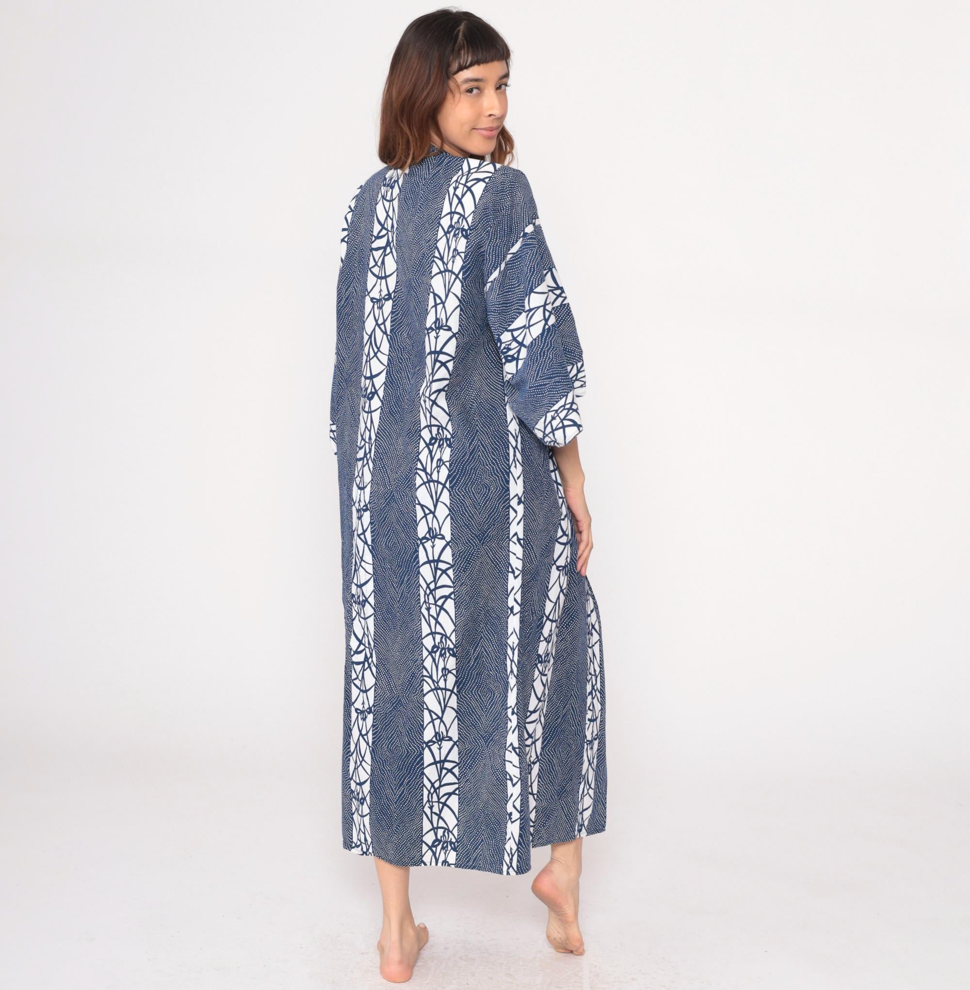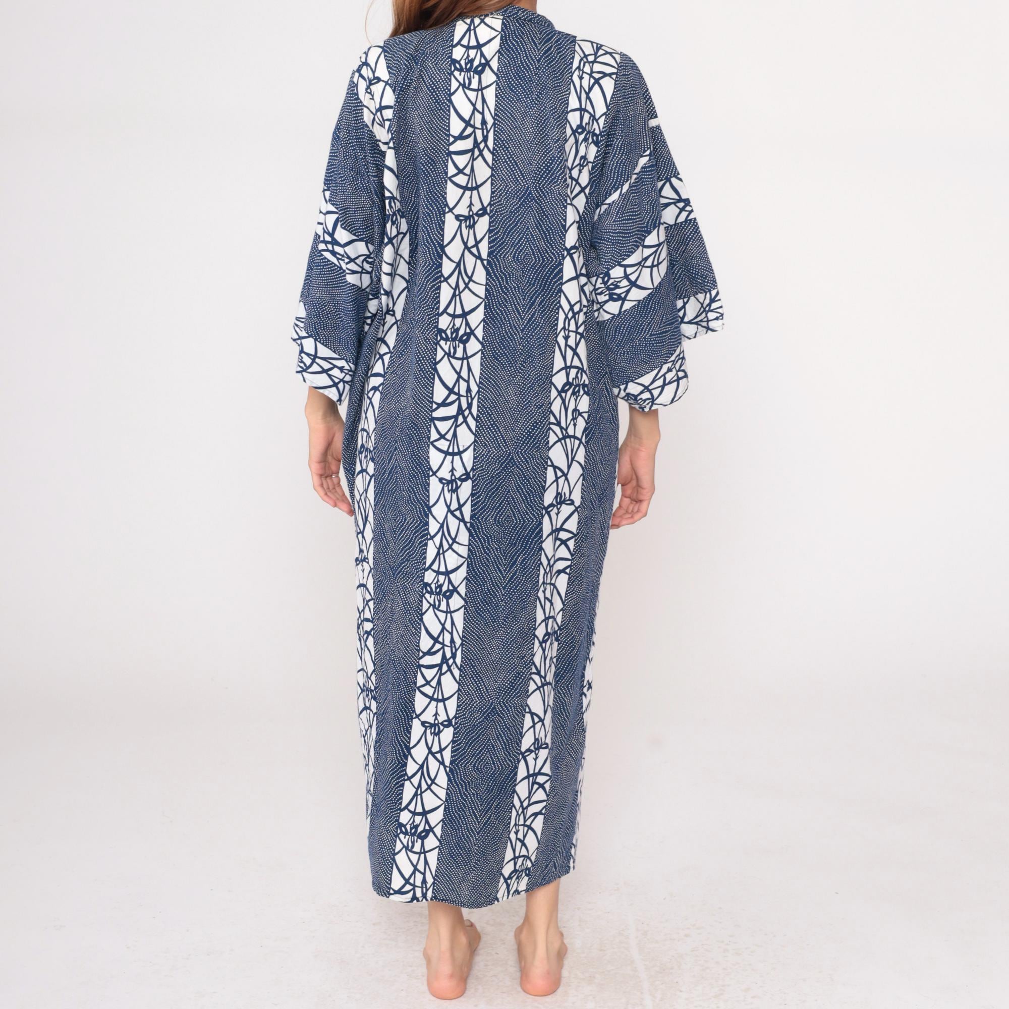 70s navy blue and white kimono robe with vertical stripe pattern alternating between geometric dotted chevrons and abstract organic designs. Open front with wide sleeves and floor-length silhouette.
