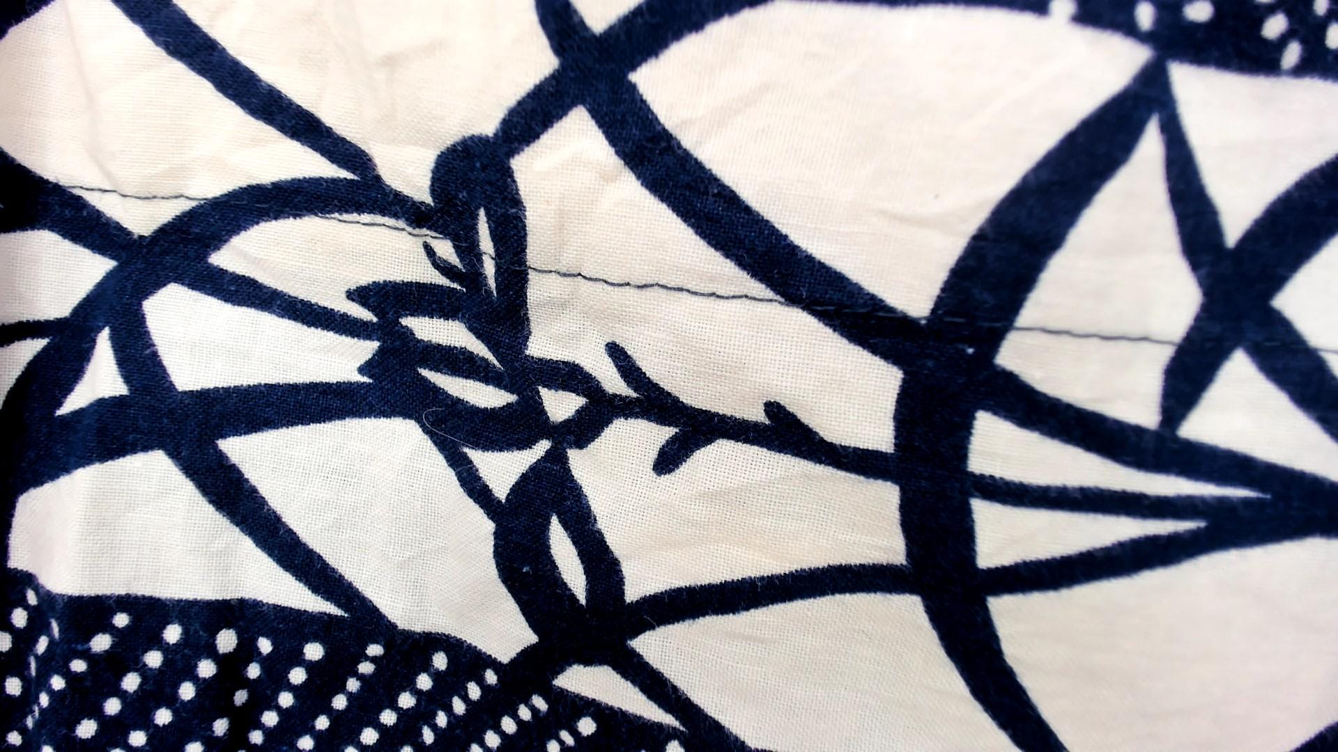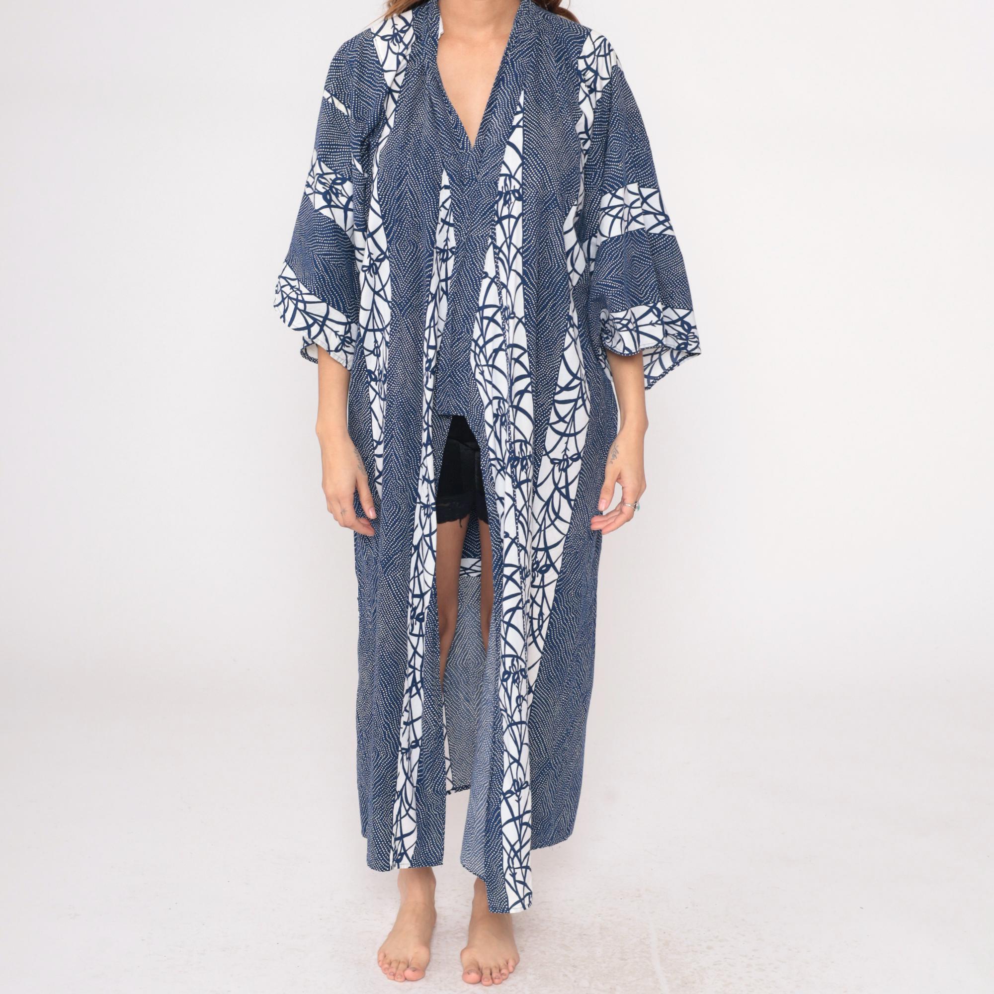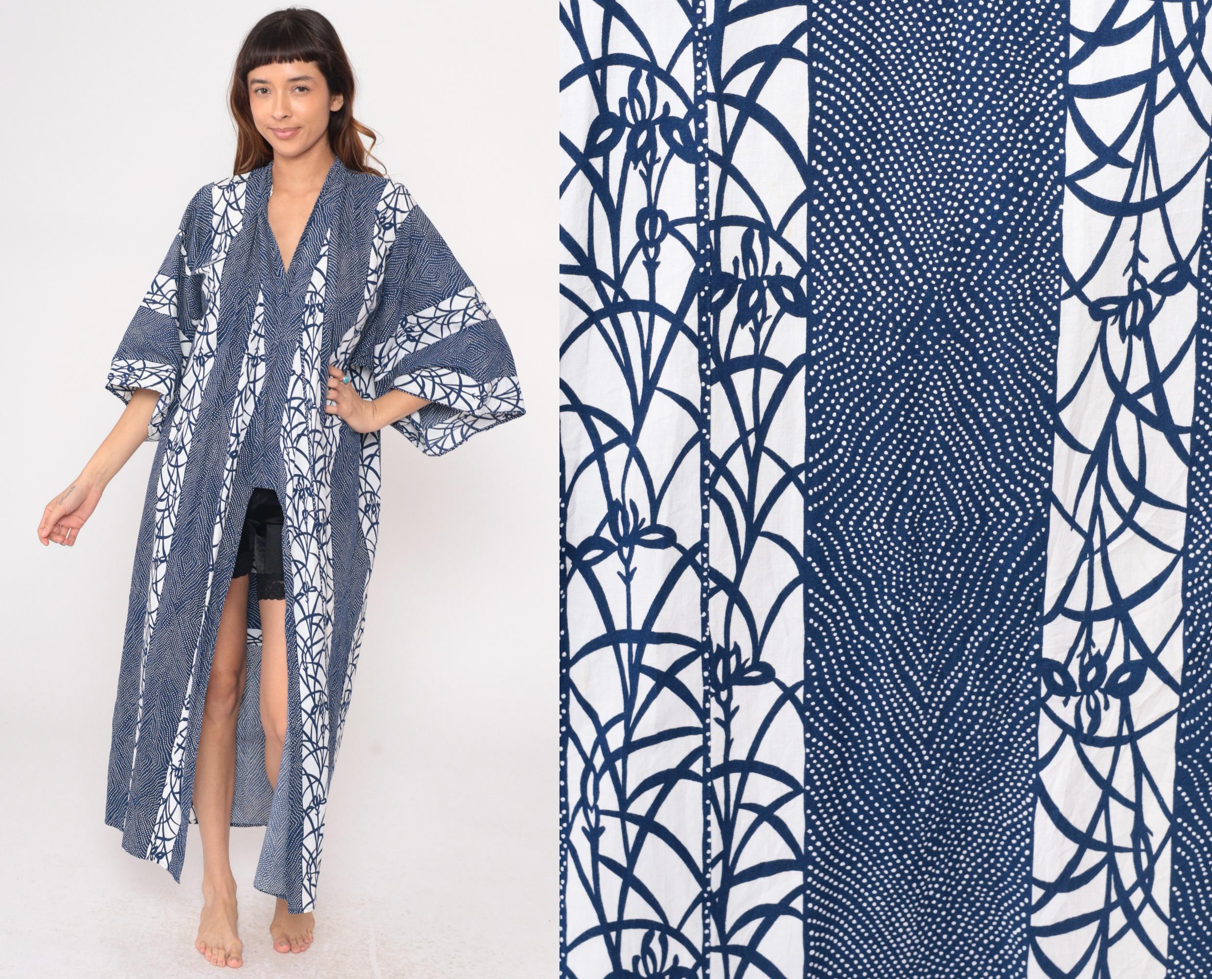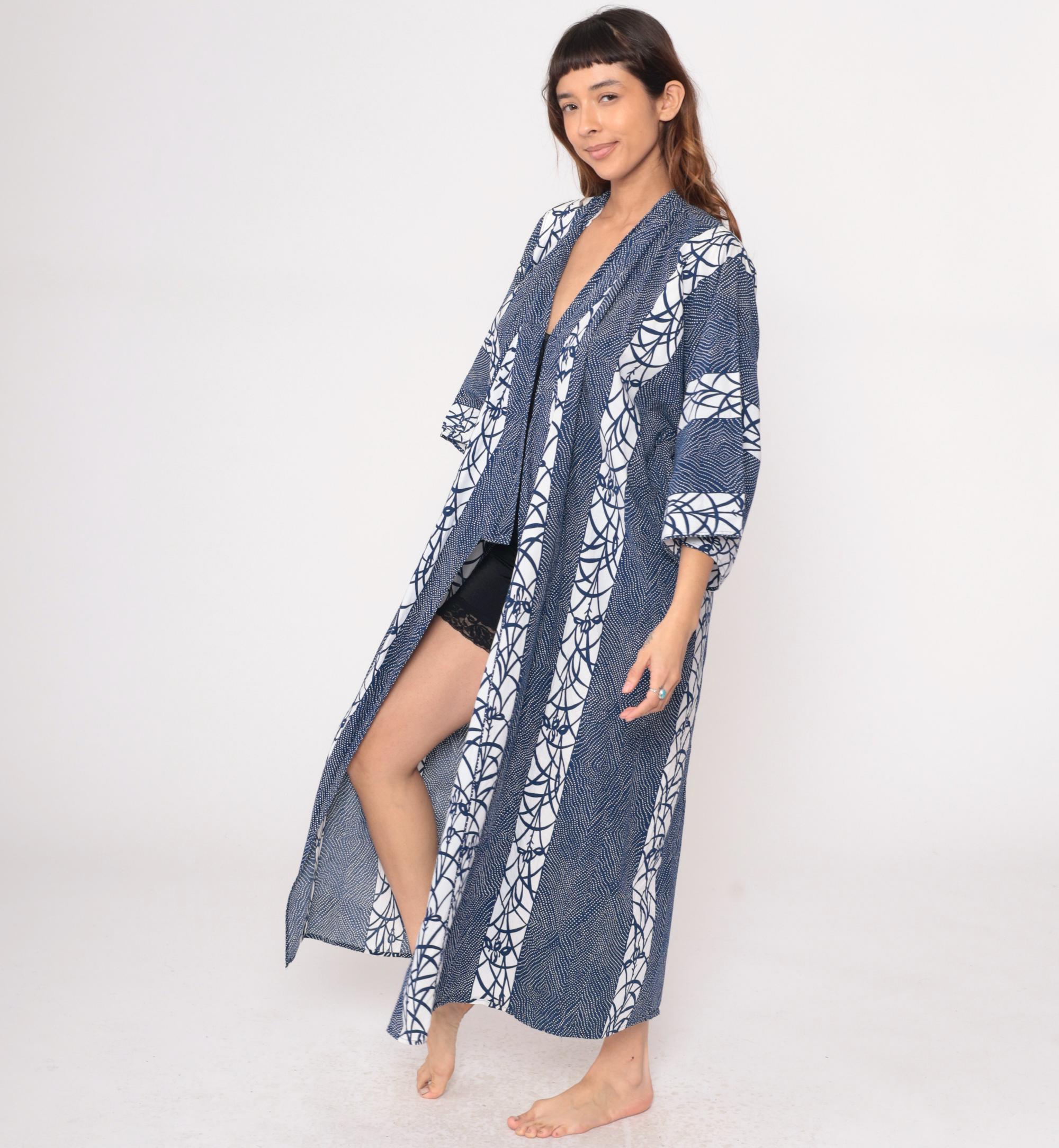 70s navy blue and white kimono robe with vertical stripe pattern alternating between geometric dotted chevrons and abstract organic designs. Open front with wide sleeves and floor-length silhouette.