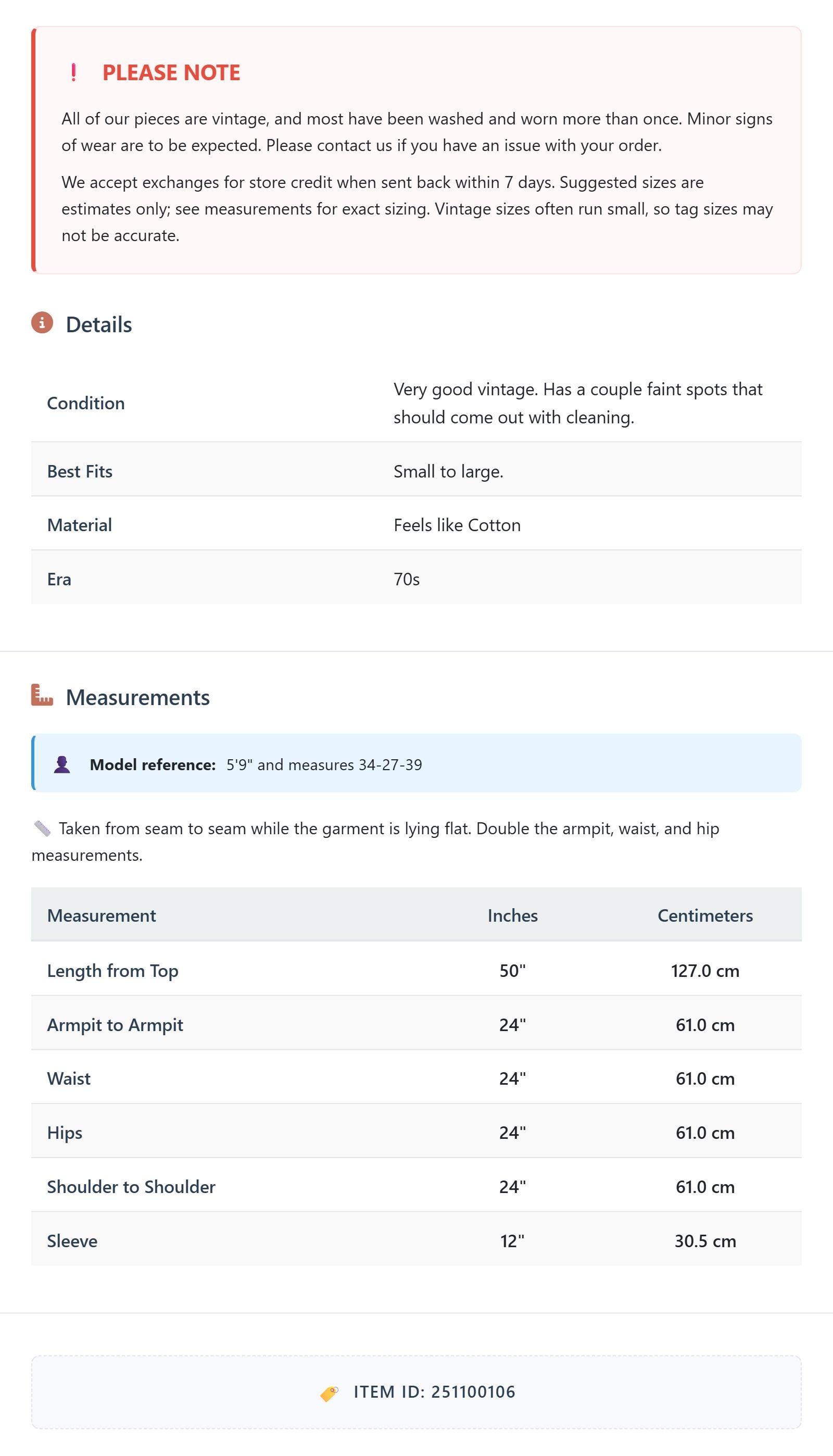 All of our pieces are vintage, and most have been washed and worn more than once. Minor signs of wear are to be expected. Please contact us if you have an issue with your order. We accept exchanges for store credit when sent back within 7 days.