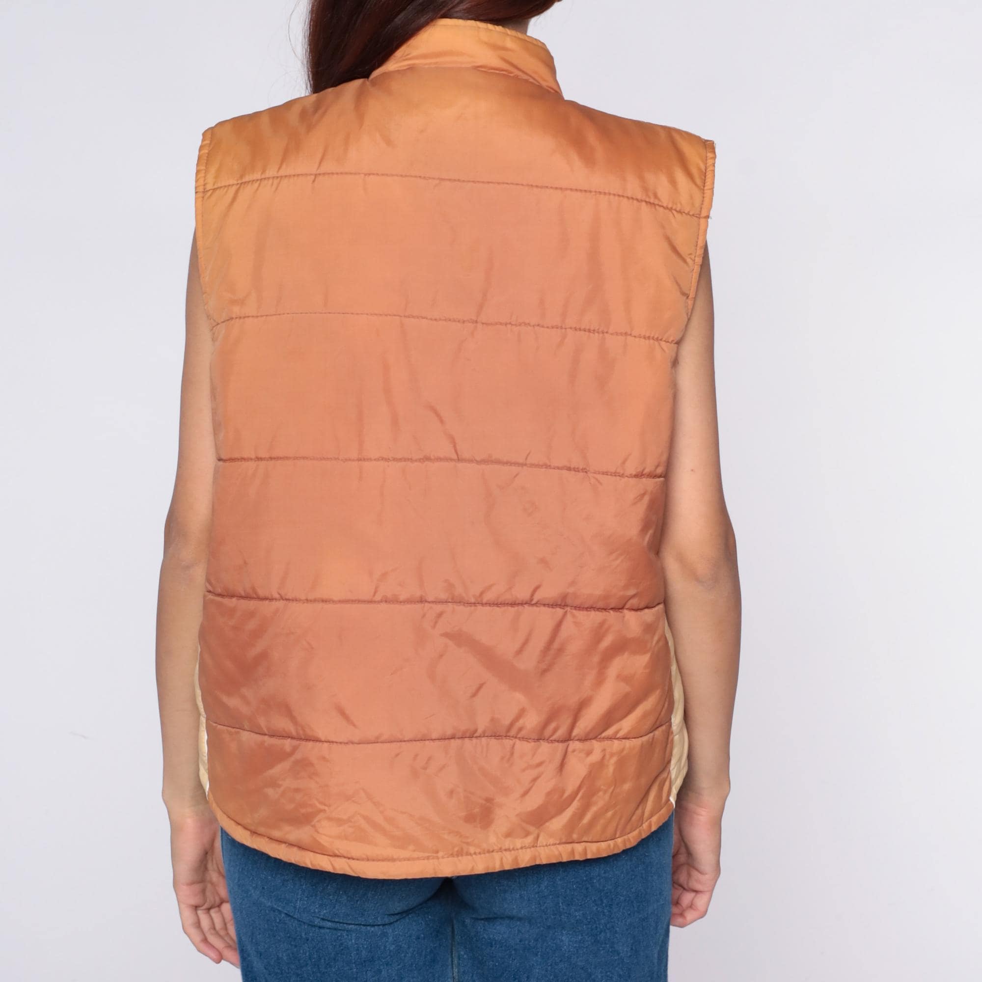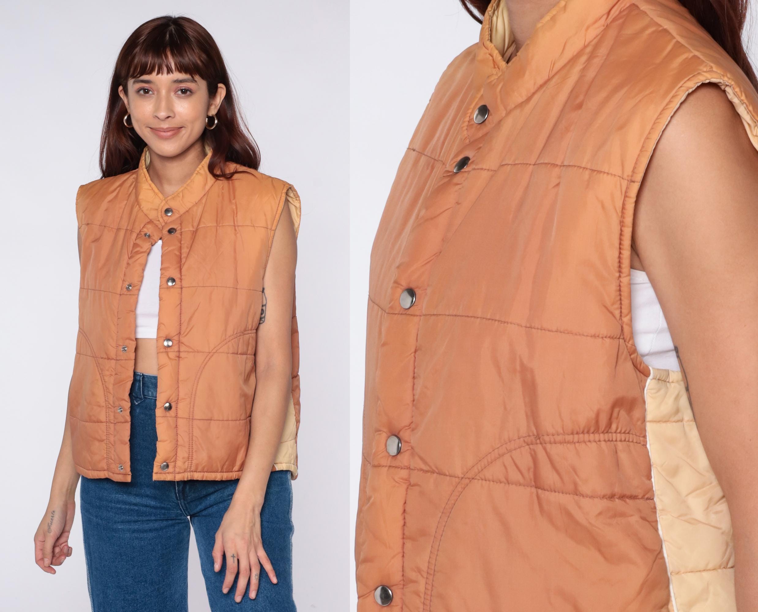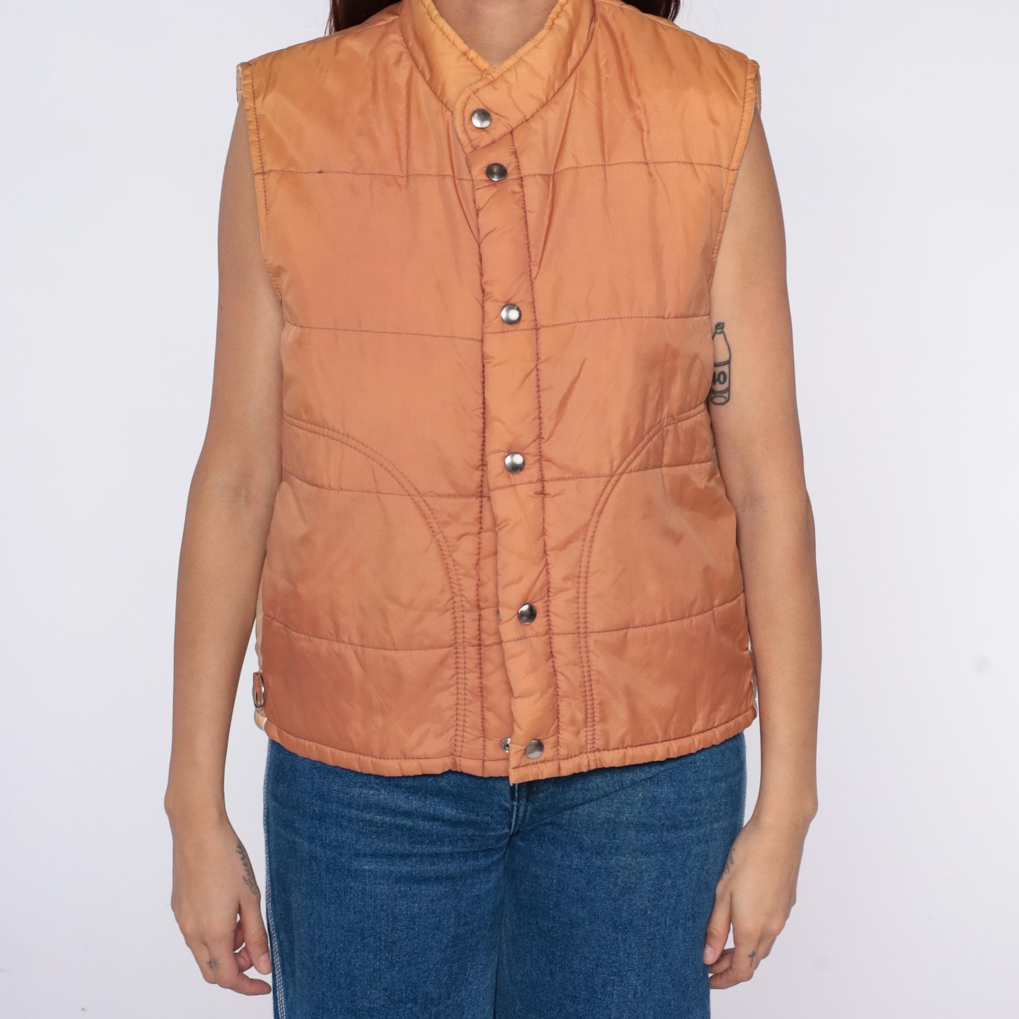 70s quilted vest from Sears in peach nylon with snap button front closure and stand collar. Horizontal quilting across body with curved decorative stitching, two front patch pockets, sleeveless construction.