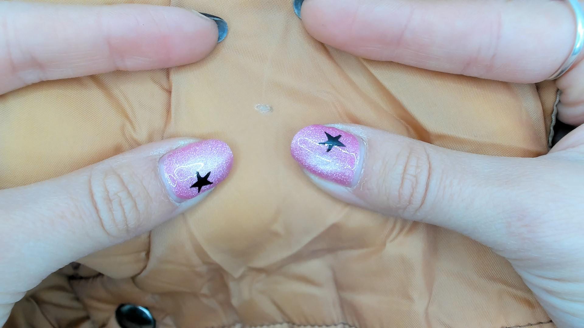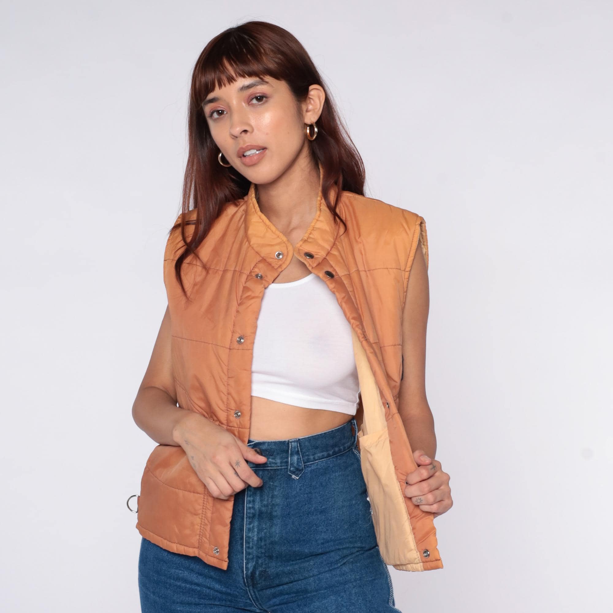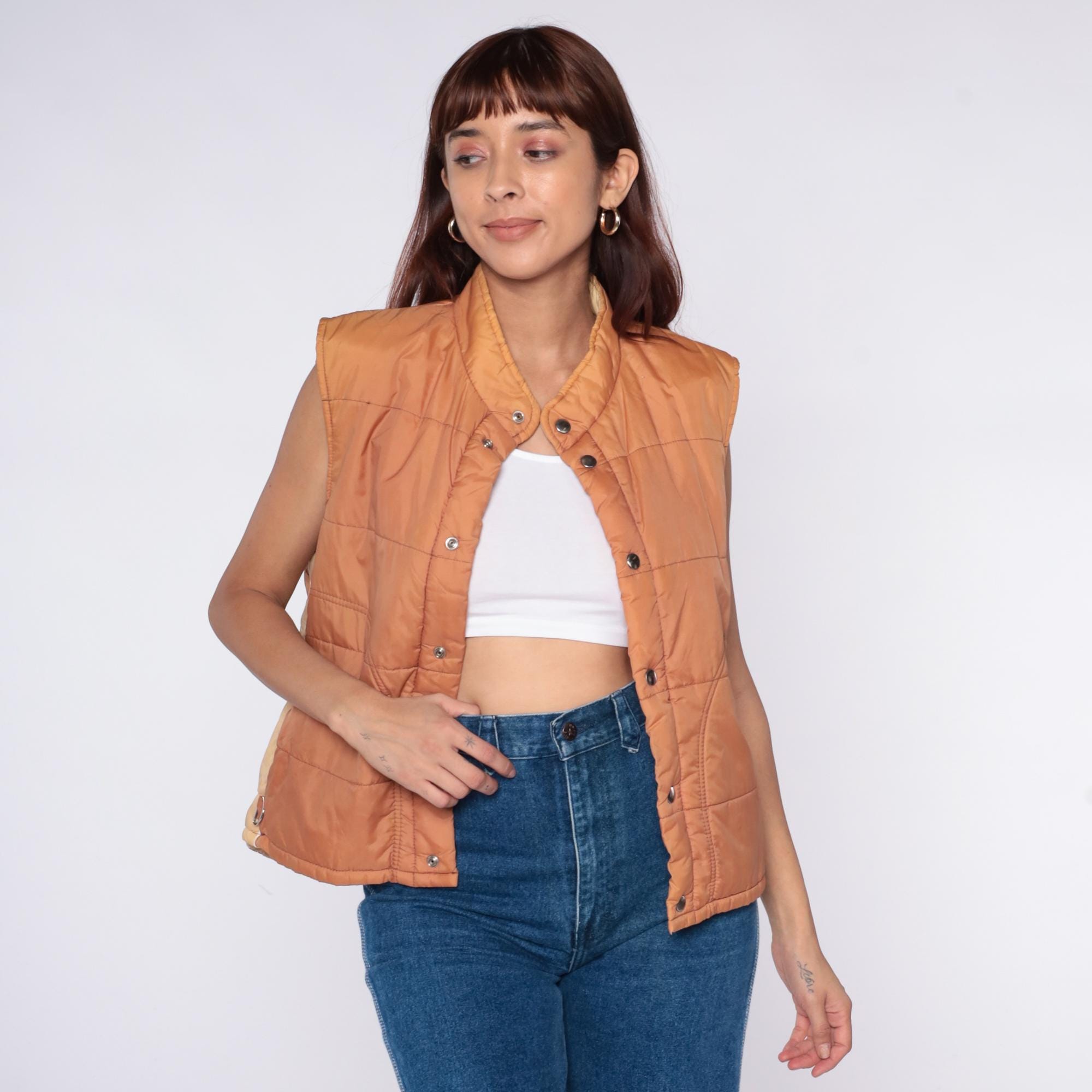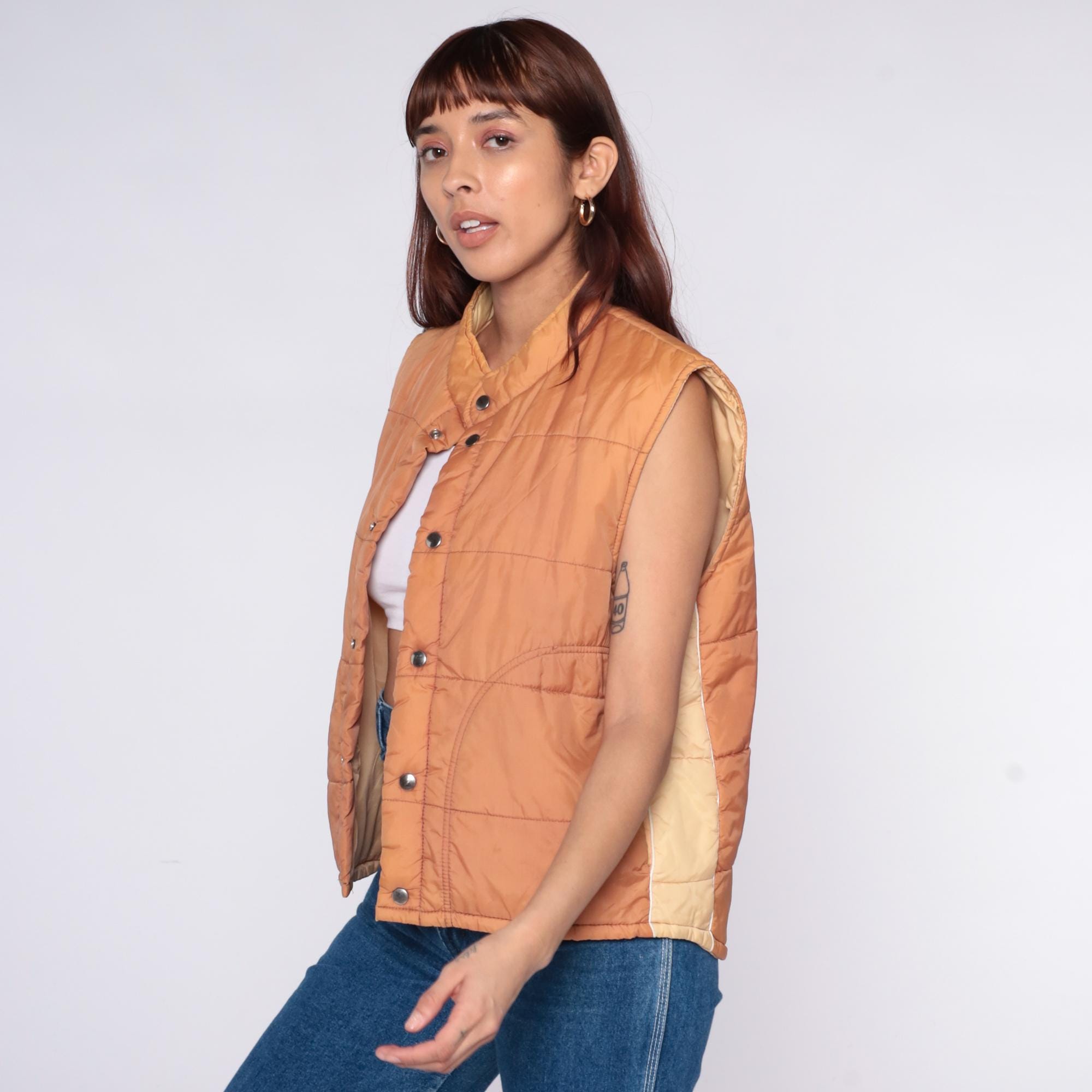 70s quilted vest from Sears in peach nylon with snap button front closure and stand collar. Horizontal quilting across body with curved decorative stitching, two front patch pockets, sleeveless construction.