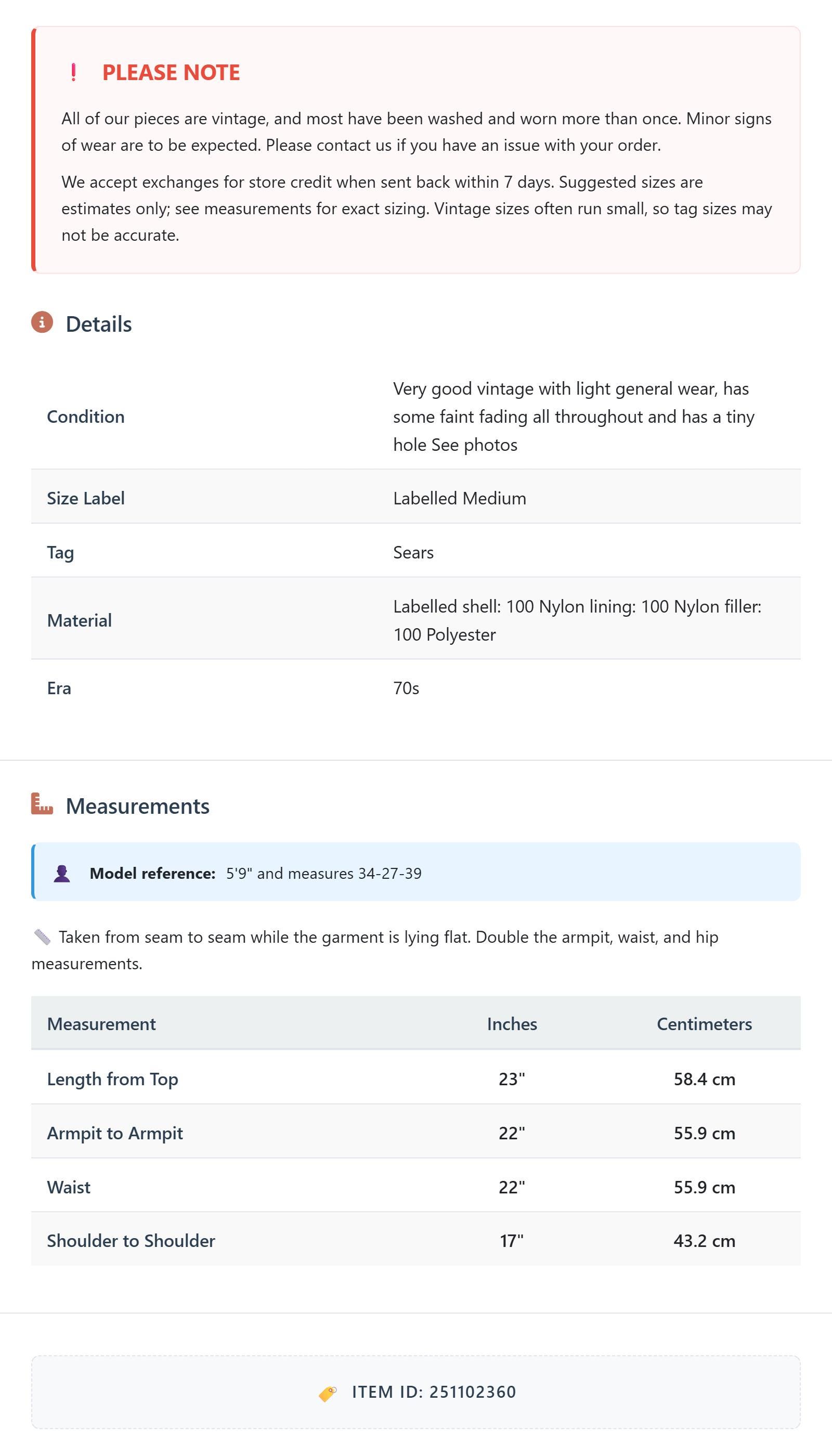 All of our pieces are vintage, and most have been washed and worn more than once. Minor signs of wear are to be expected. Please contact us if you have an issue with your order. We accept exchanges for store credit when sent back within 7 days.