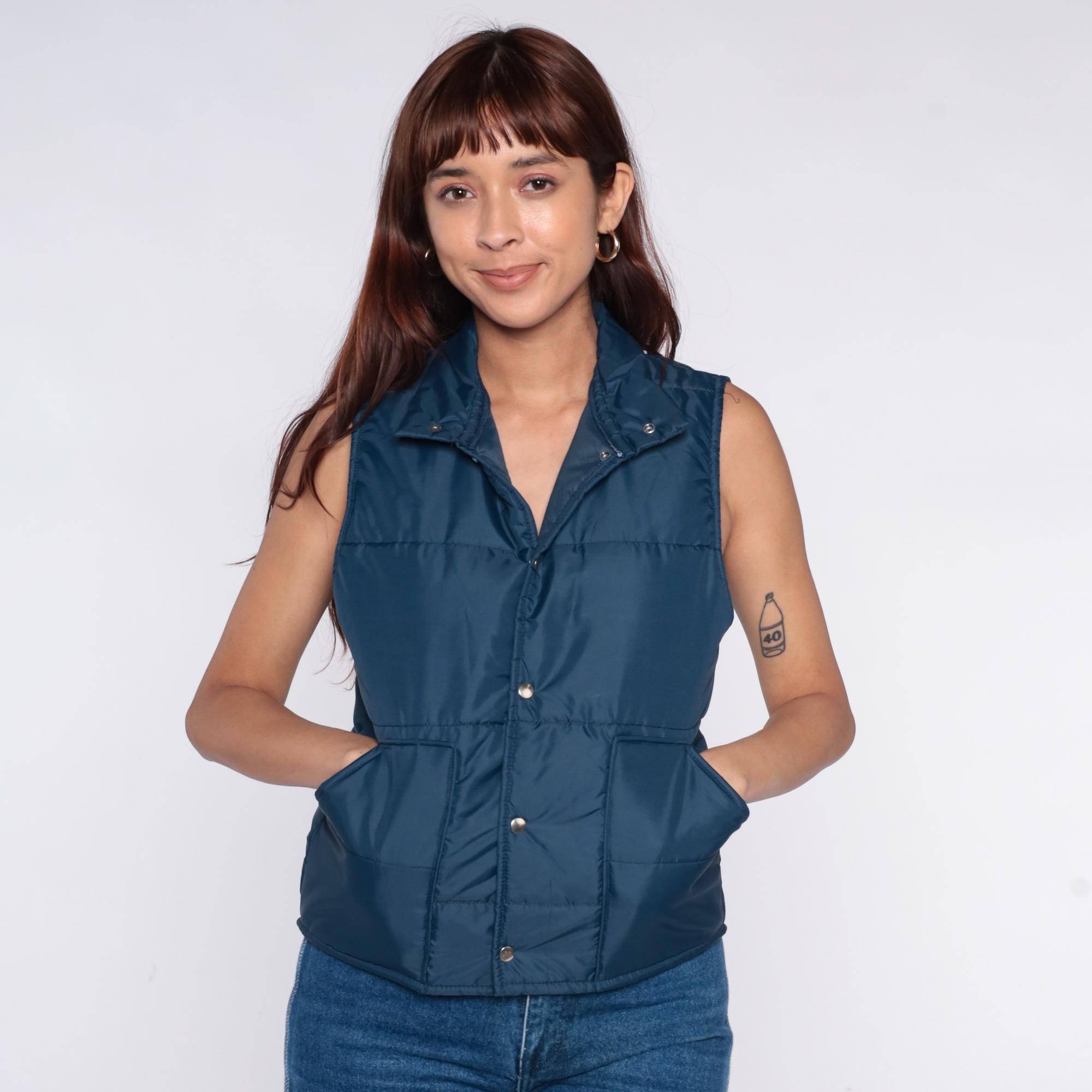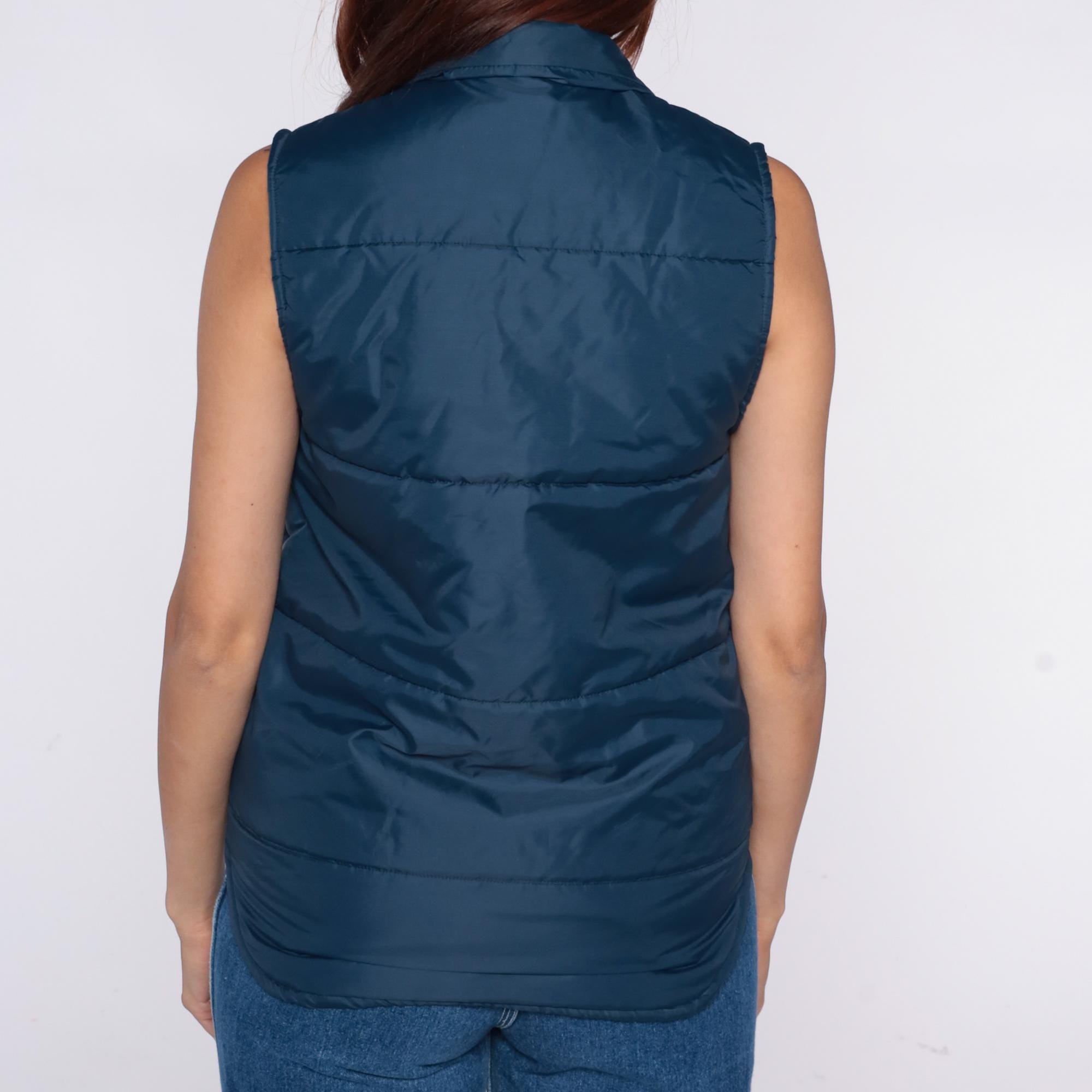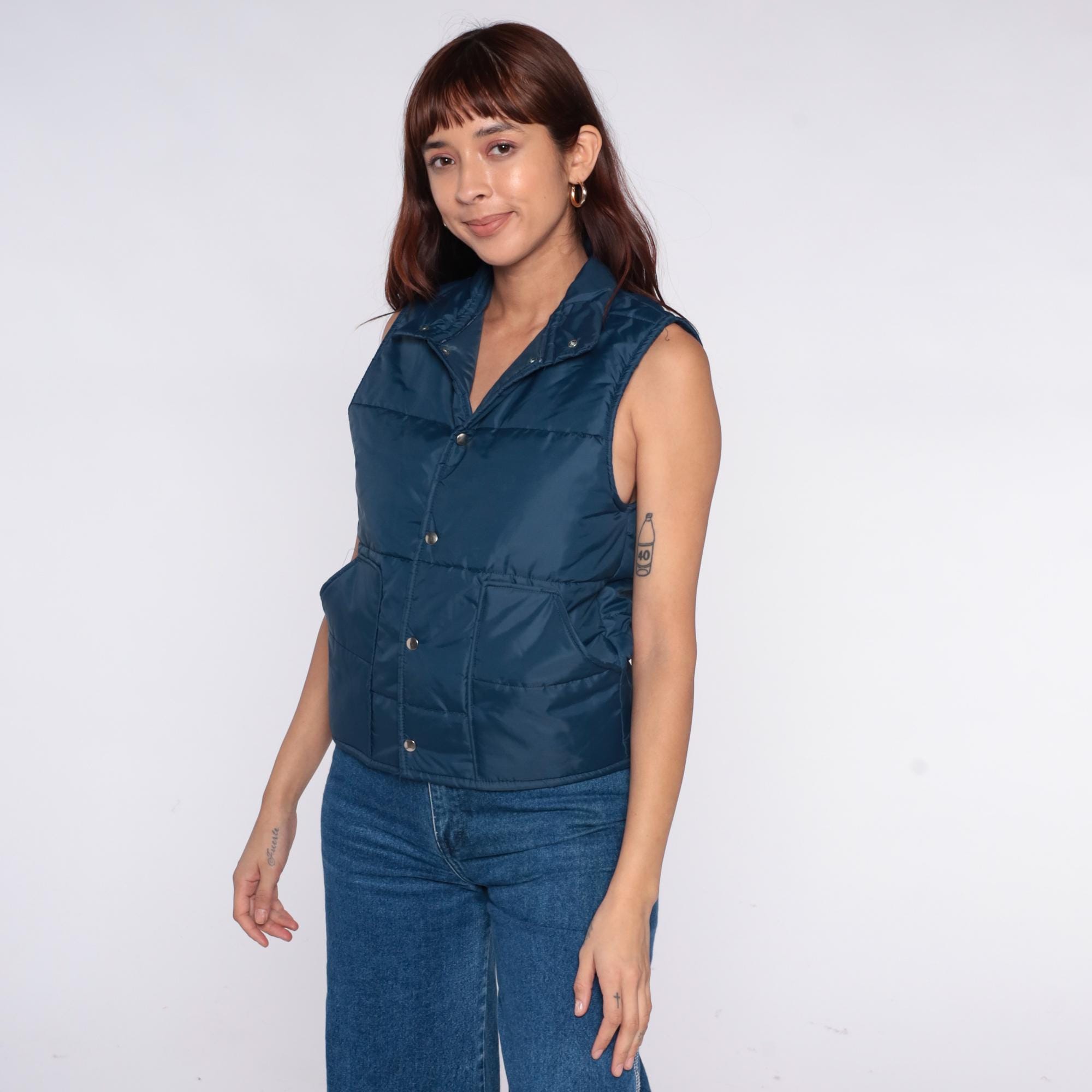70s teal quilted vest from Pla-Jac by Dunbrooke with collared neckline and snap button front closure. Sleeveless with two front patch pockets and horizontal quilted panels throughout.