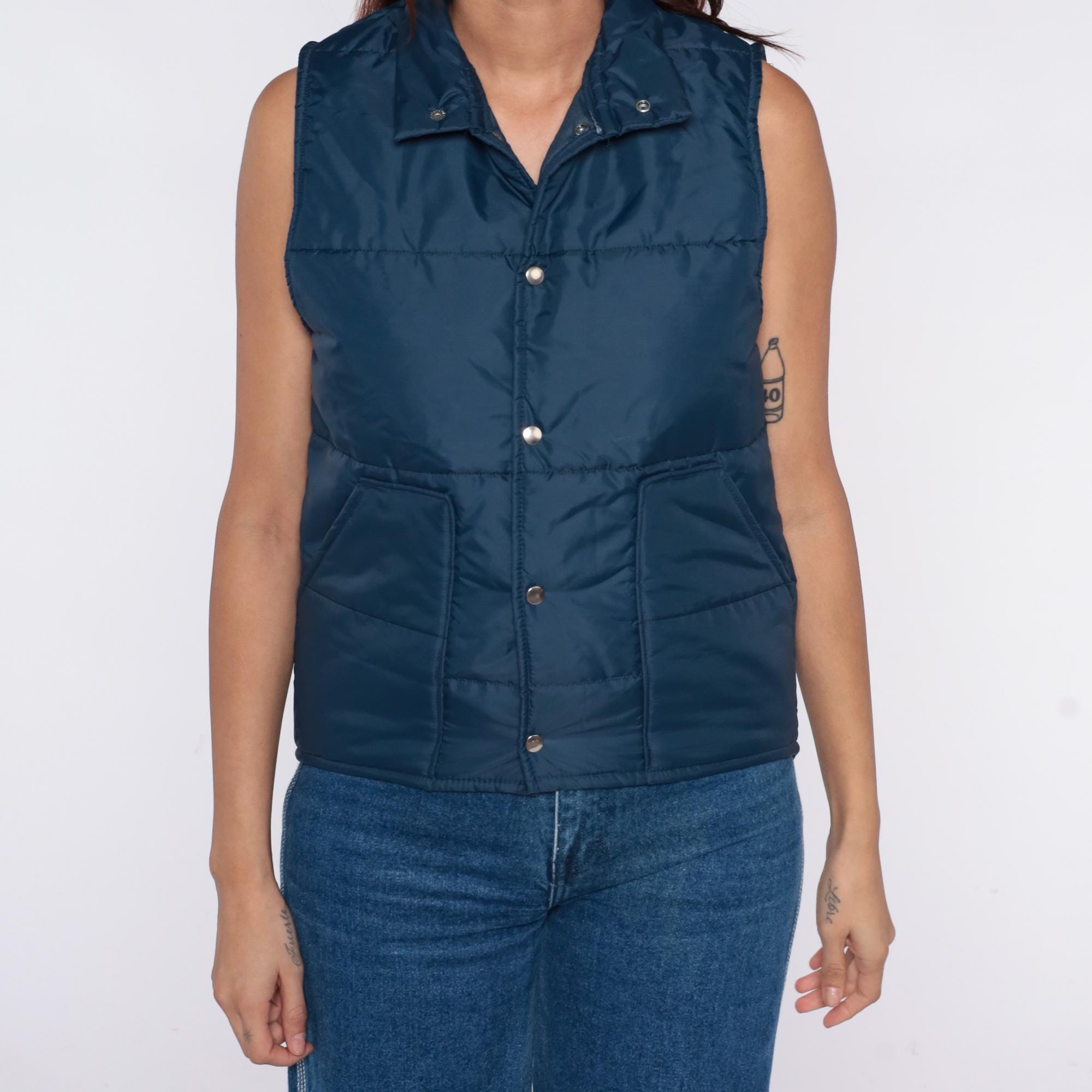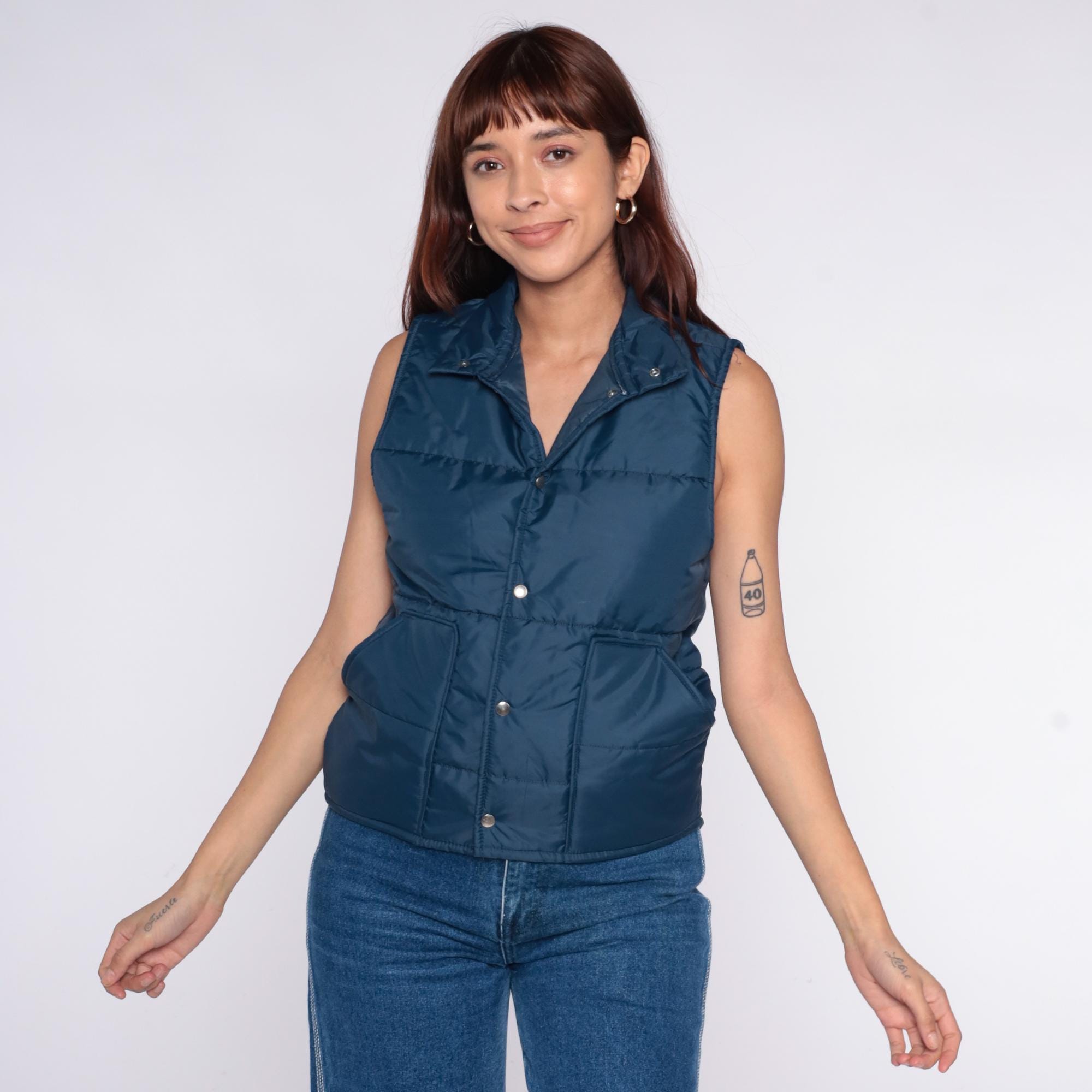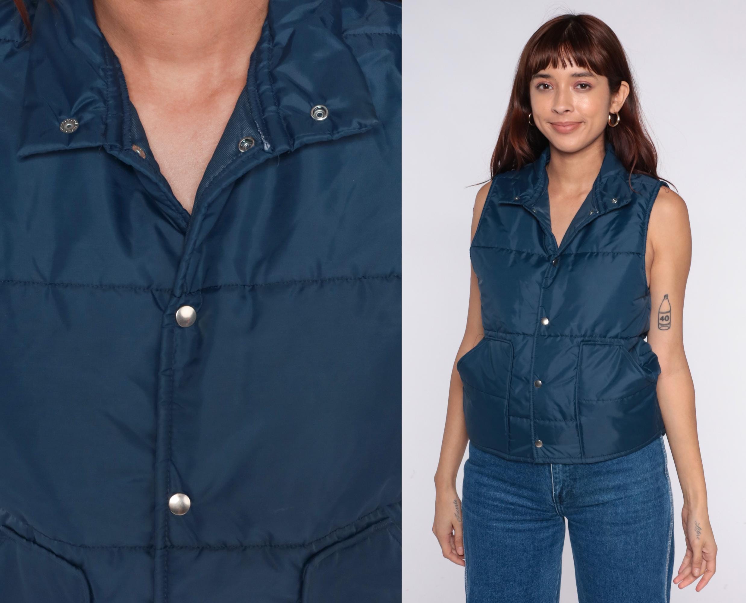 70s teal quilted vest from Pla-Jac by Dunbrooke with collared neckline and snap button front closure. Sleeveless with two front patch pockets and horizontal quilted panels throughout.
