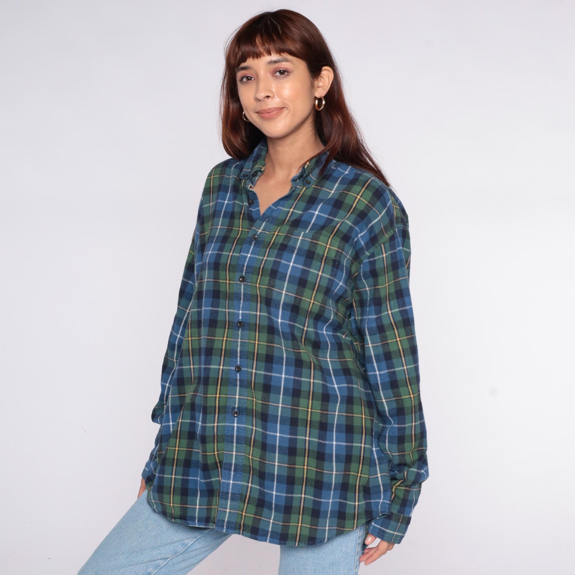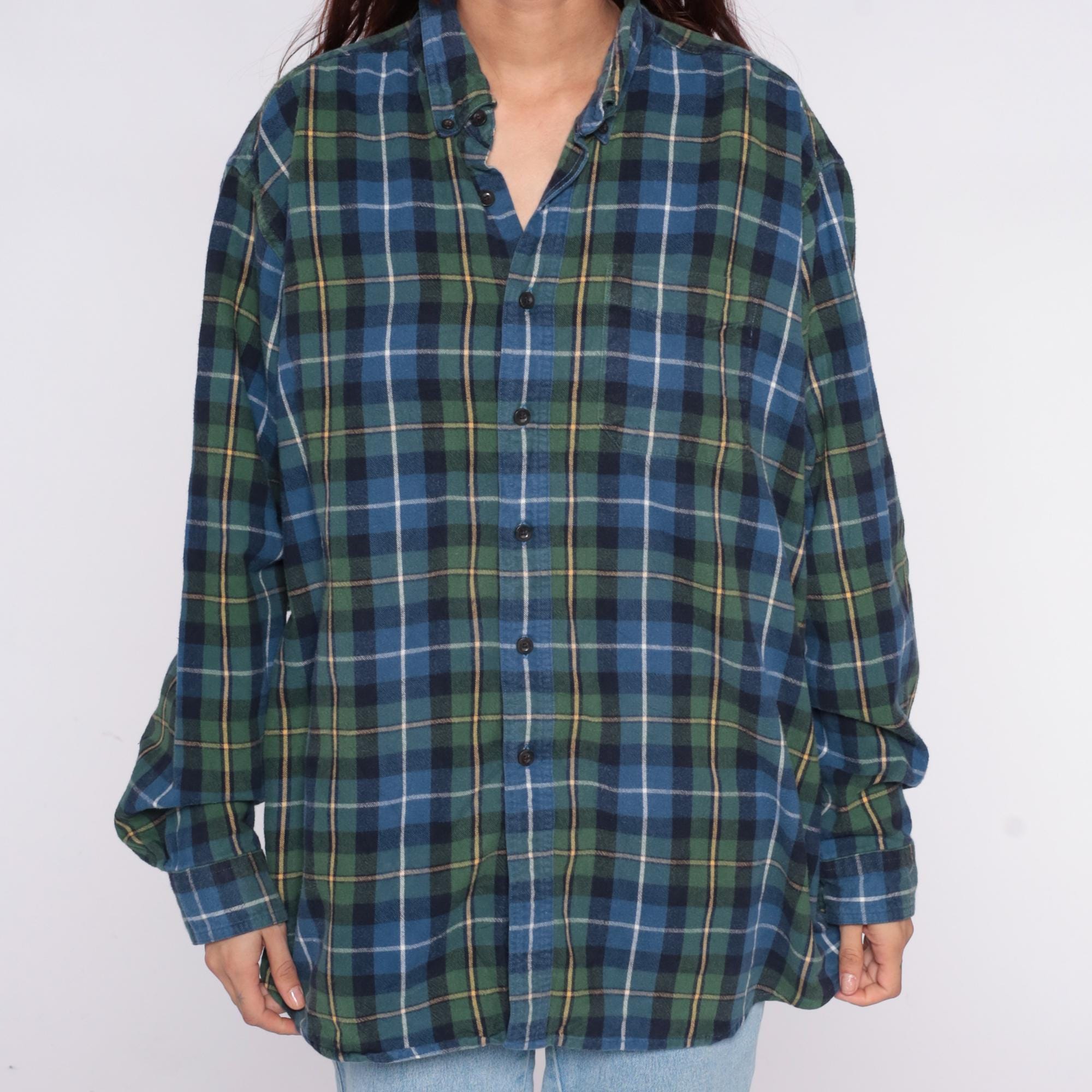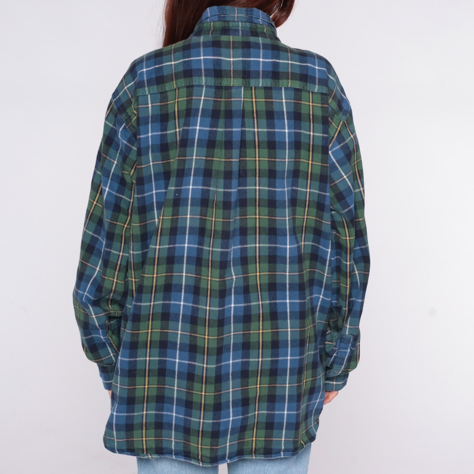 90s green, blue, yellow, and white plaid flannel shirt from LL Bean with button front closure and collar. Long sleeves with button cuffs, chest pocket.