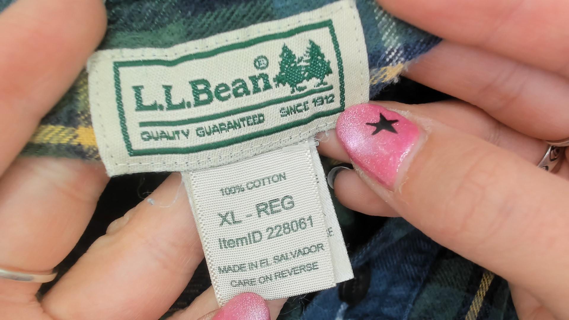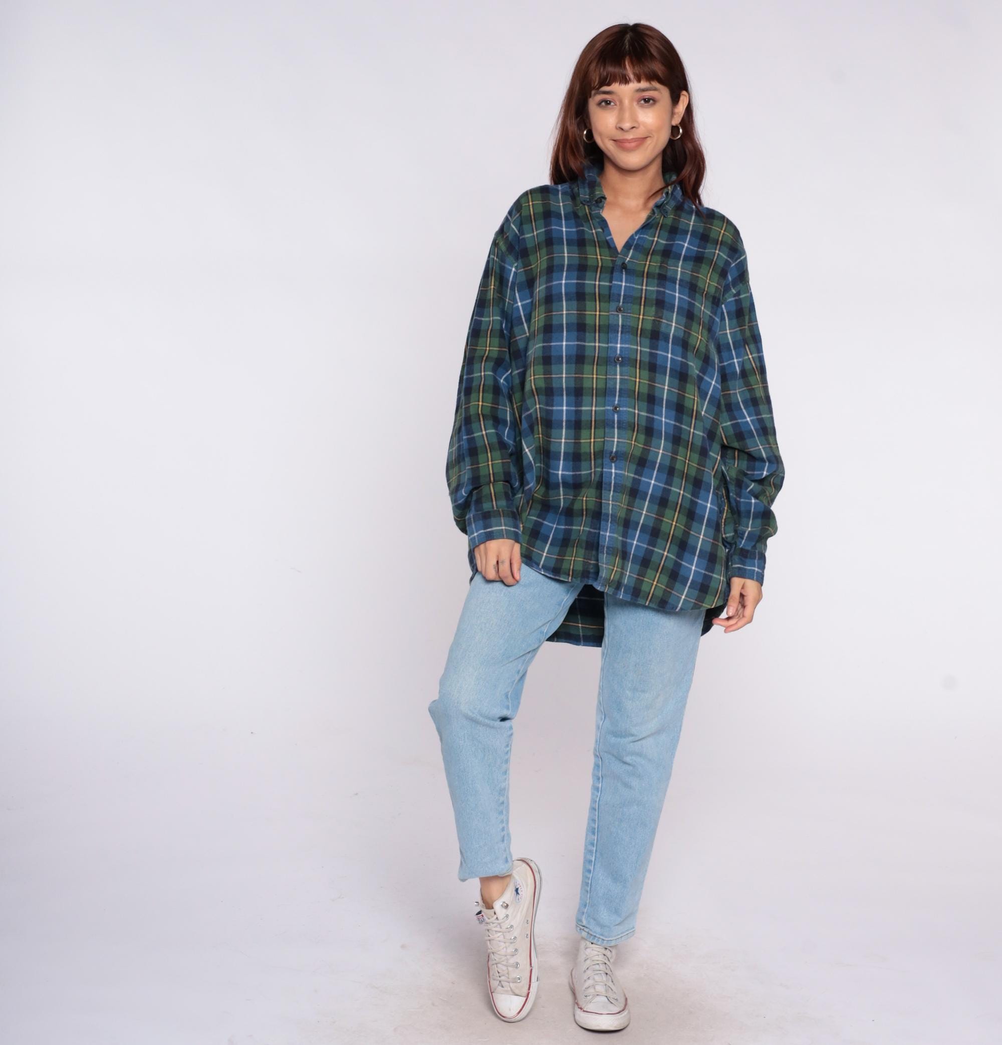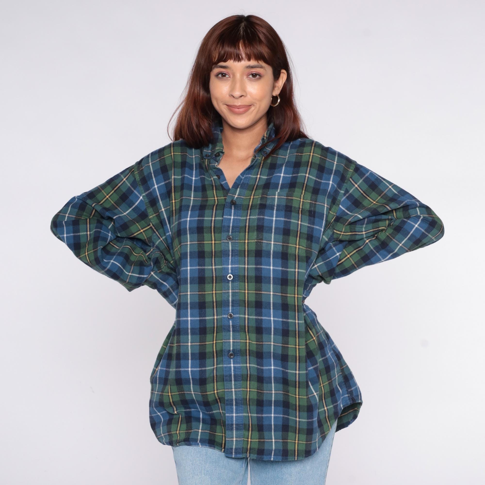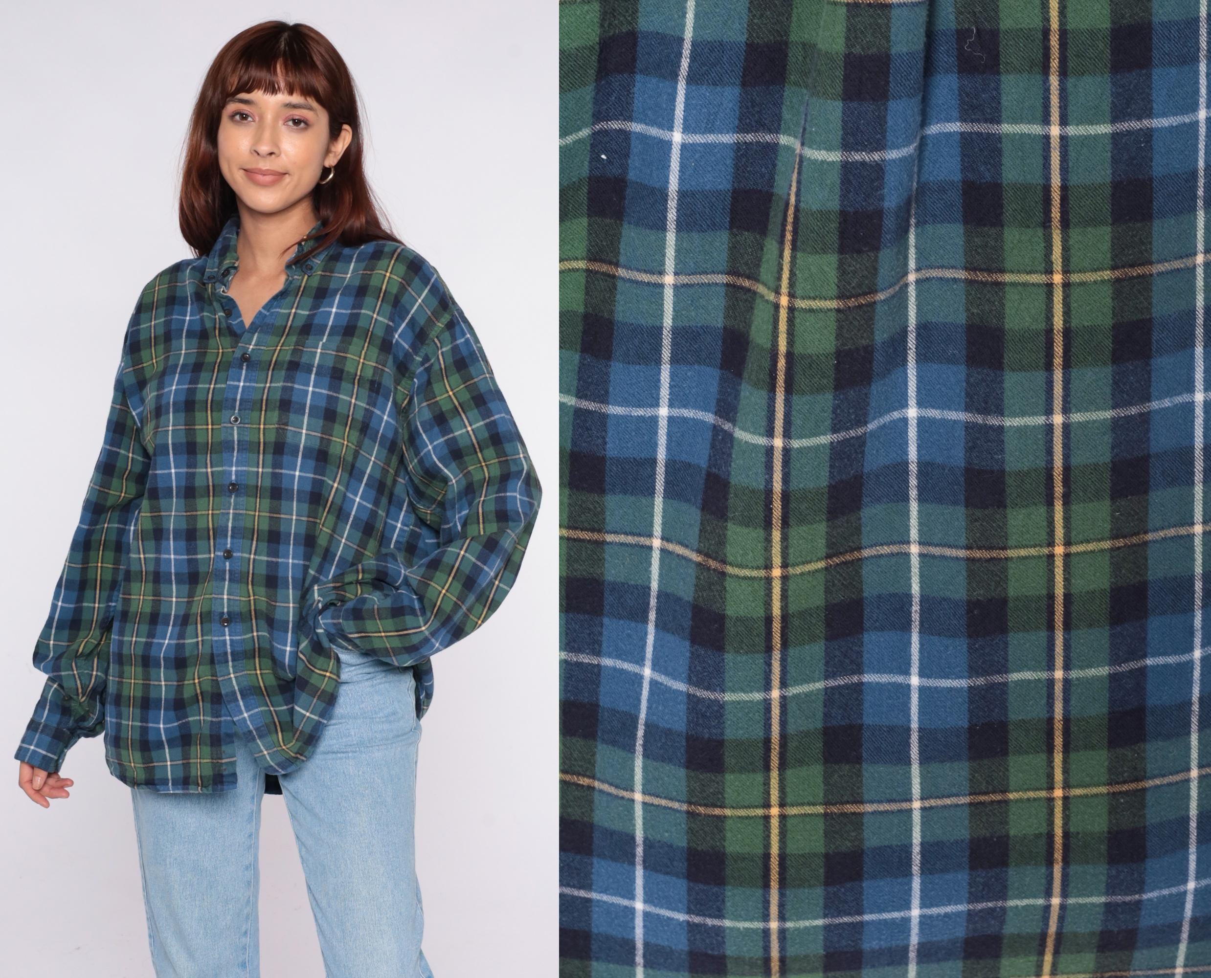 90s green, blue, yellow, and white plaid flannel shirt from LL Bean with button front closure and collar. Long sleeves with button cuffs, chest pocket.