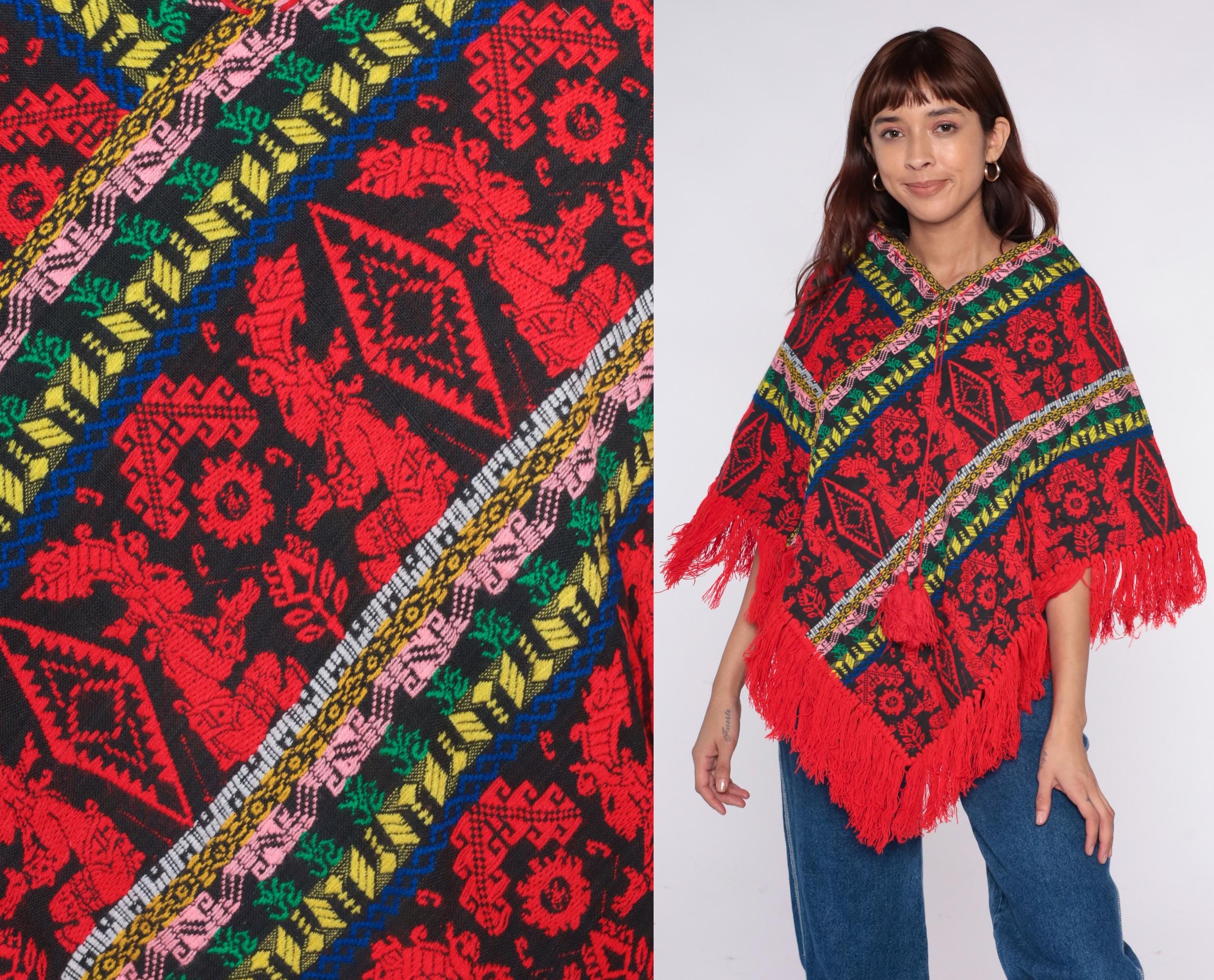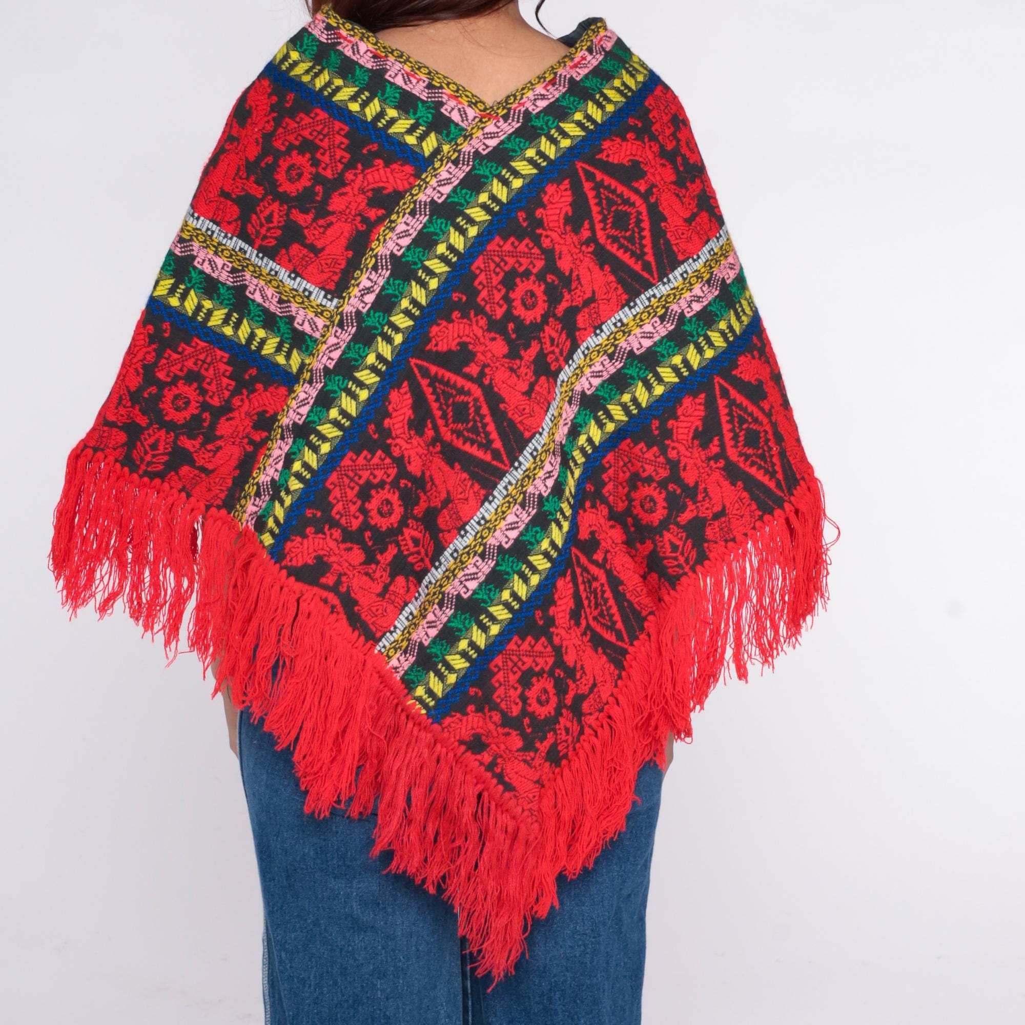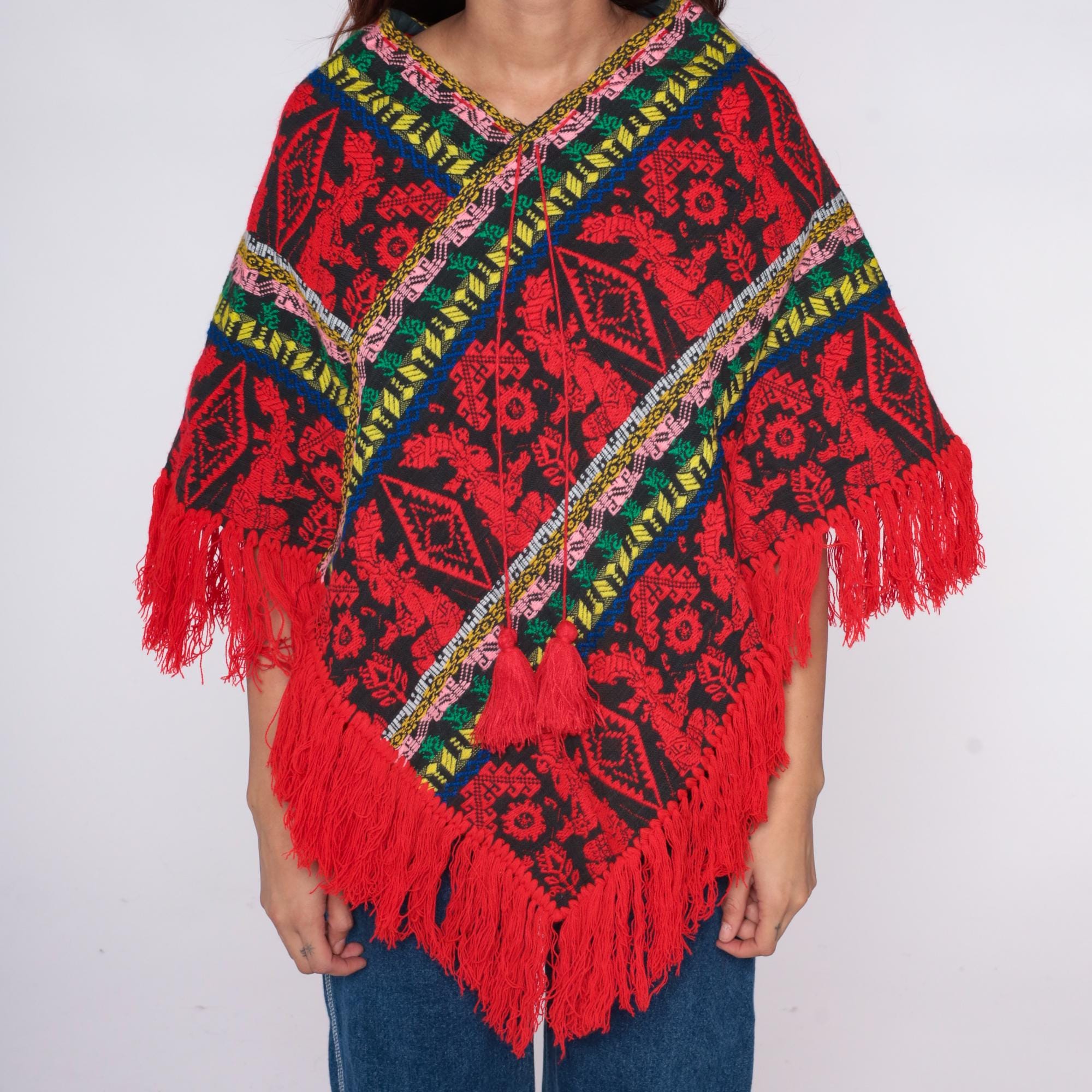 90s red and black poncho with geometric and floral pattern throughout. Multicolor striped trim in pink, yellow, green, and blue along edges and v-neckline.