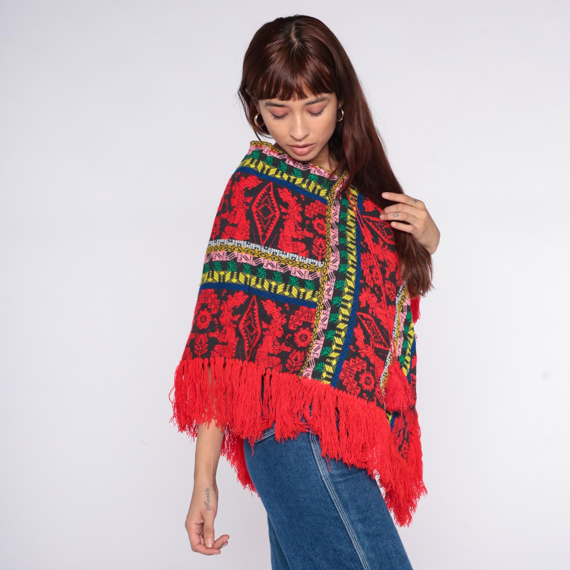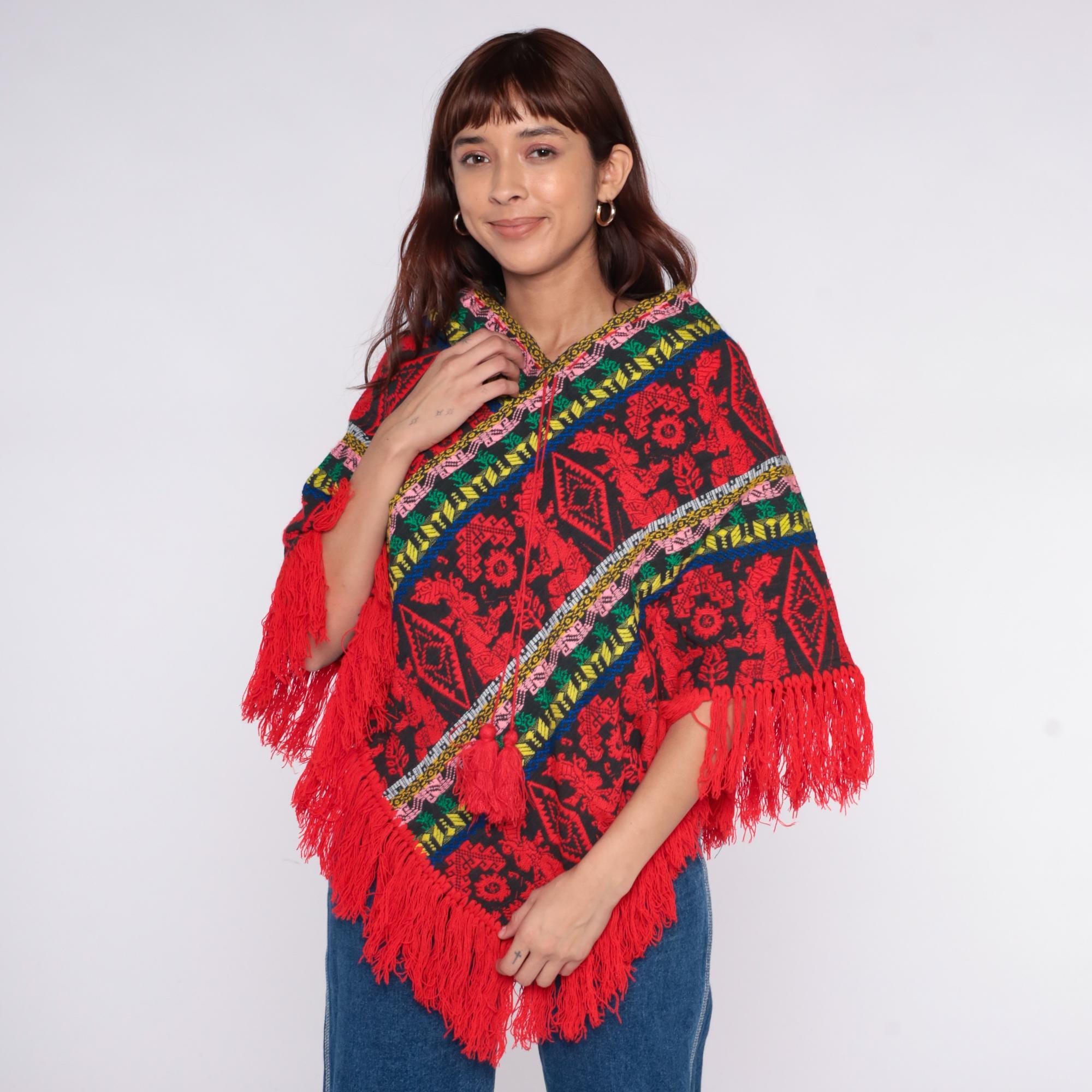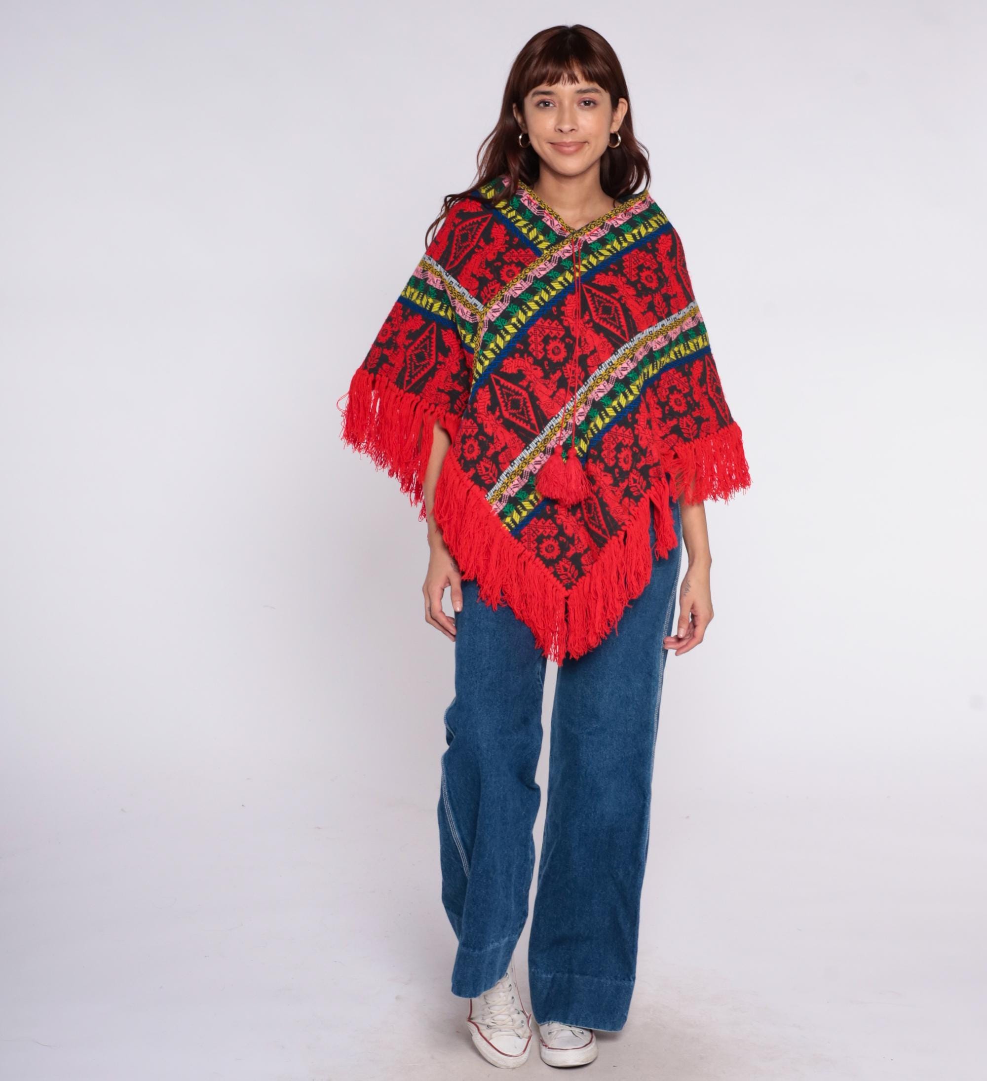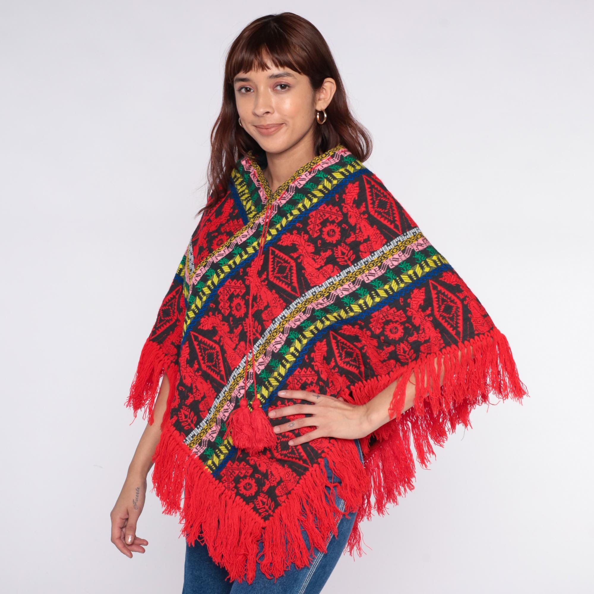 90s red and black poncho with geometric and floral pattern throughout. Multicolor striped trim in pink, yellow, green, and blue along edges and v-neckline.