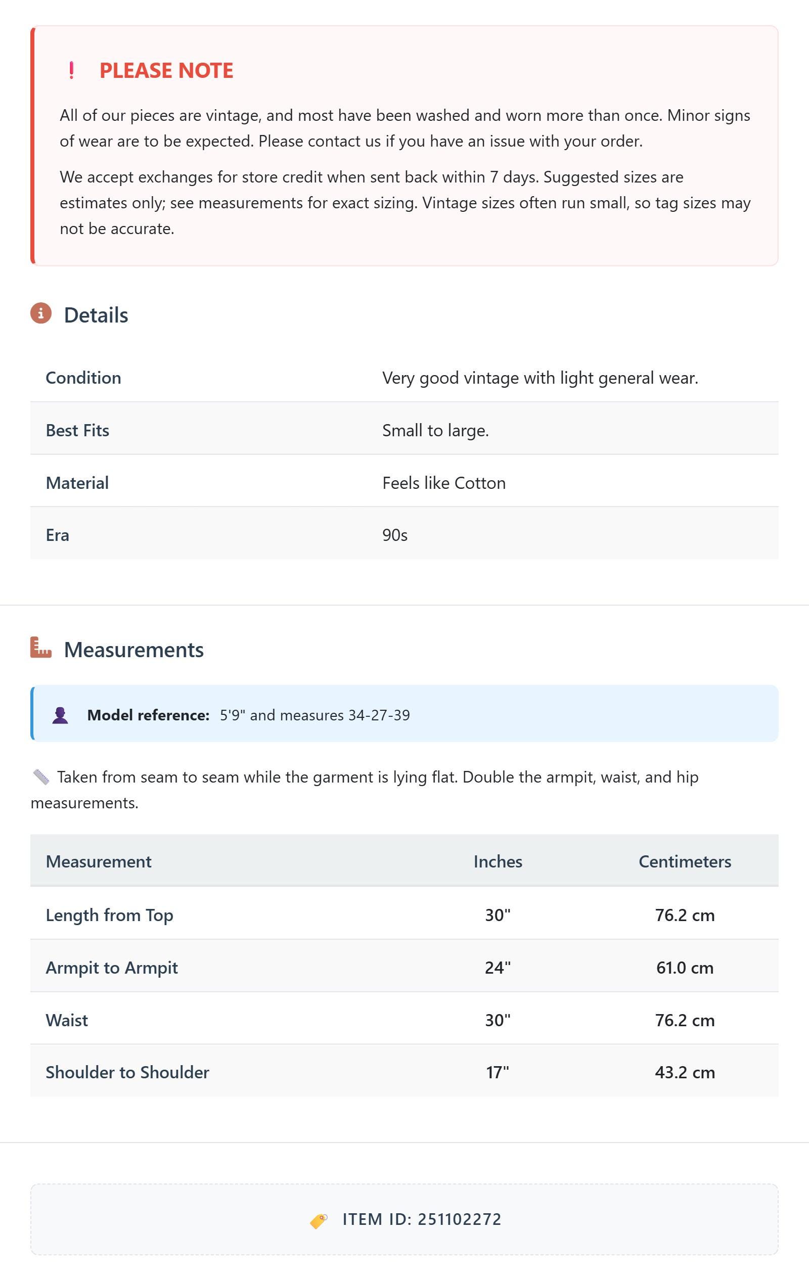 All of our pieces are vintage, and most have been washed and worn more than once. Minor signs of wear are to be expected. Please contact us if you have an issue with your order. We accept exchanges for store credit when sent back within 7 days.