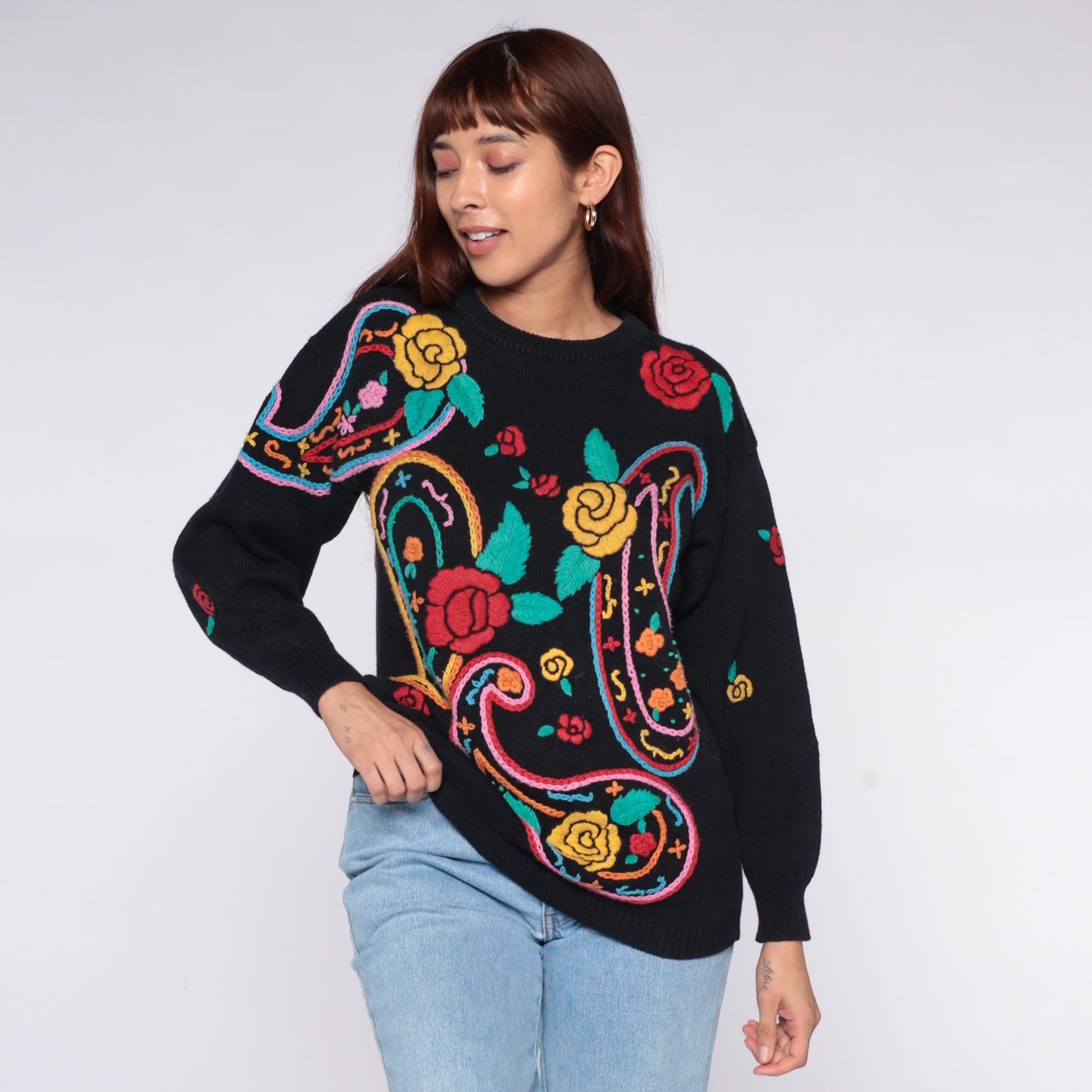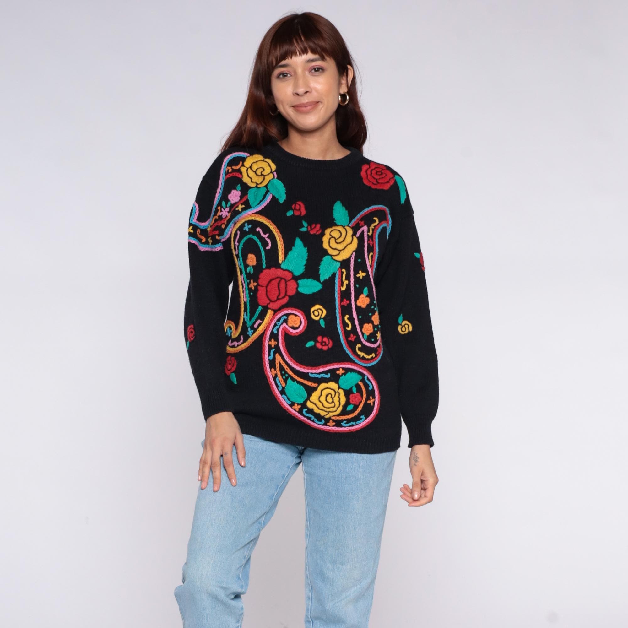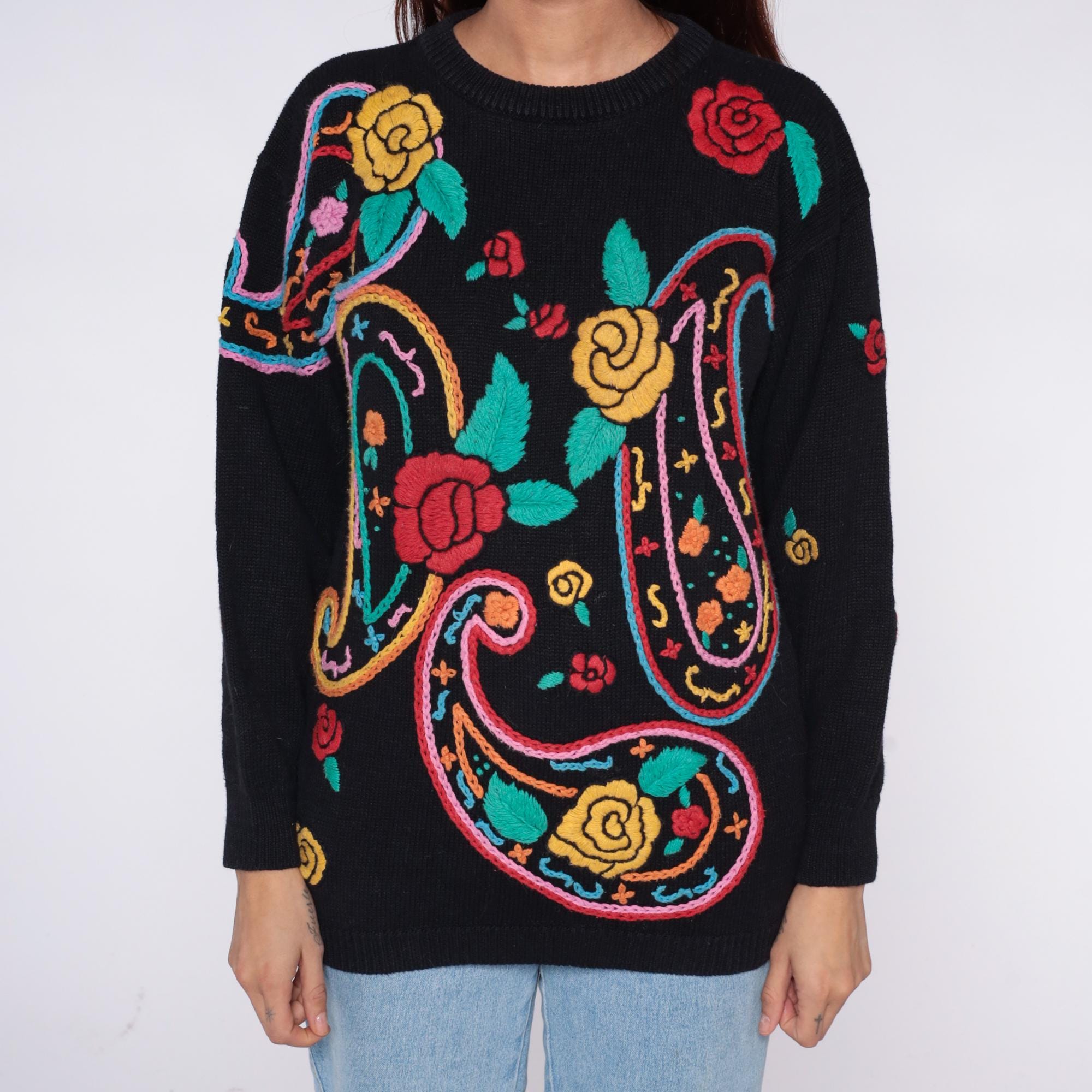 90s black knit sweater from Western Connection with elaborate multicolor embroidered design featuring snakes with paisley pattern interiors and floral motifs. Red, yellow, pink, and orange roses with turquoise leaves scattered across front and sleeves, with blue, pink, orange, and yellow embroidered snake outlines throughout. Crew neckline and long sleeves with ribbed cuffs and hem.