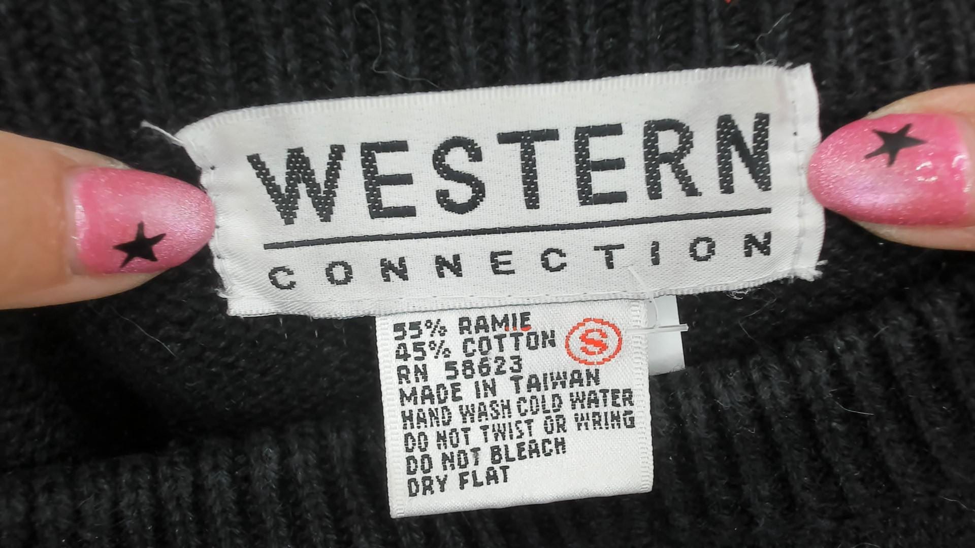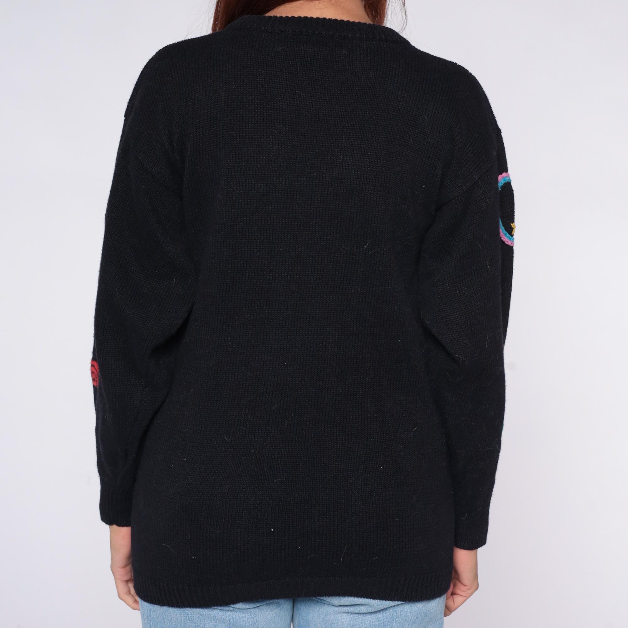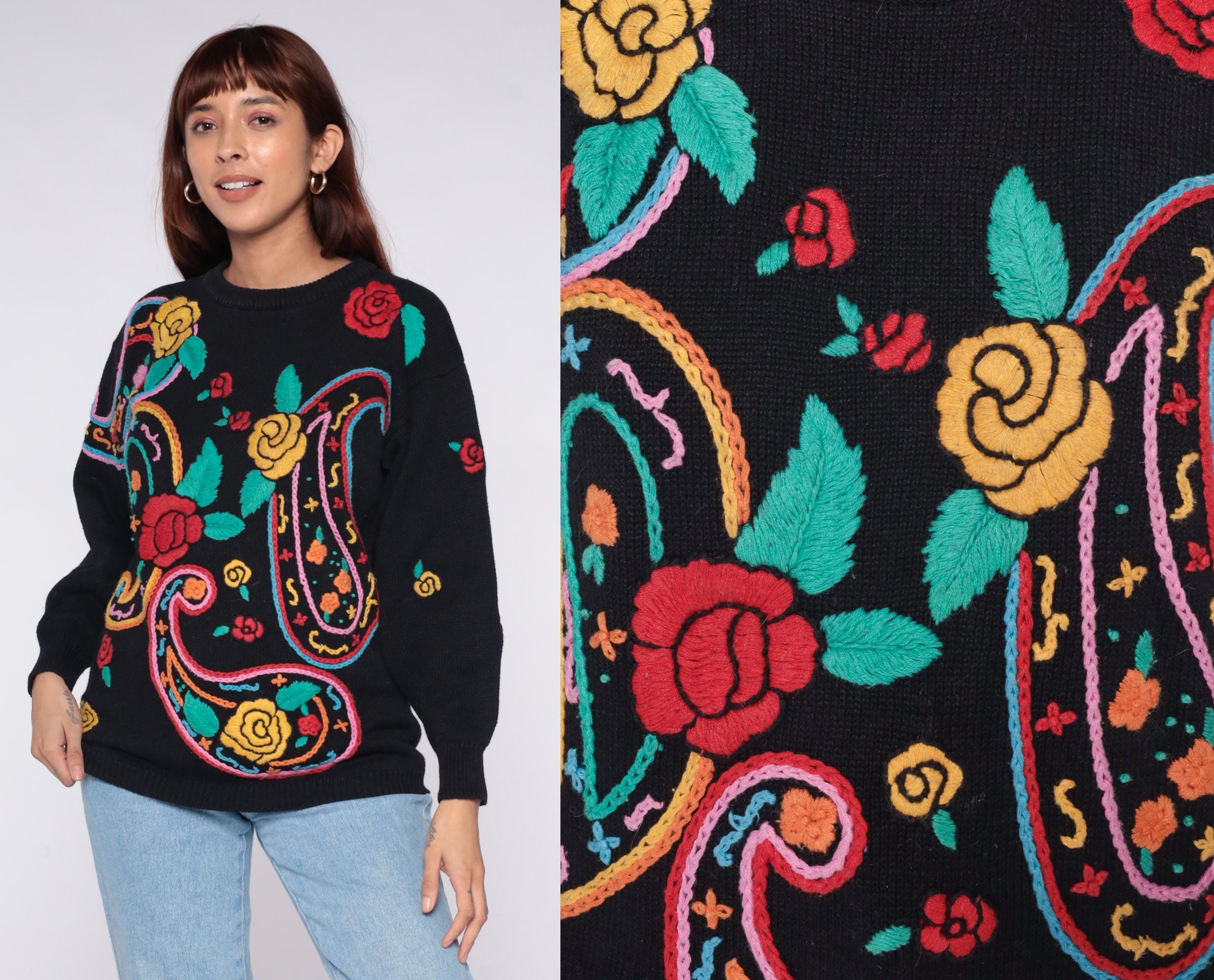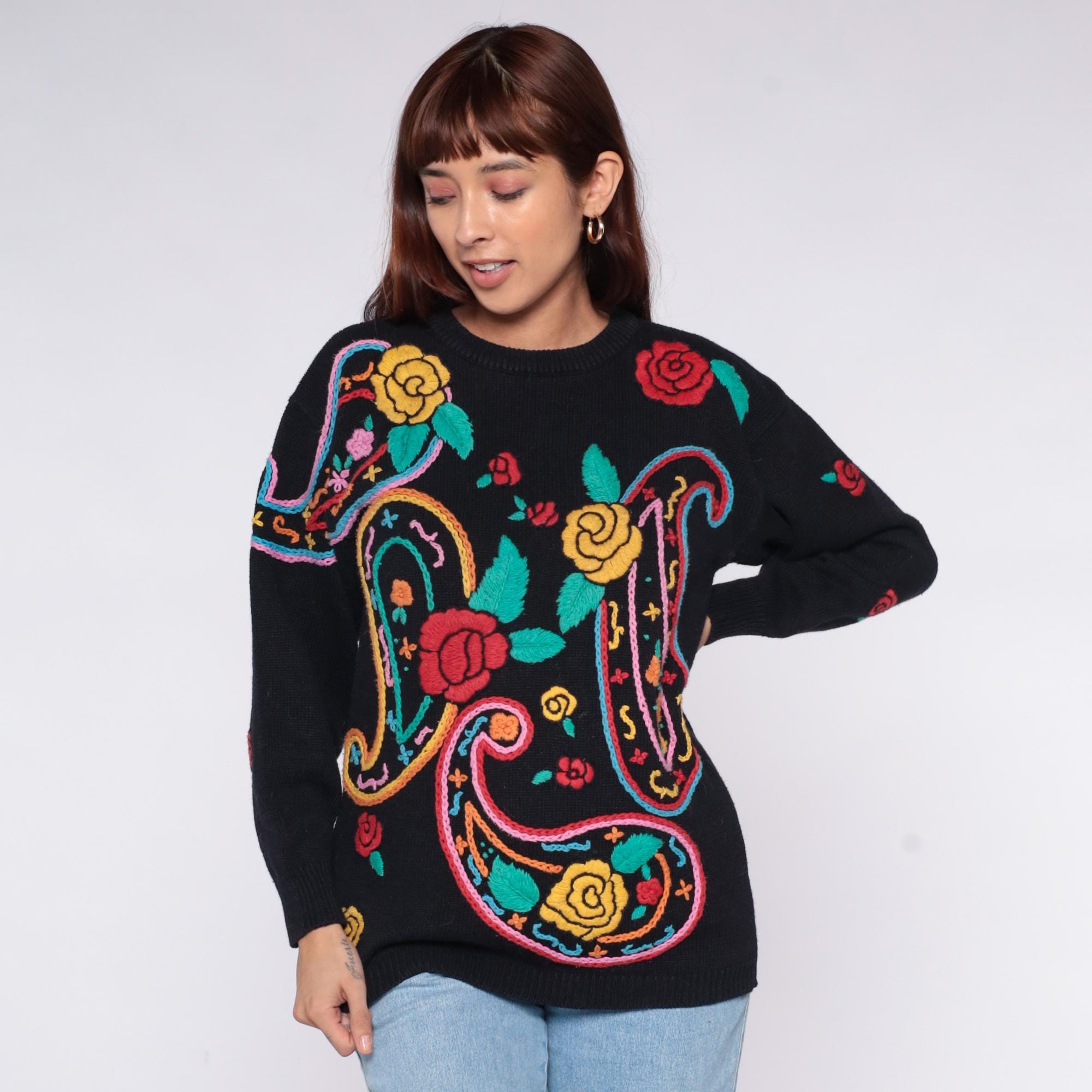 90s black knit sweater from Western Connection with elaborate multicolor embroidered design featuring snakes with paisley pattern interiors and floral motifs. Red, yellow, pink, and orange roses with turquoise leaves scattered across front and sleeves, with blue, pink, orange, and yellow embroidered snake outlines throughout. Crew neckline and long sleeves with ribbed cuffs and hem.