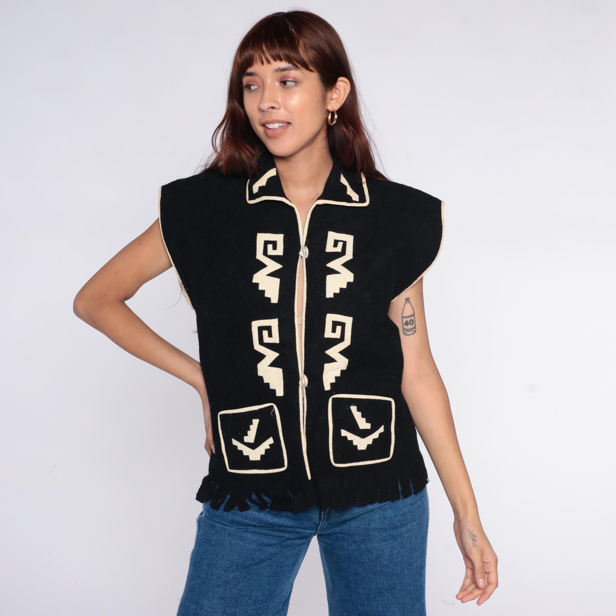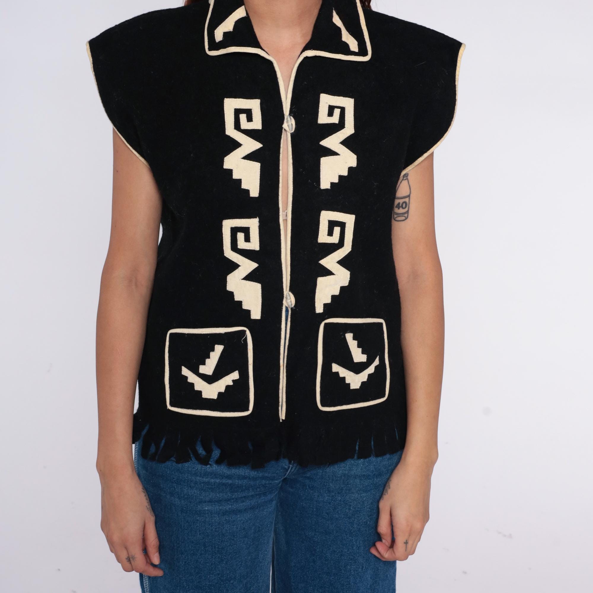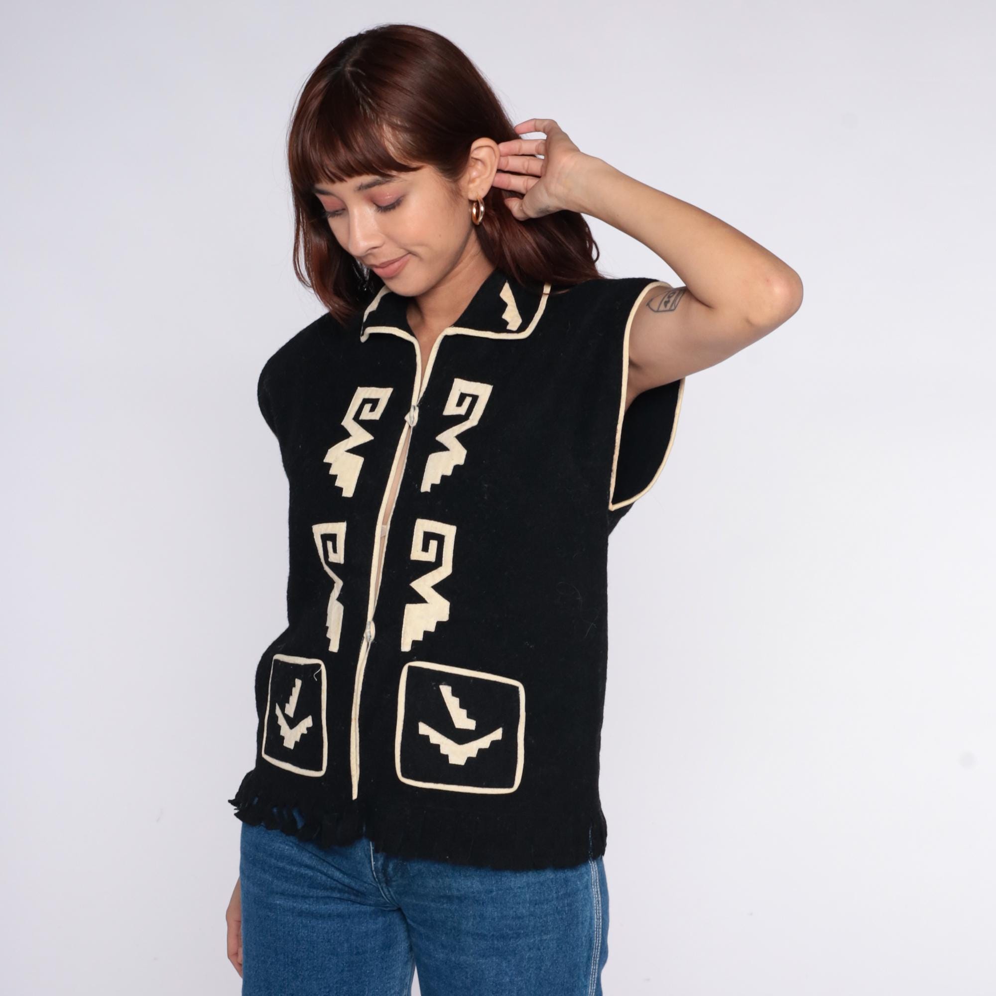 90s black vest with cream geometric trim in a Southwestern pattern. Front zipper closure, collared neckline, two front pockets with matching trim detail, and sleeveless construction.