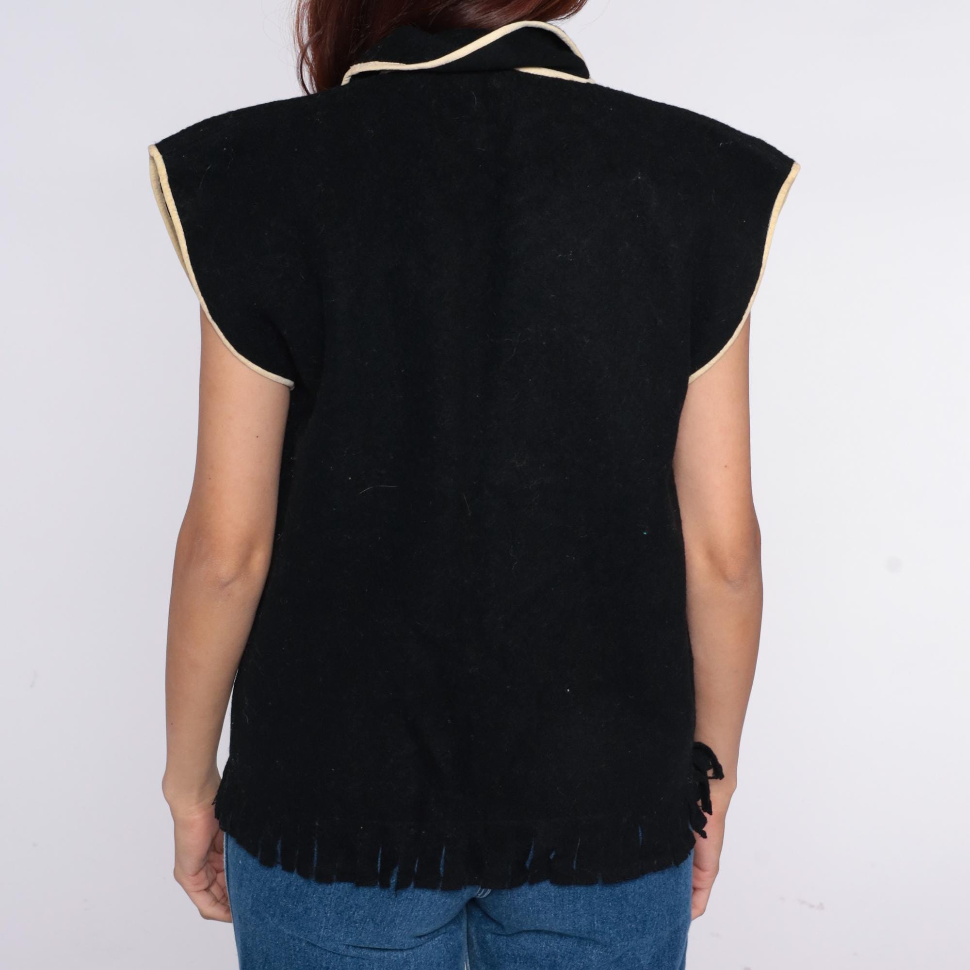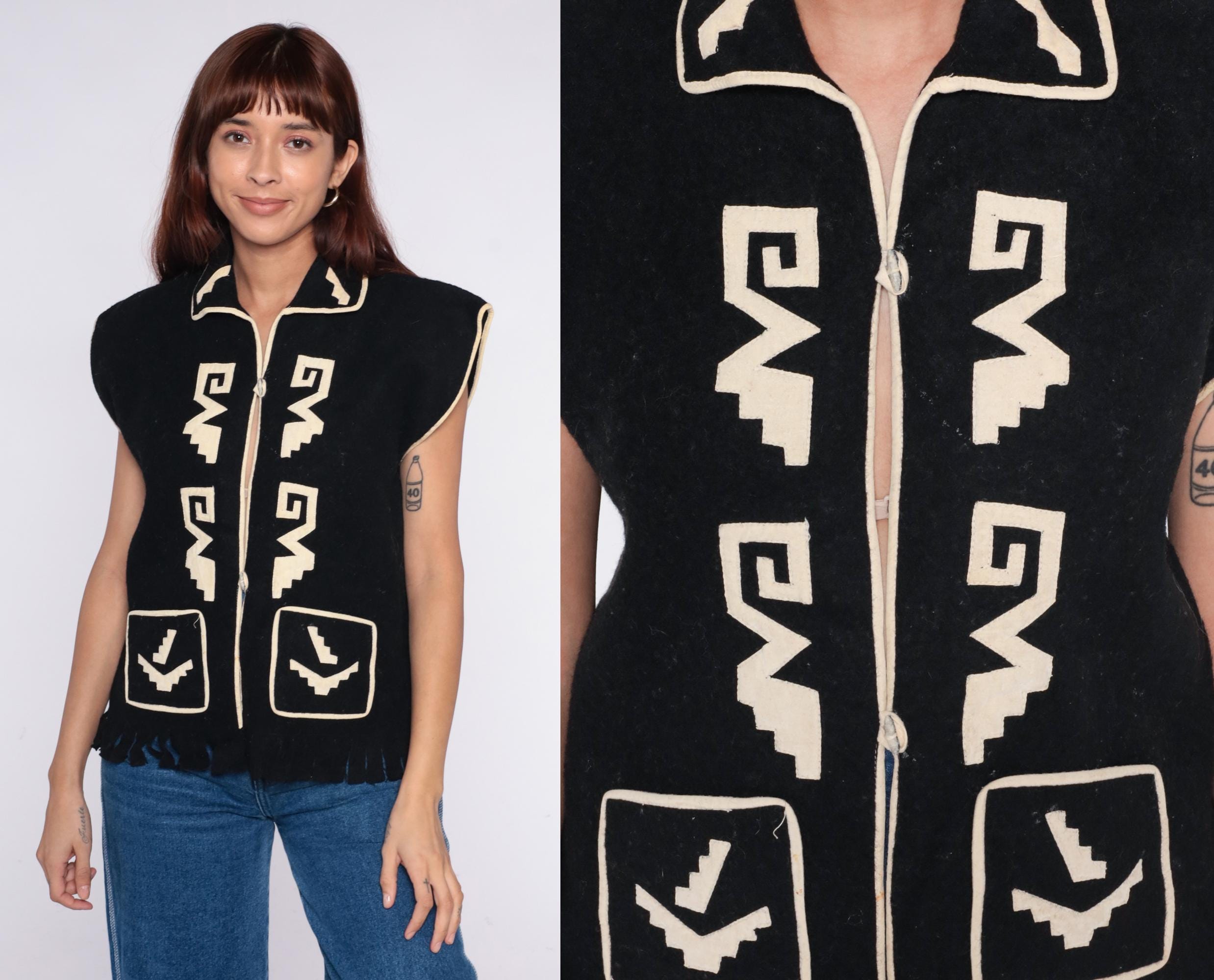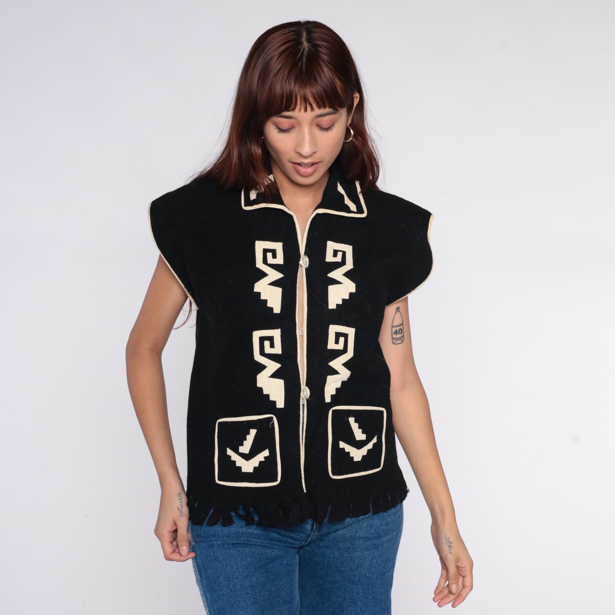 90s black vest with cream geometric trim in a Southwestern pattern. Front zipper closure, collared neckline, two front pockets with matching trim detail, and sleeveless construction.