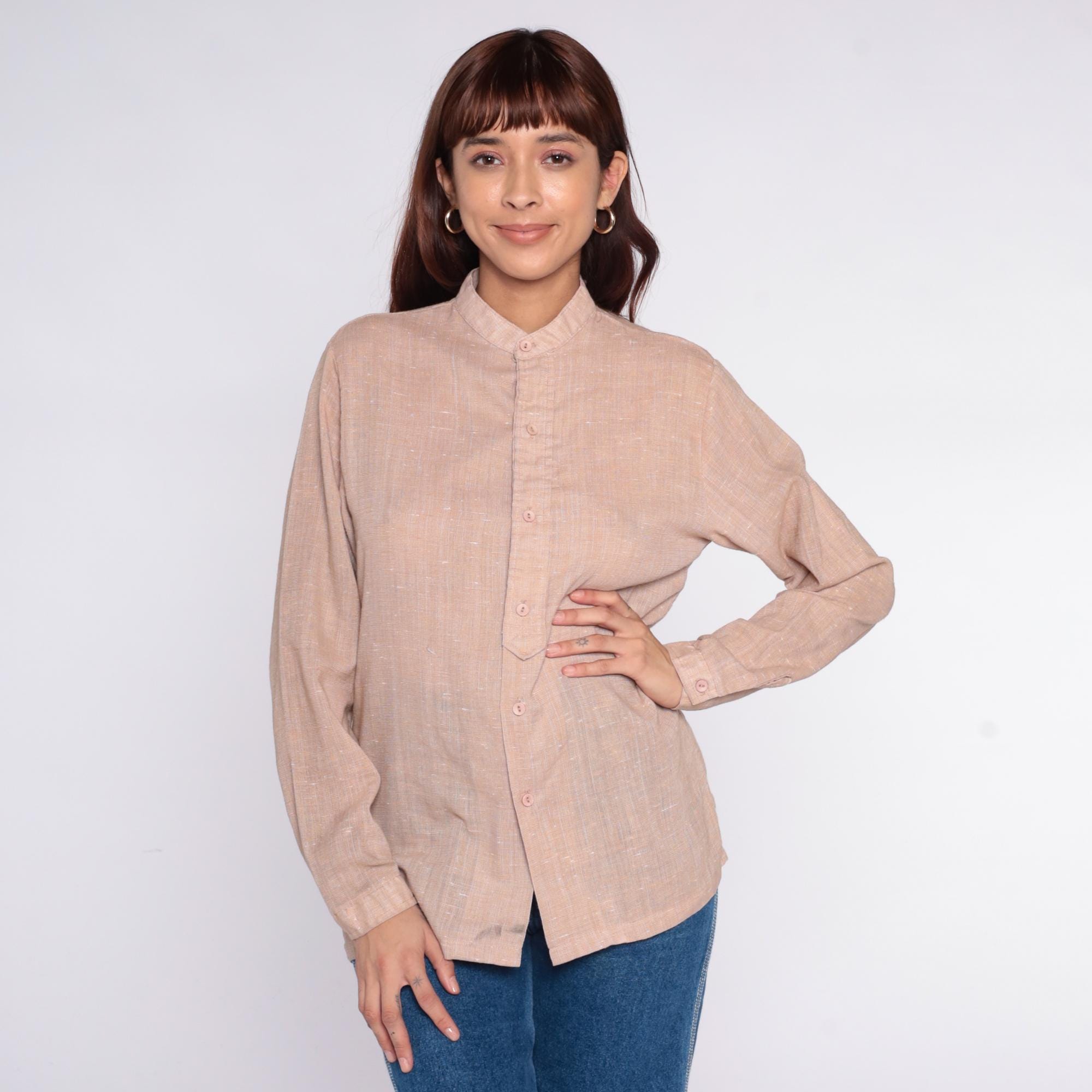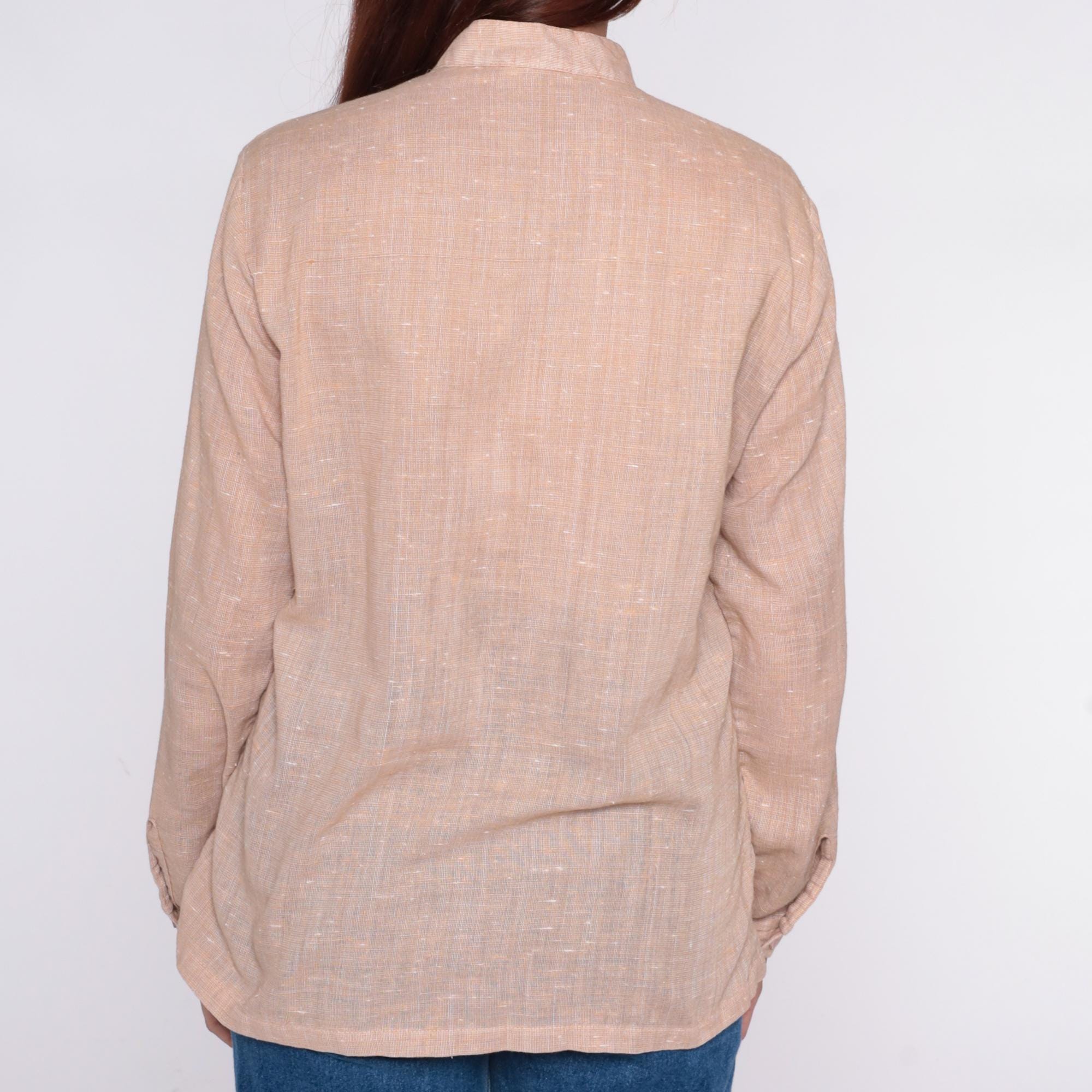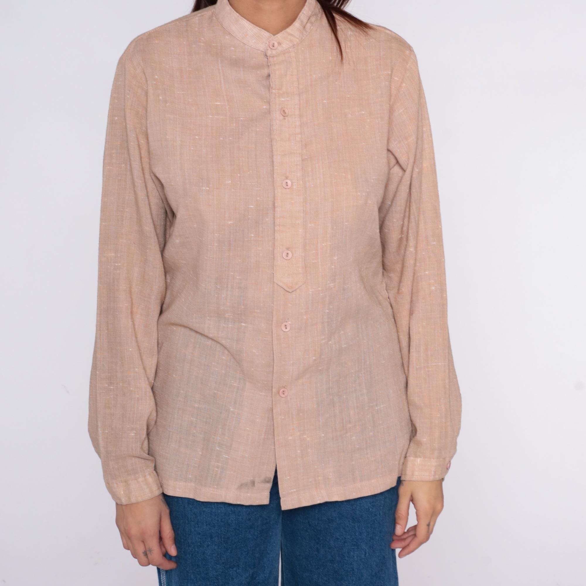 70s beige button-up shirt from Mar Vista with band collar and long sleeves with button cuffs. Front button closure, textured weave throughout.