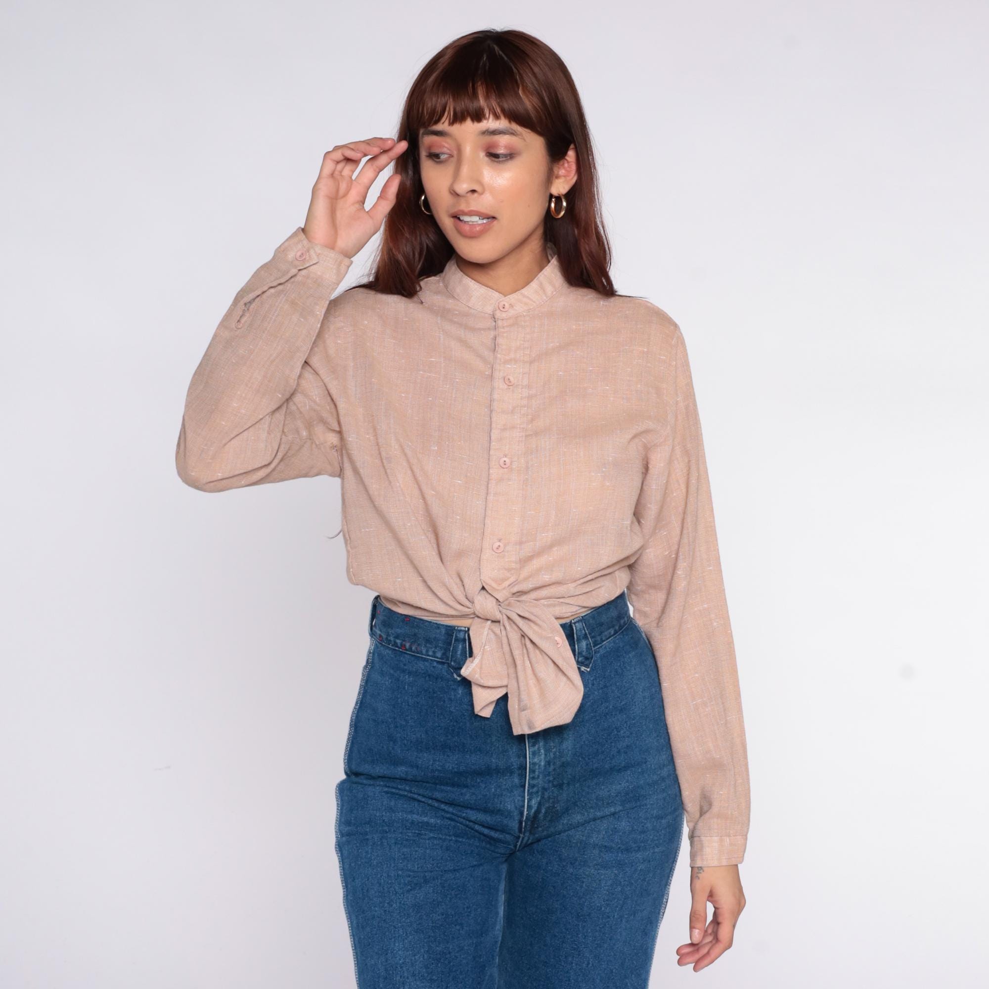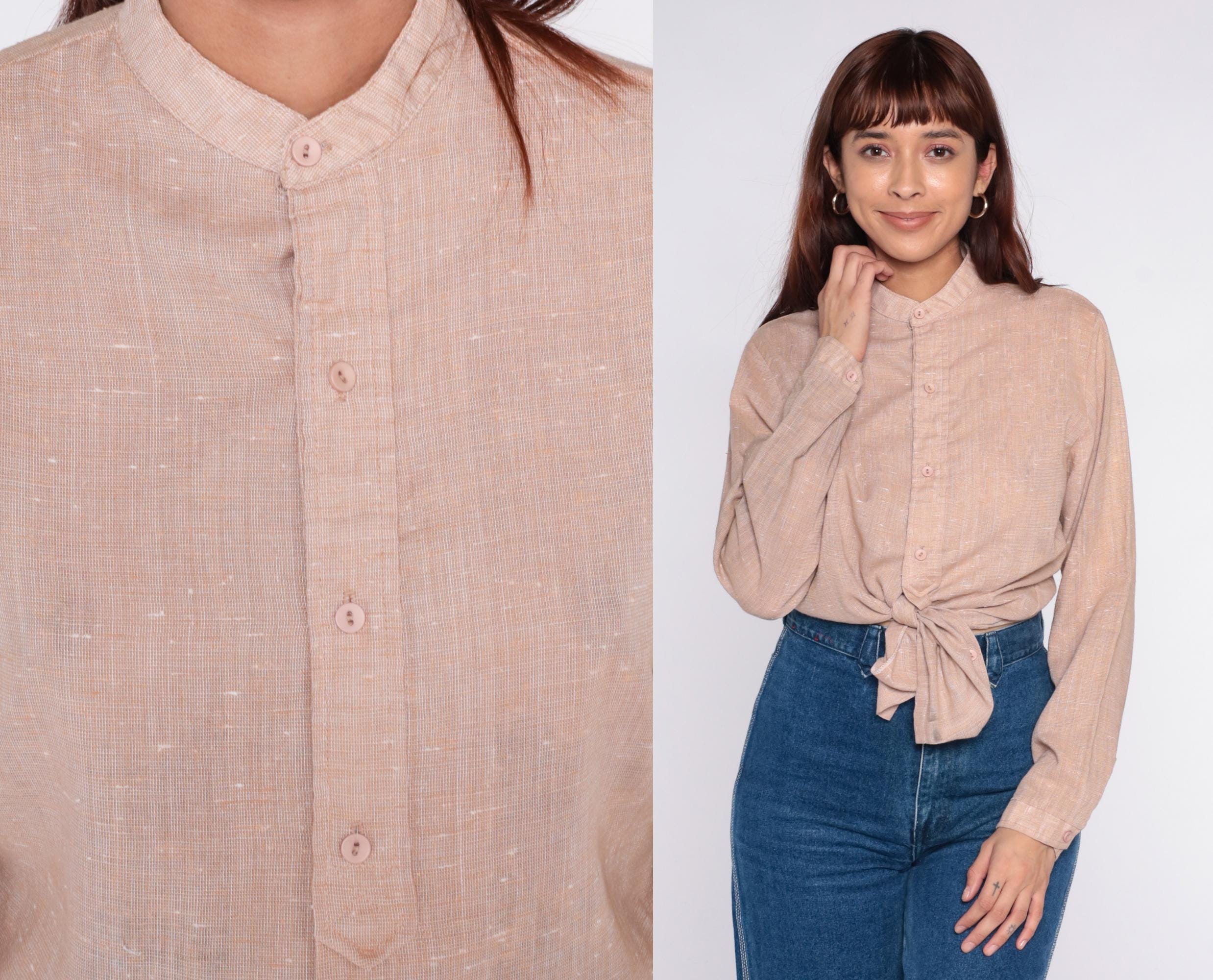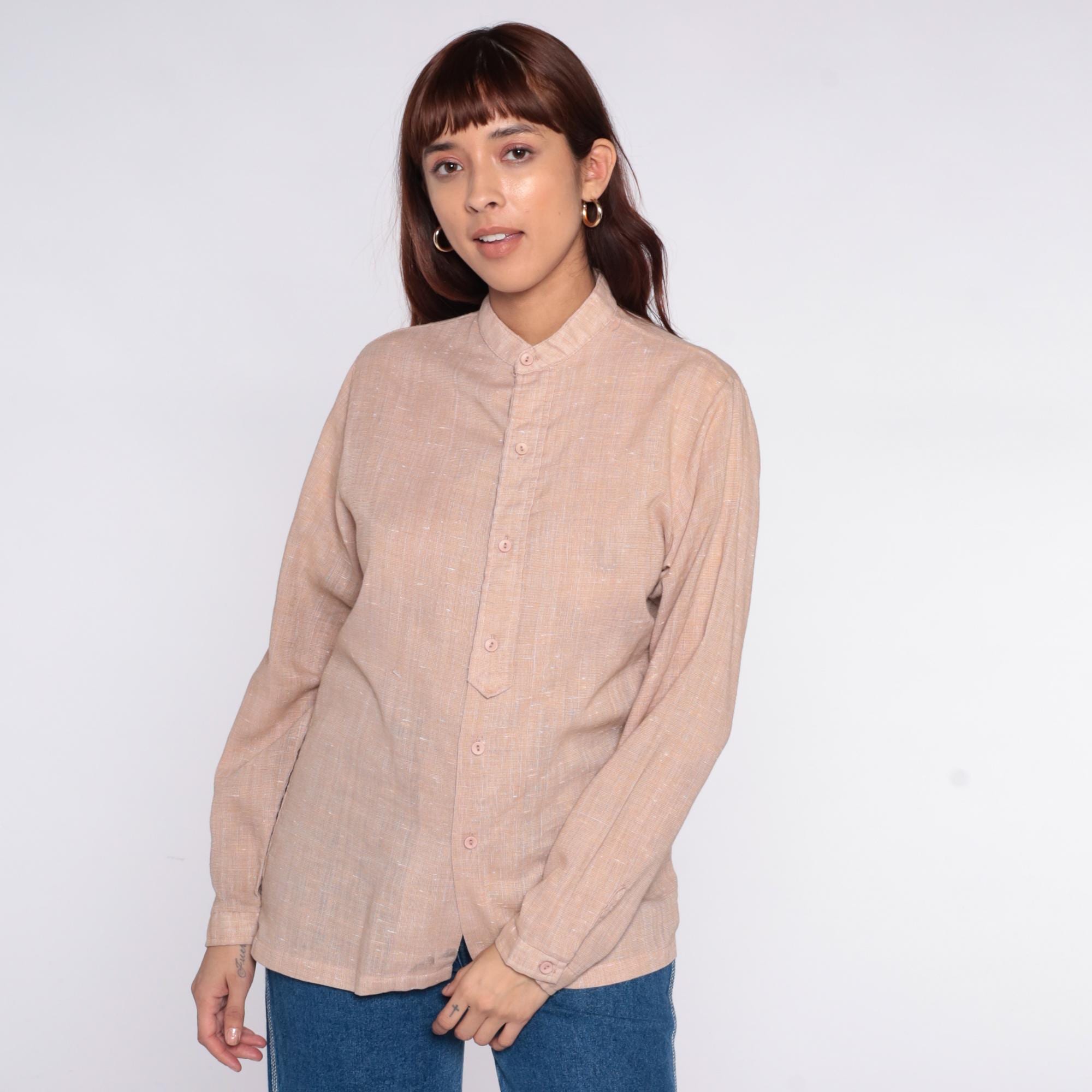 70s beige button-up shirt from Mar Vista with band collar and long sleeves with button cuffs. Front button closure, textured weave throughout.