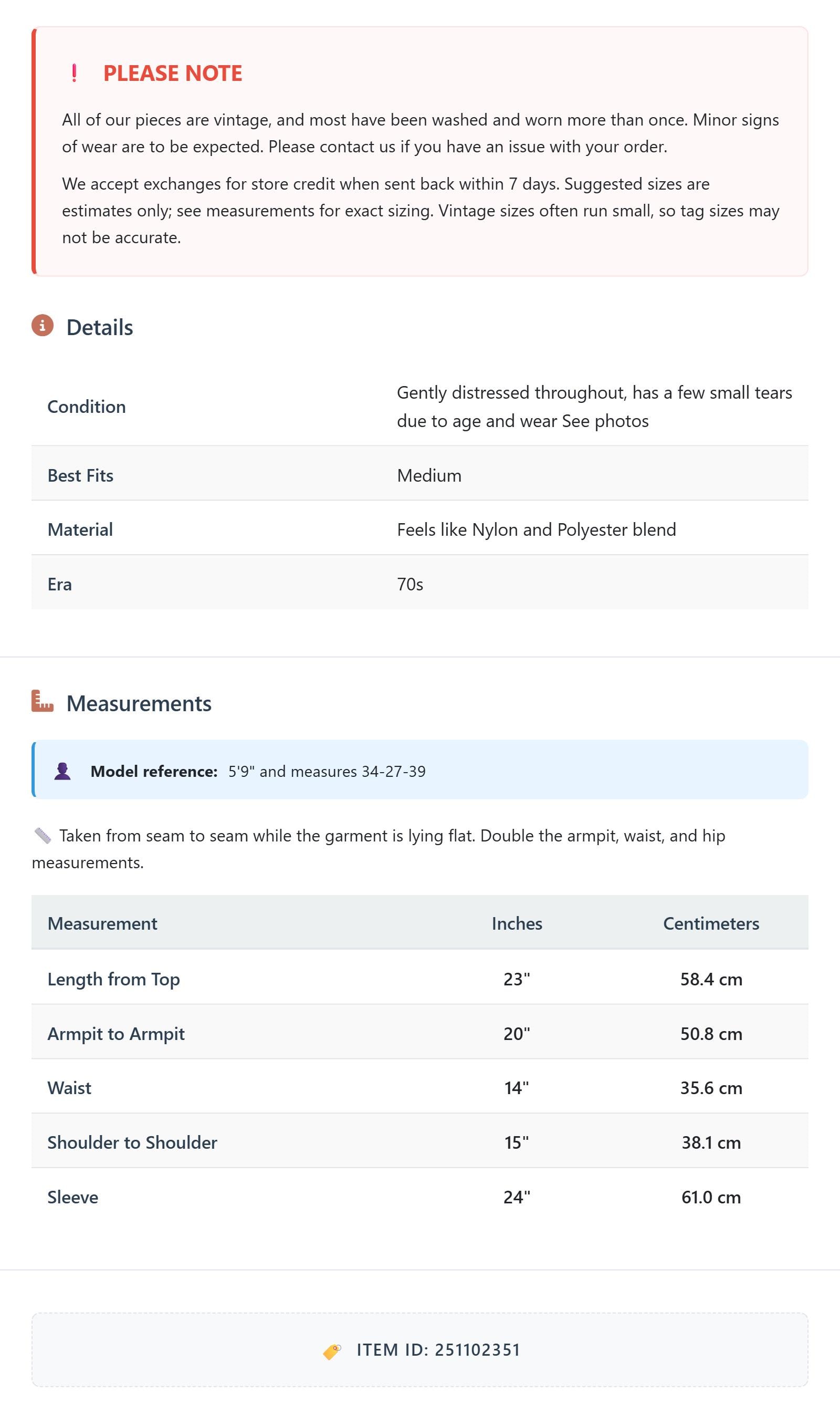 Suggested sizes are estimates only; see measurements for exact sizing. Vintage sizes often run small, so tag sizes may not be accurate.