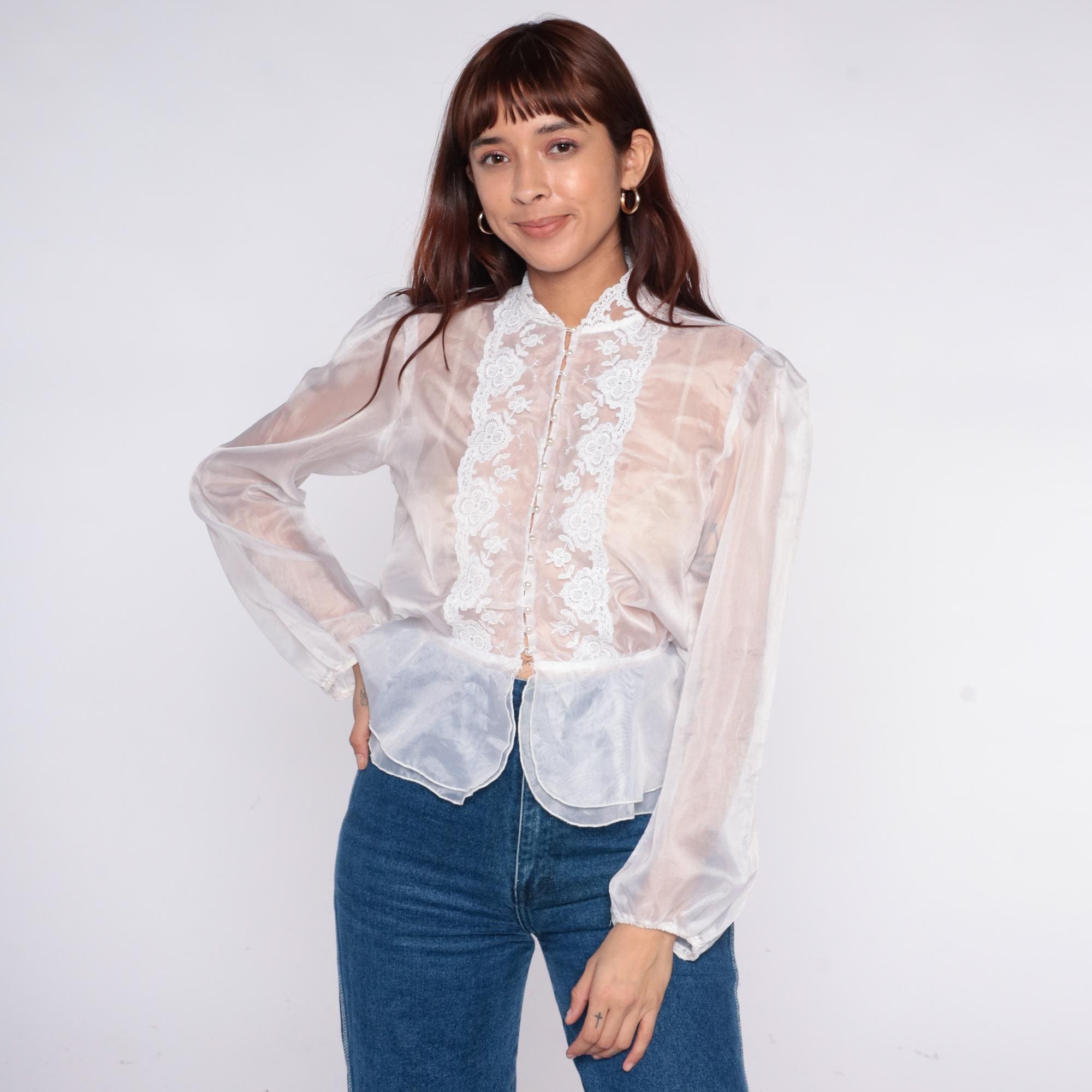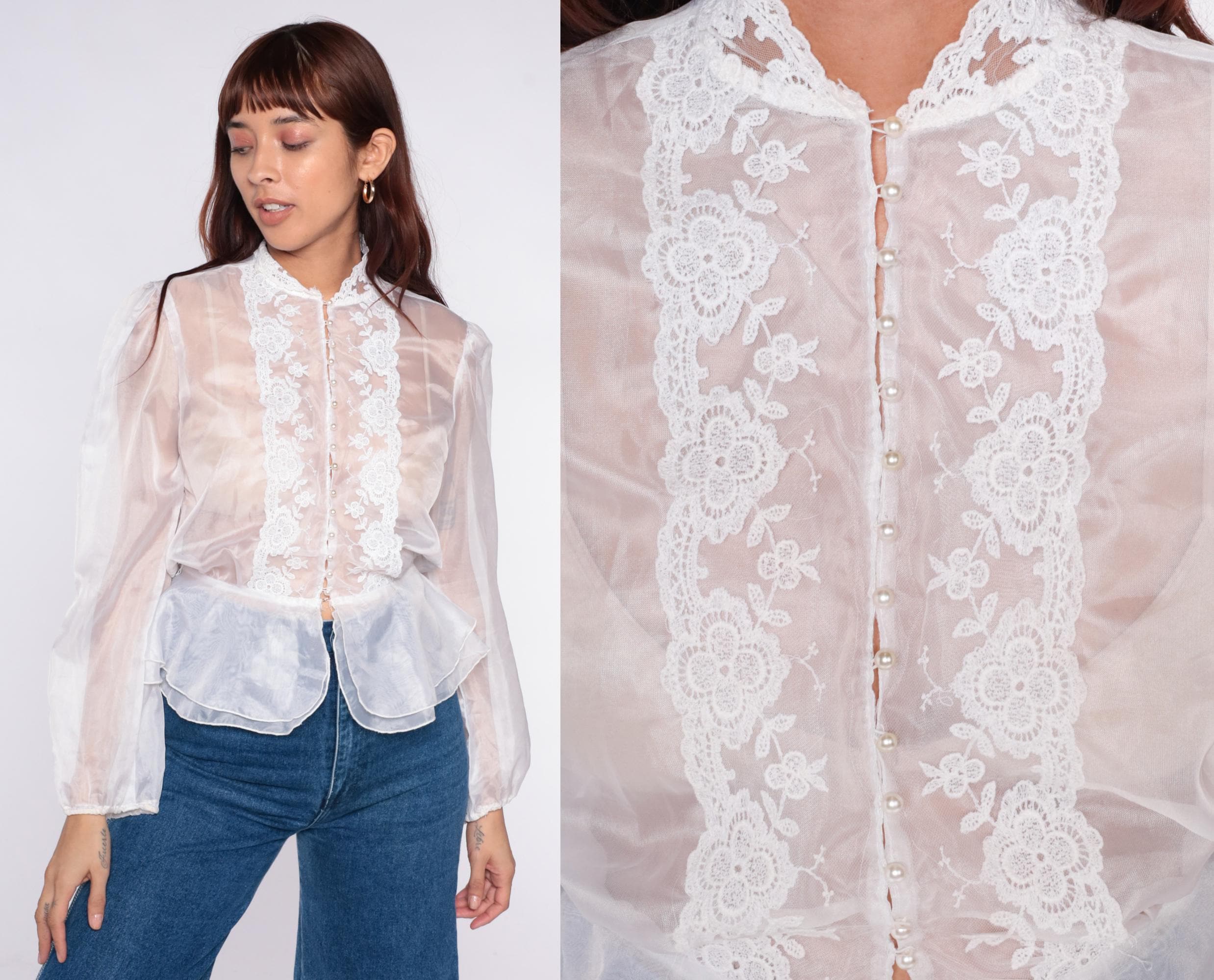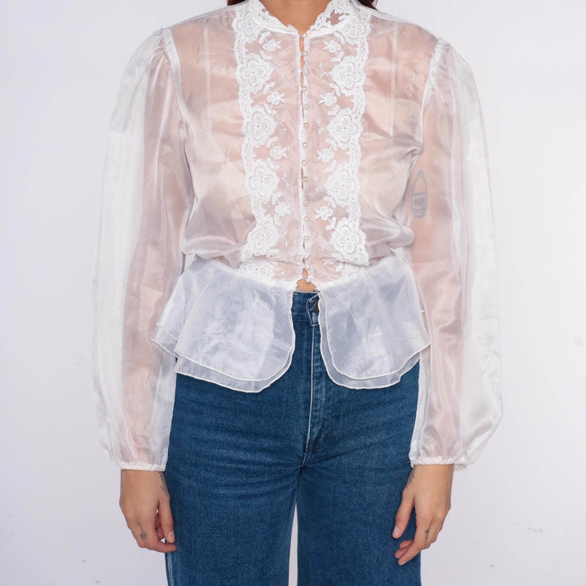 White sheer 70s blouse with lace collar and lace trim down the front placket. Pearl button closure from neckline to hem, long sleeves with elastic cuffs, scalloped peplum hemline.