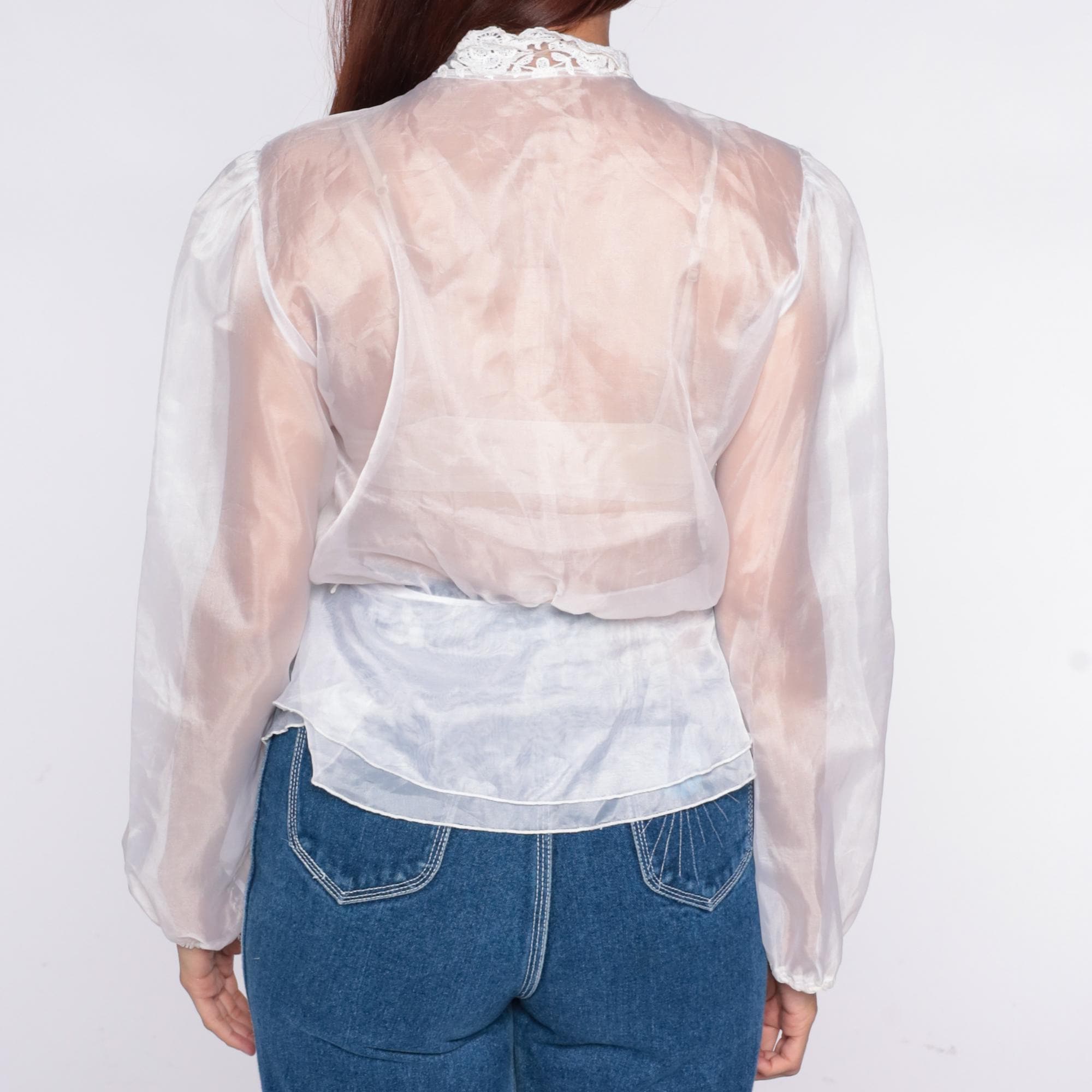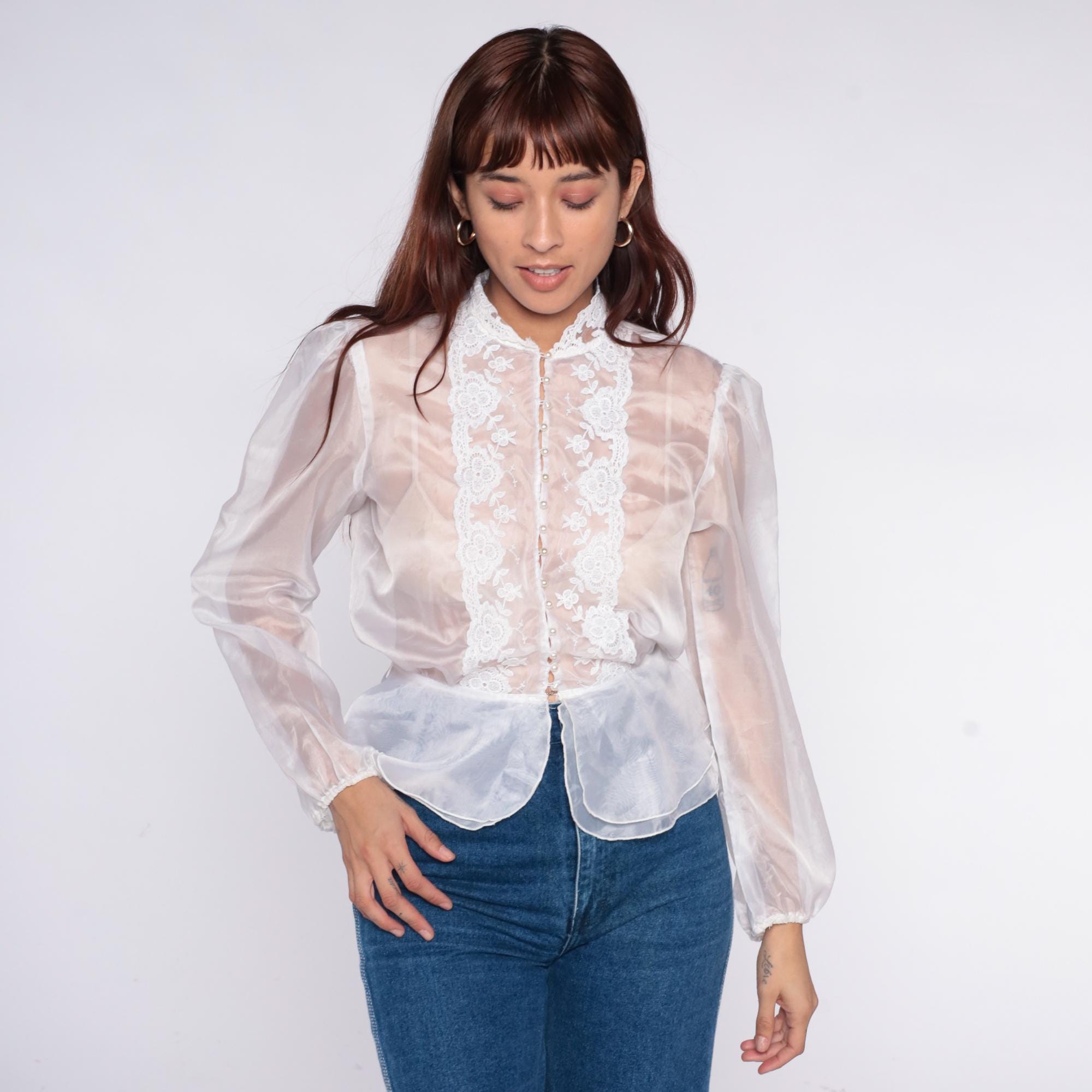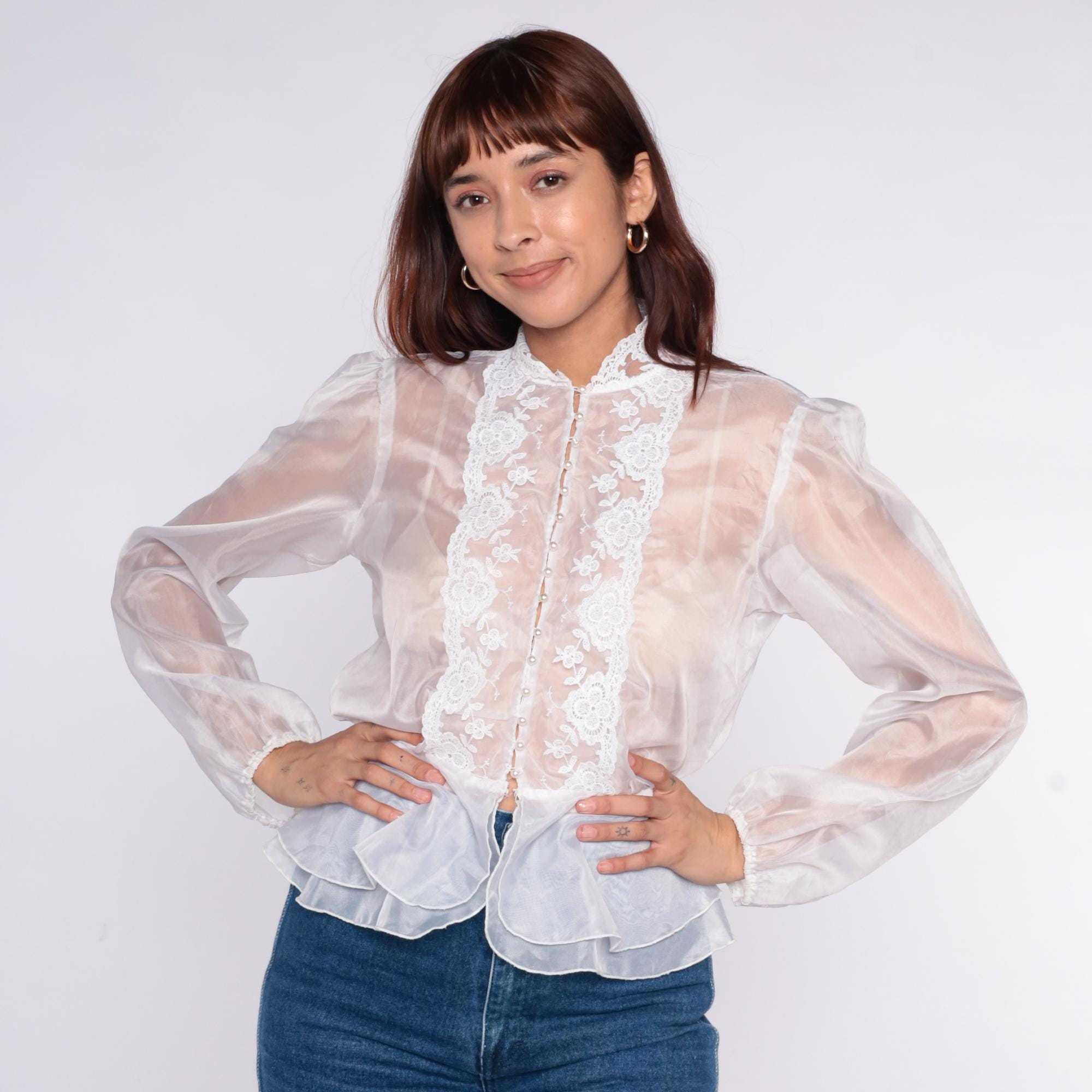 White sheer 70s blouse with lace collar and lace trim down the front placket. Pearl button closure from neckline to hem, long sleeves with elastic cuffs, scalloped peplum hemline.