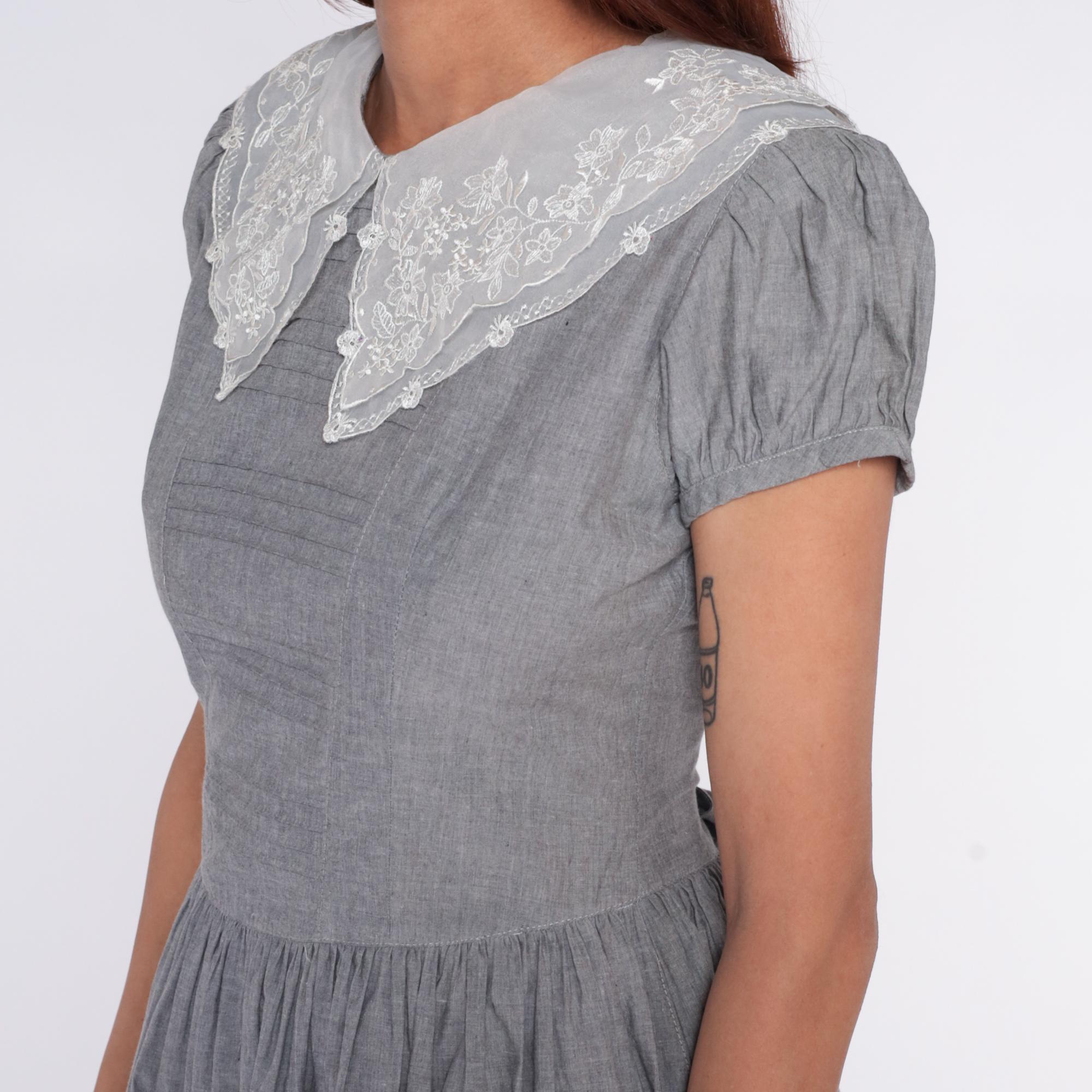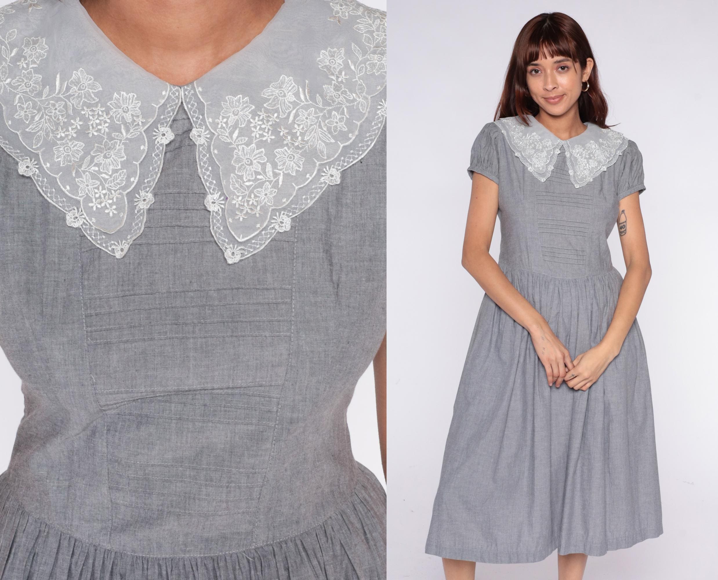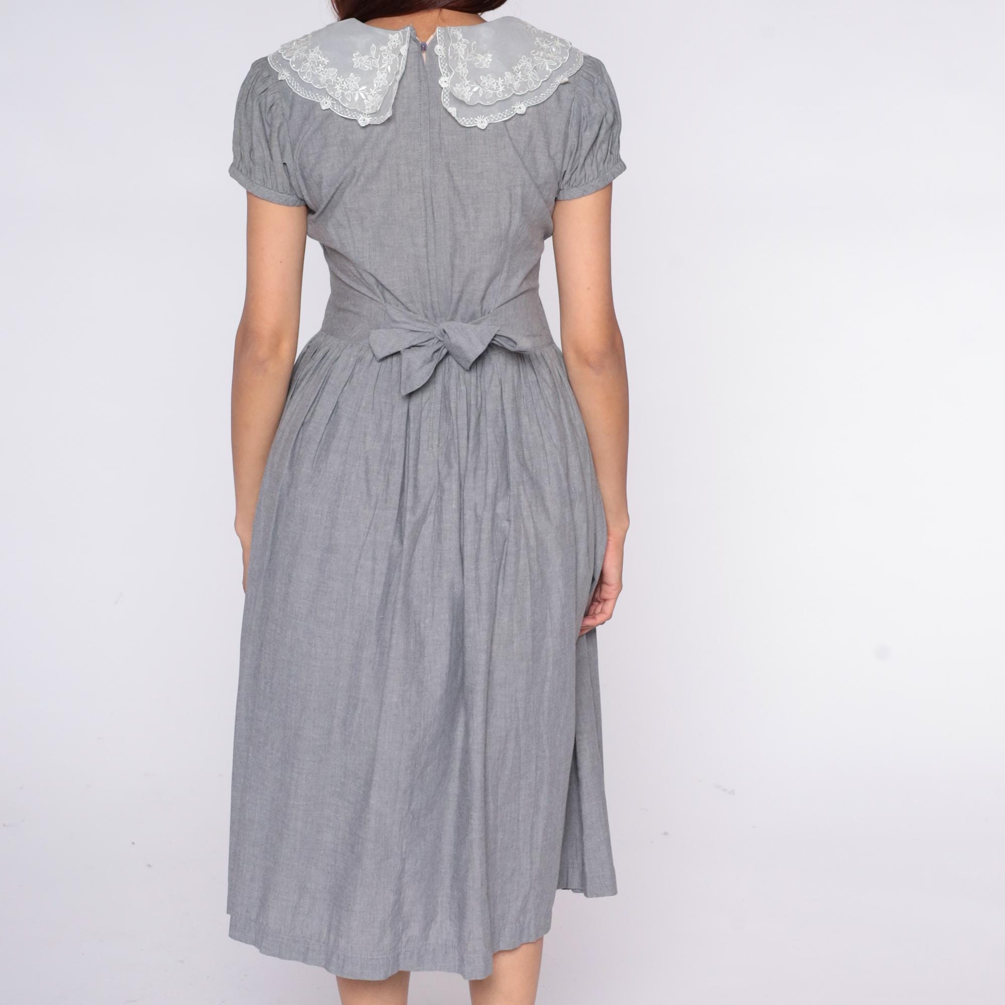 80s gray dress with large white lace collar featuring embroidered floral pattern and scalloped edges. Fitted bodice with horizontal pintuck detail, short puff sleeves, gathered skirt with back tie belt. Button back closure.