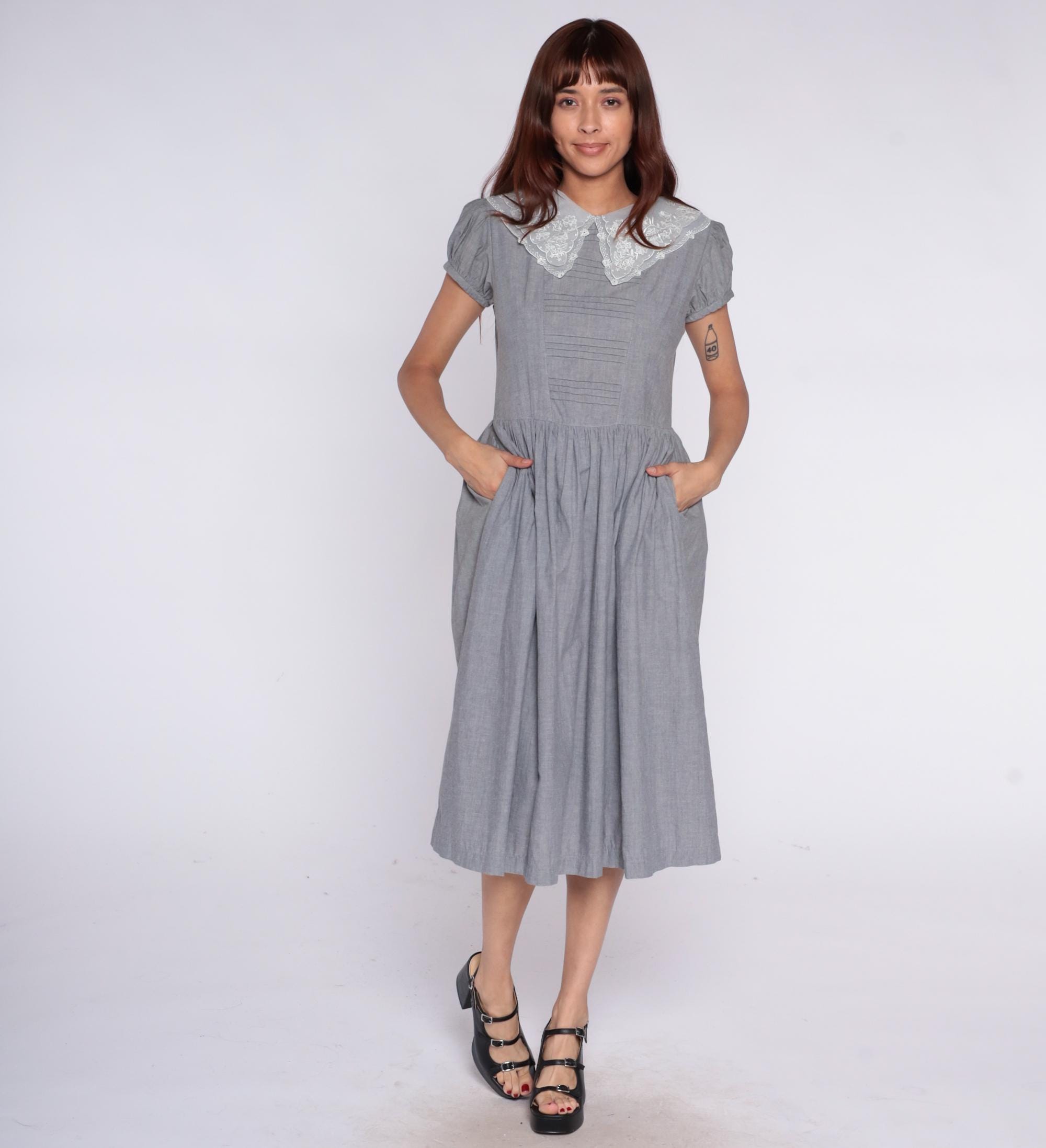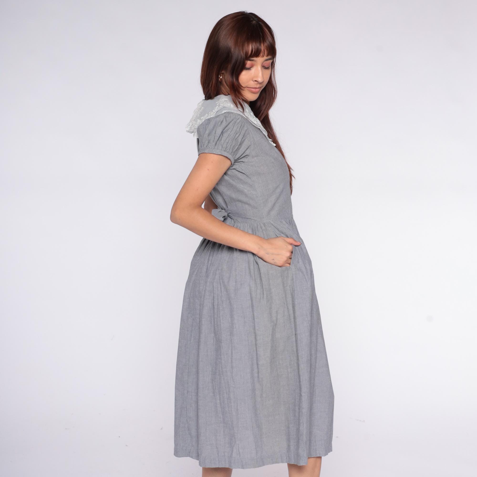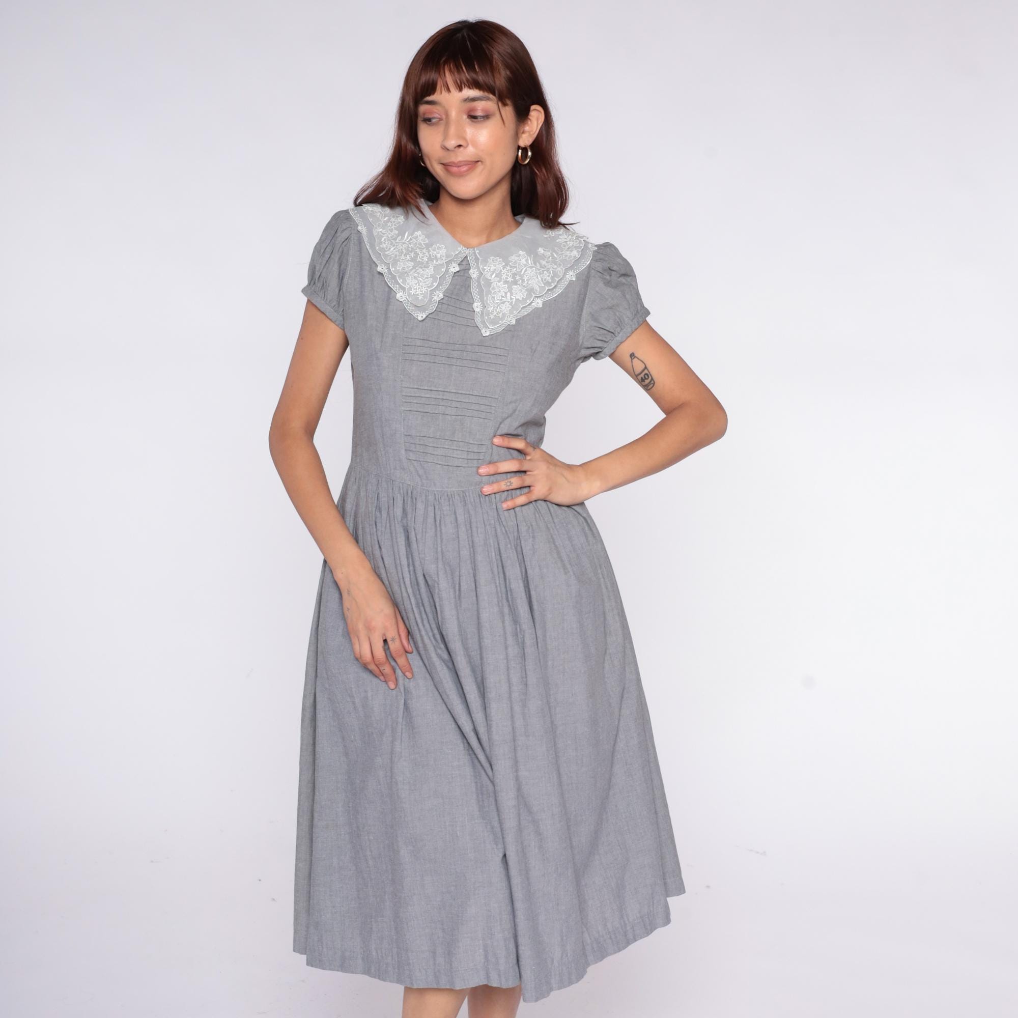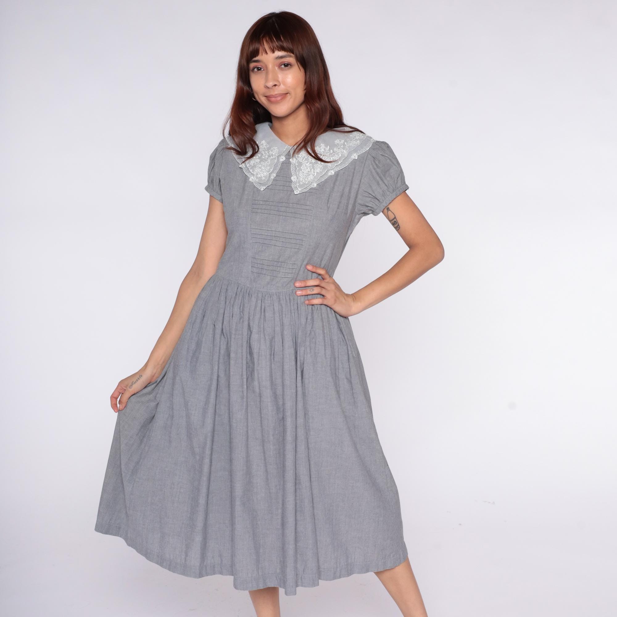 80s gray dress with large white lace collar featuring embroidered floral pattern and scalloped edges. Fitted bodice with horizontal pintuck detail, short puff sleeves, gathered skirt with back tie belt. Button back closure.