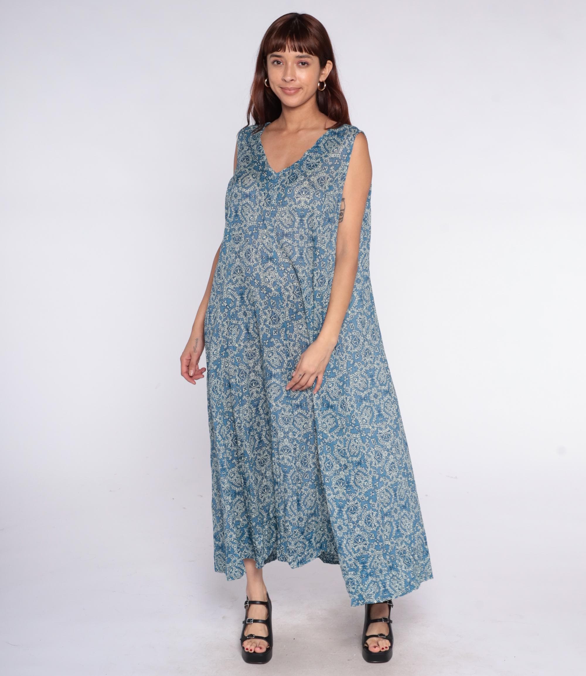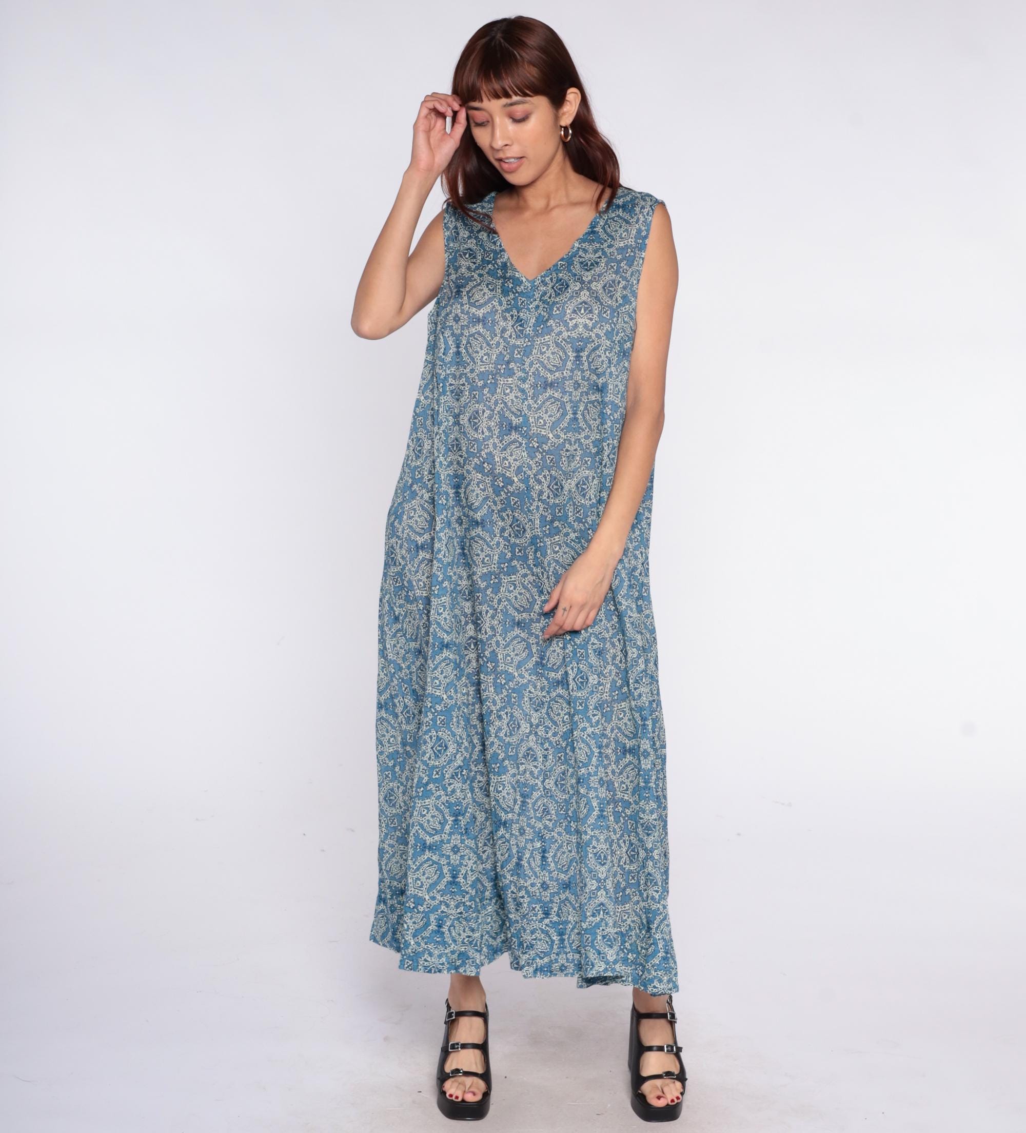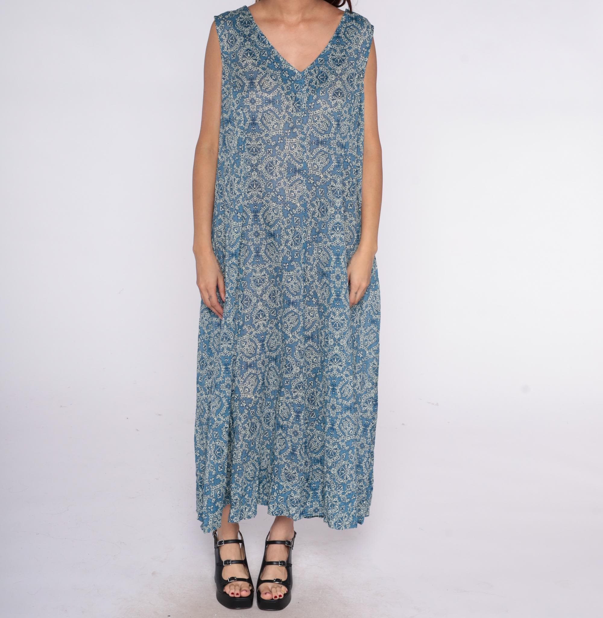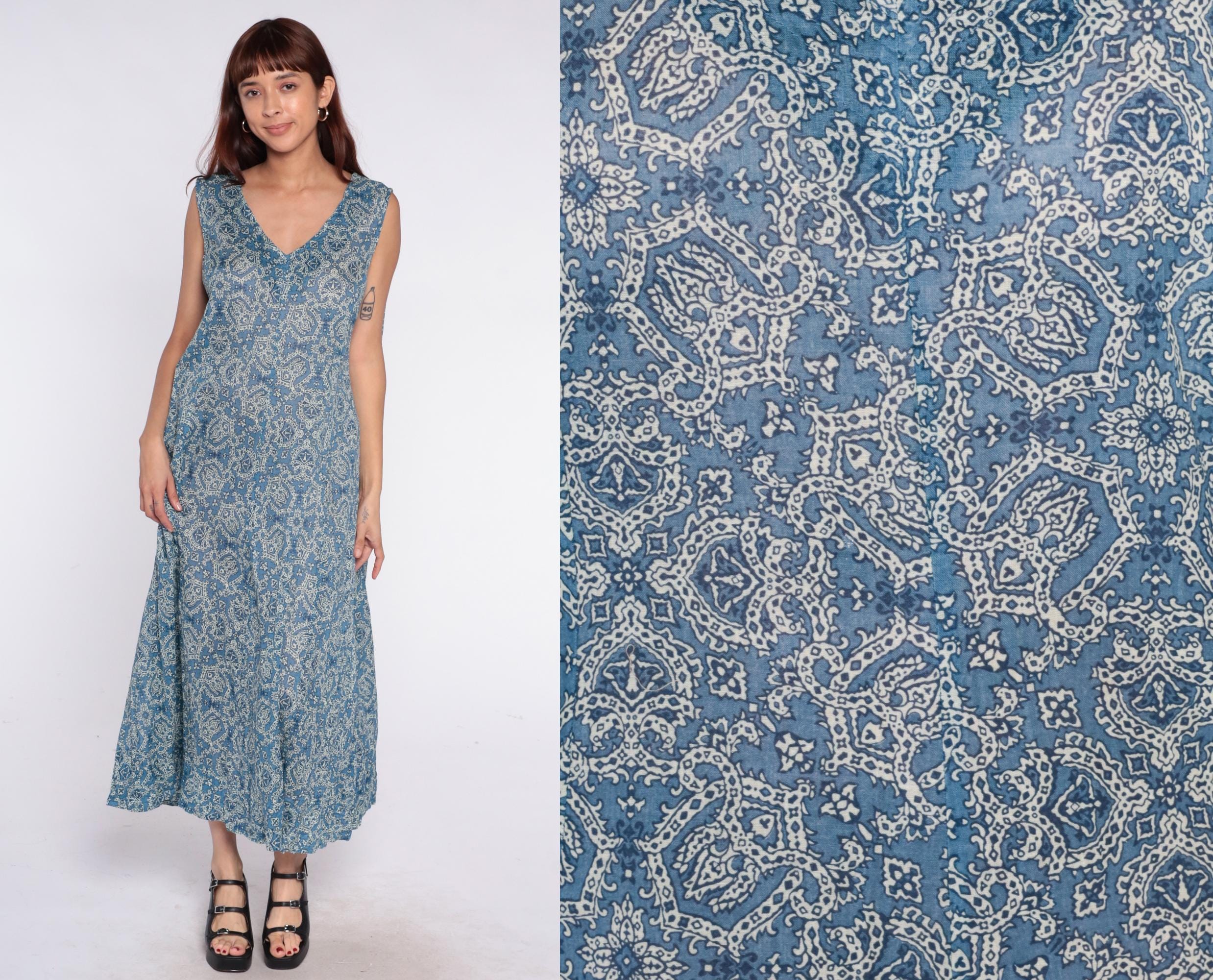 Y2k blue and white paisley print maxi dress from Coldwater Creek with V-neck and sleeveless design. All-over paisley pattern in cream and white across blue background. Full-length maxi silhouette with side seam pockets.