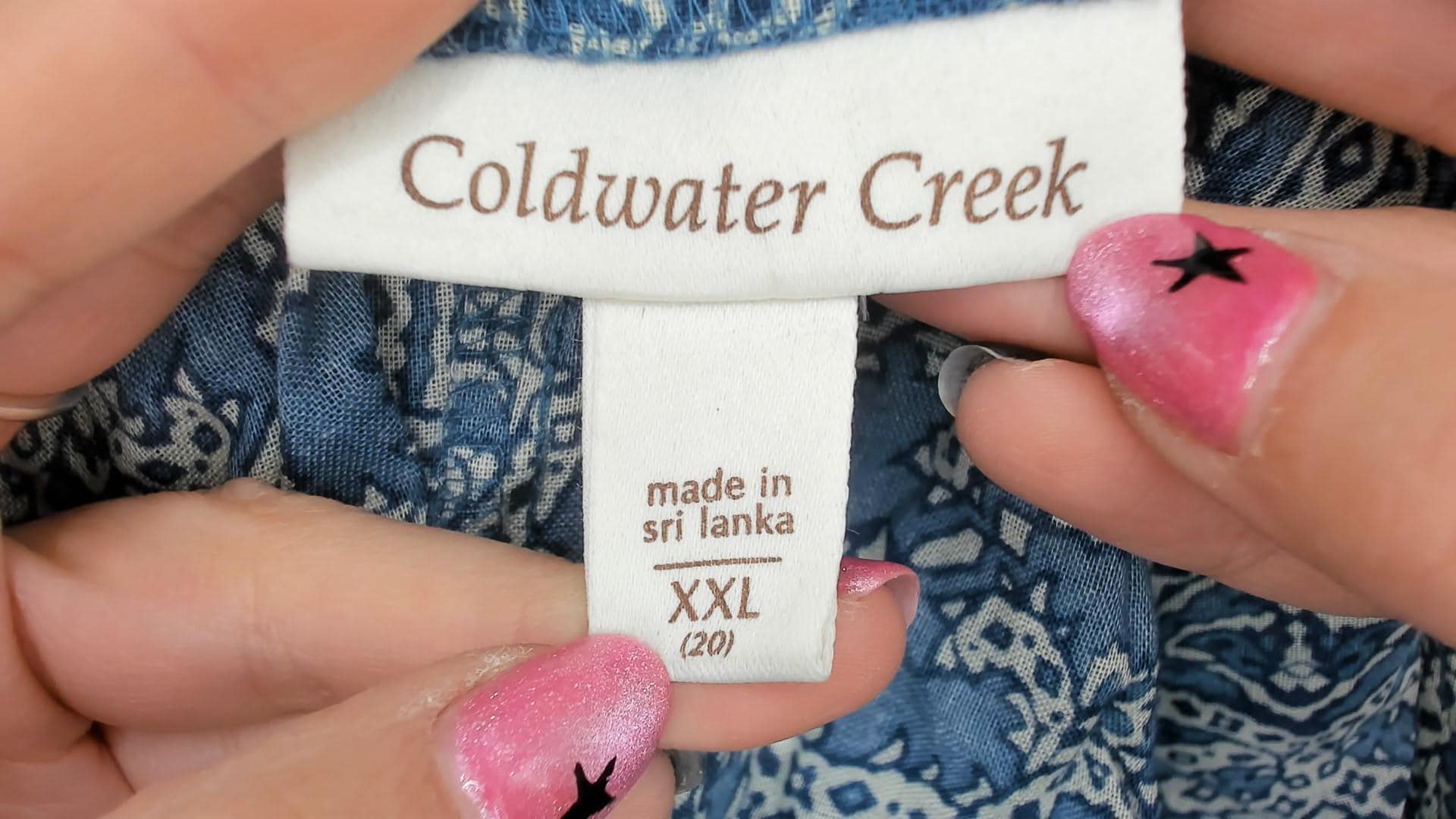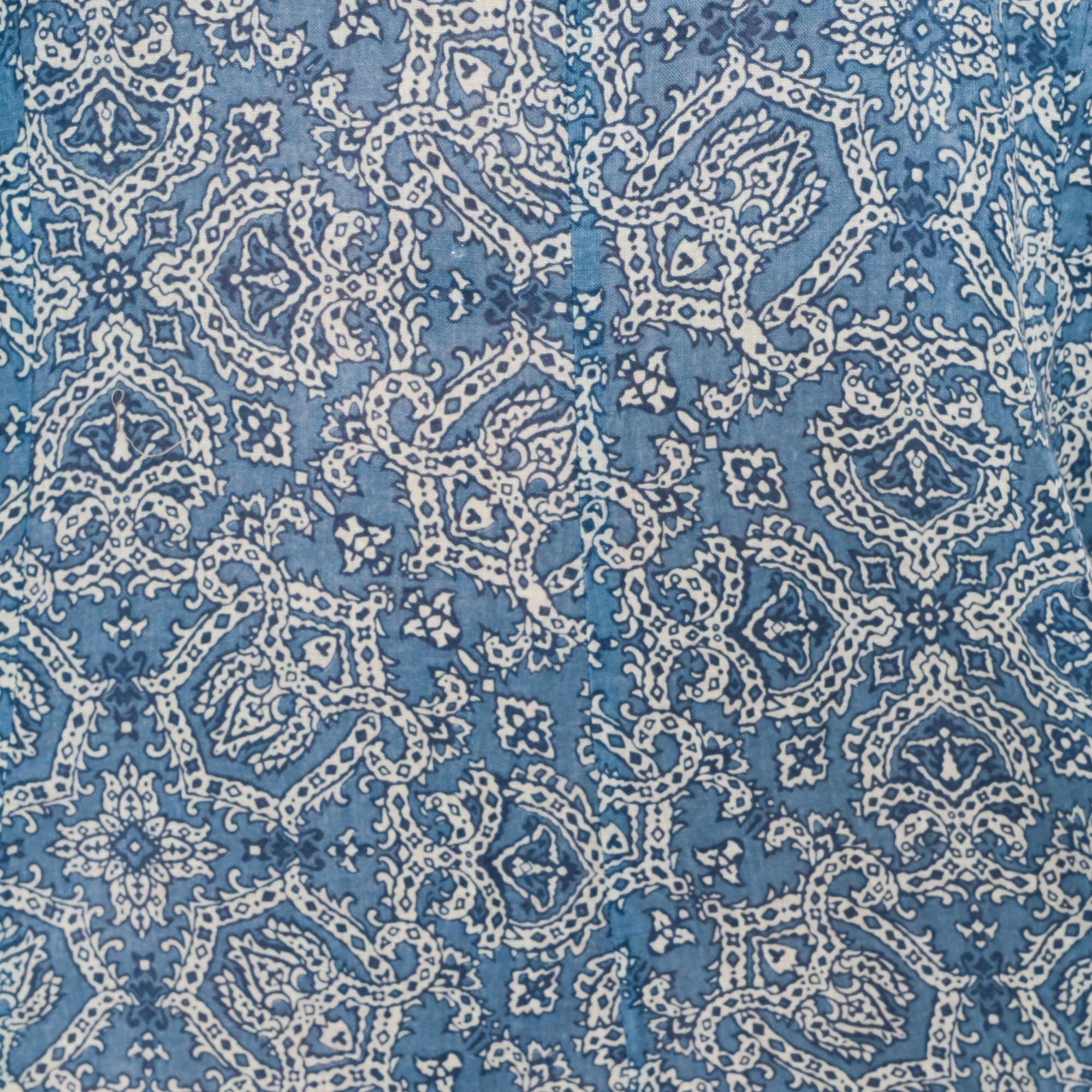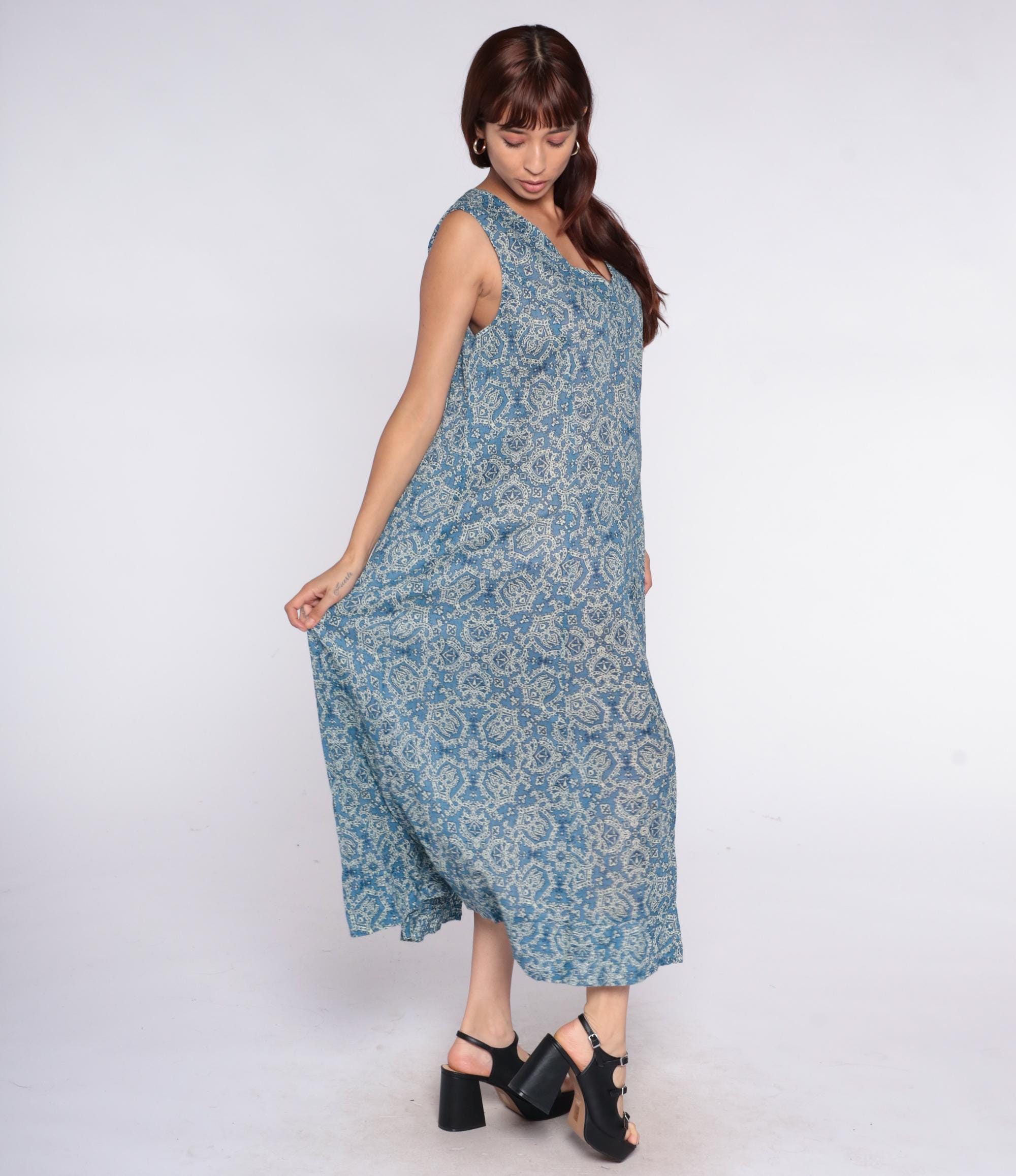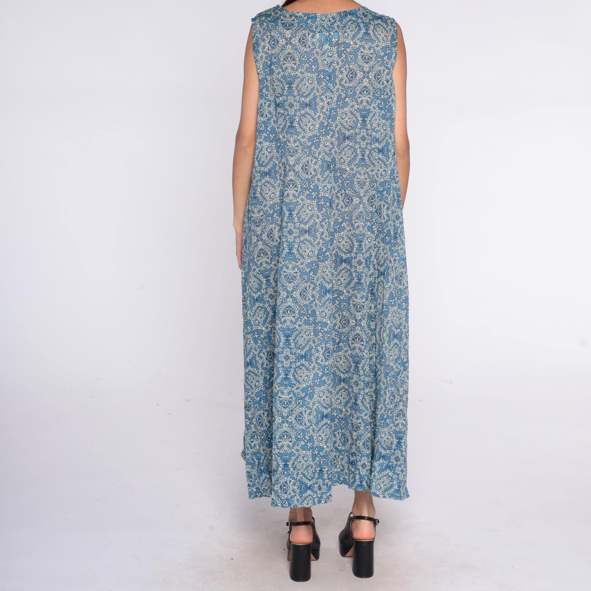 Y2k blue and white paisley print maxi dress from Coldwater Creek with V-neck and sleeveless design. All-over paisley pattern in cream and white across blue background. Full-length maxi silhouette with side seam pockets.
