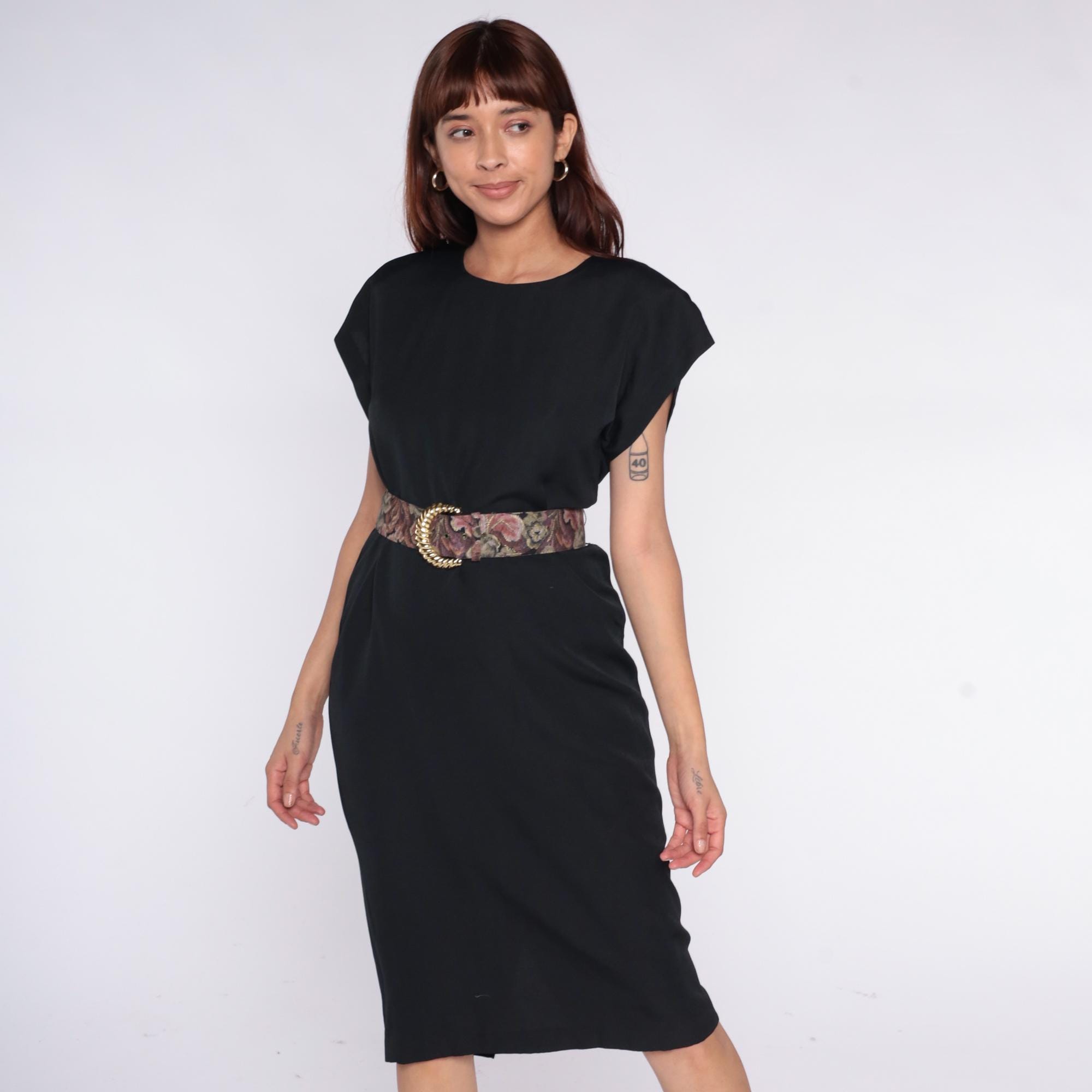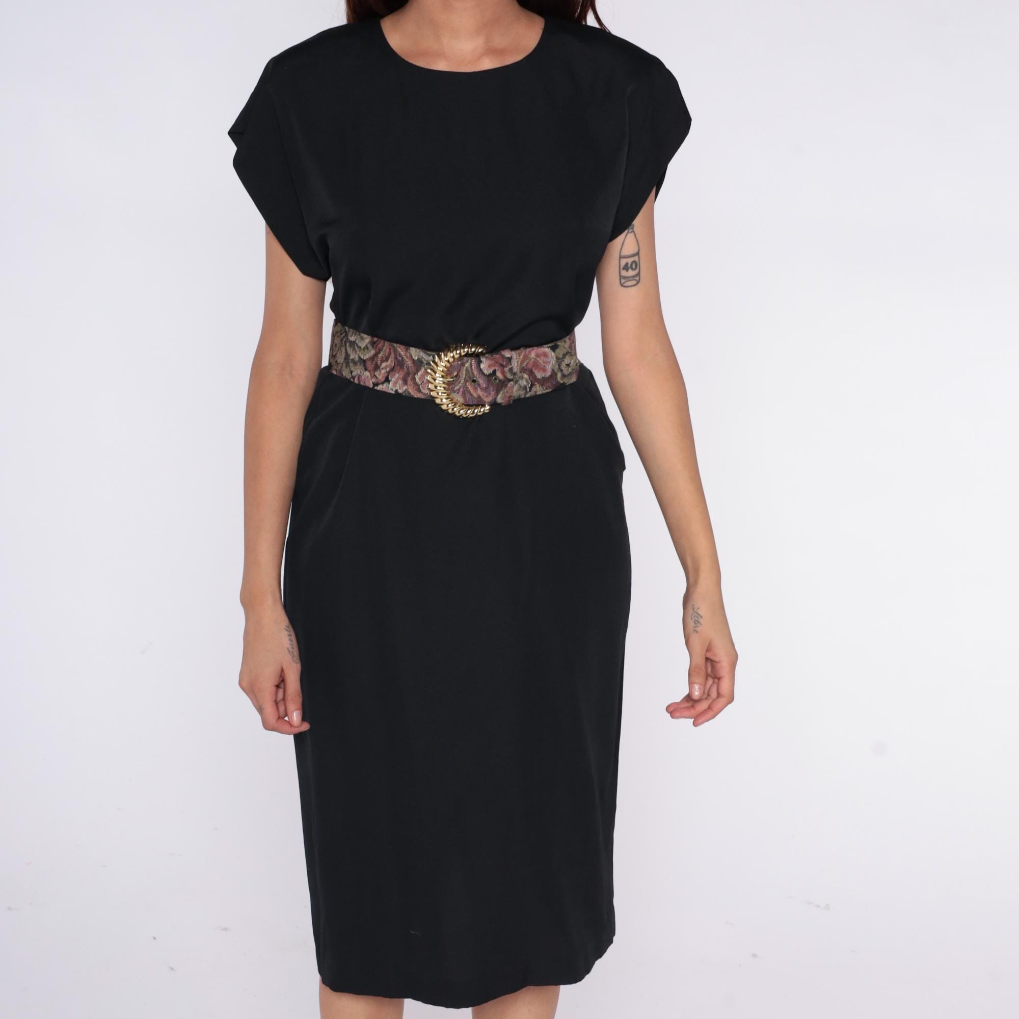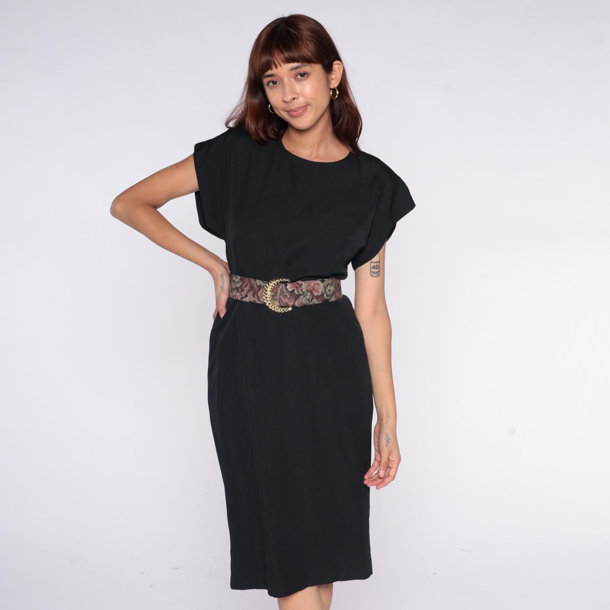 90s black midi dress with crew neckline and short cap sleeves. Straight column silhouette with back zipper closure.