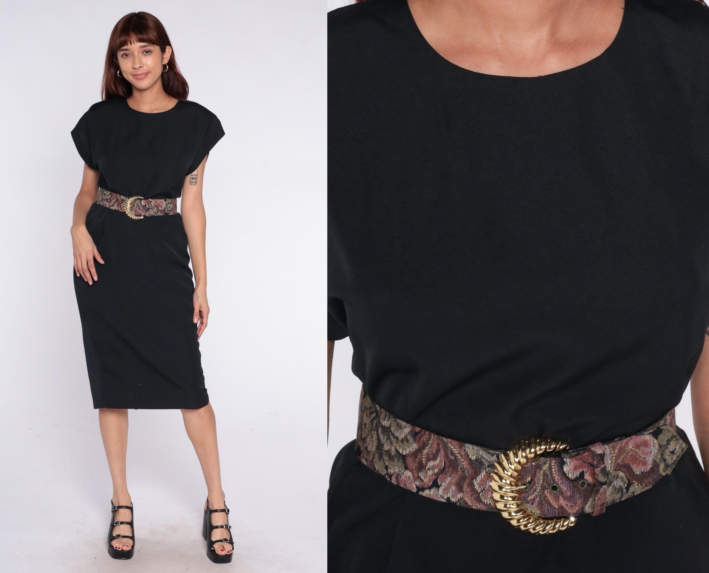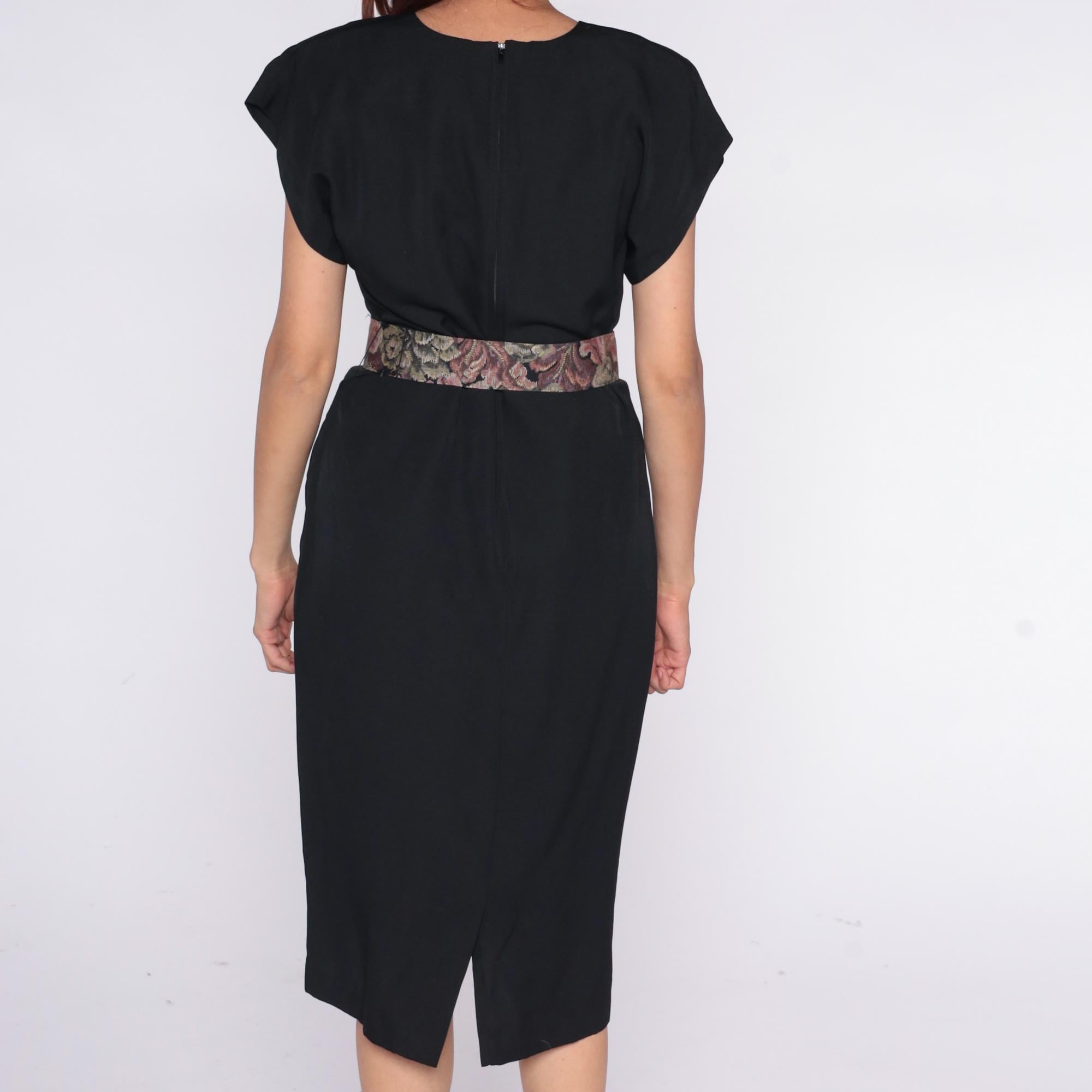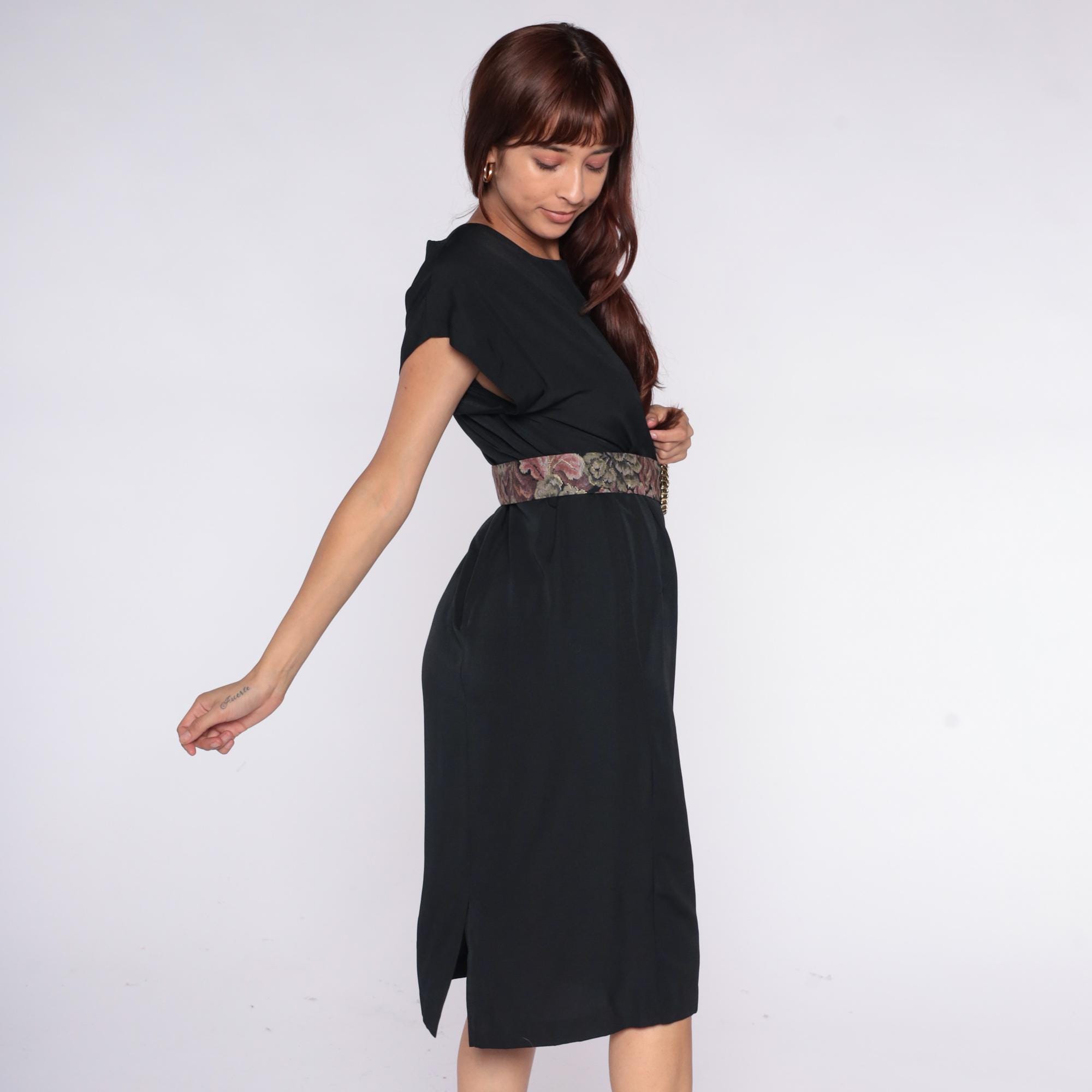 90s black midi dress with crew neckline and short cap sleeves. Straight column silhouette with back zipper closure.