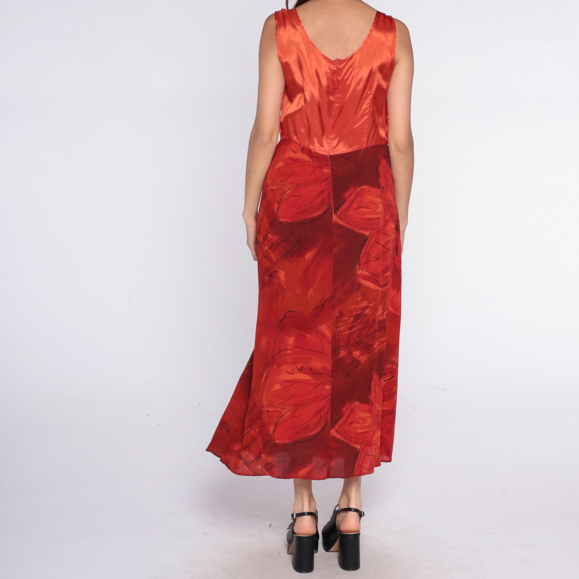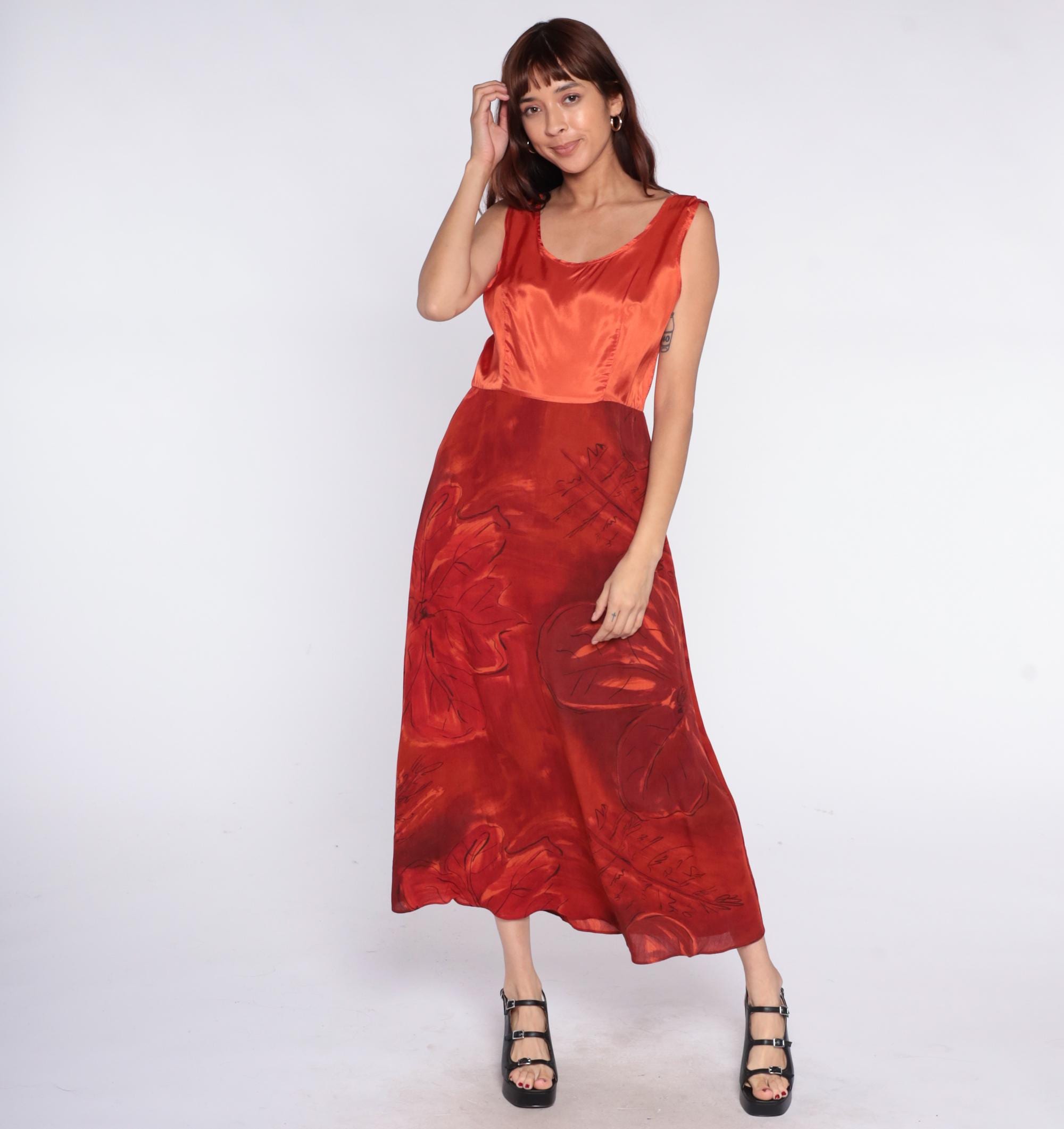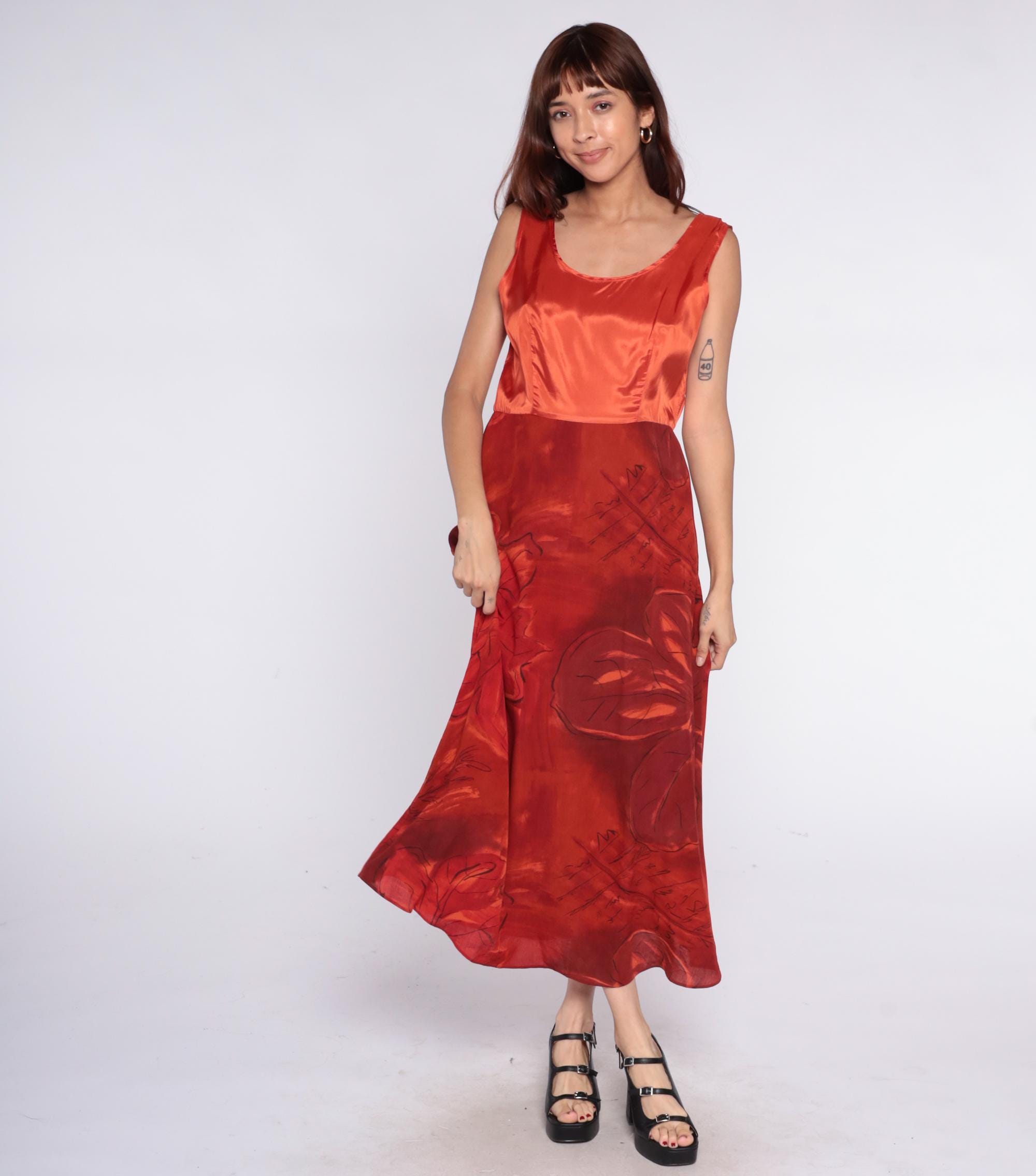 90s red and orange color-blocked maxi dress from Positivity Attitude with sleeveless scoop neck bodice in coral satin, darker red skirt with large-scale floral print. Fitted bodice, ankle-length skirt, back zipper closure.