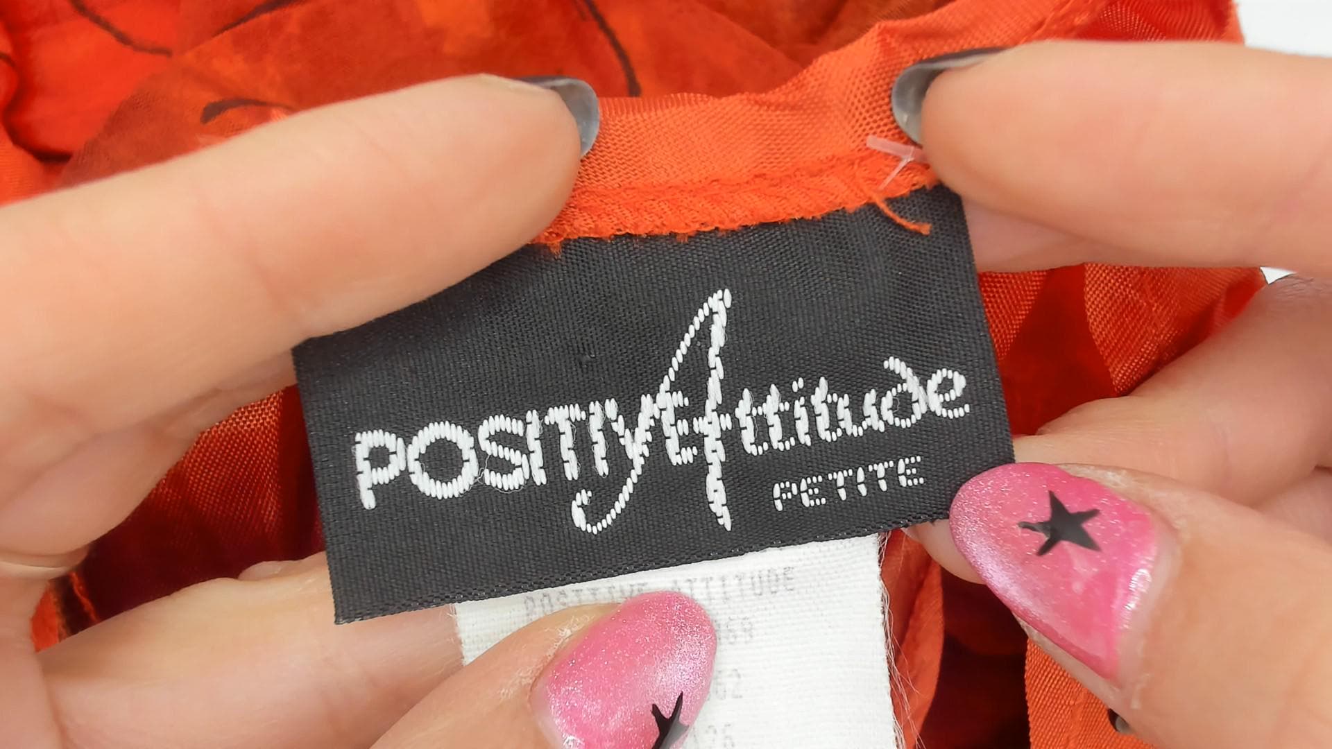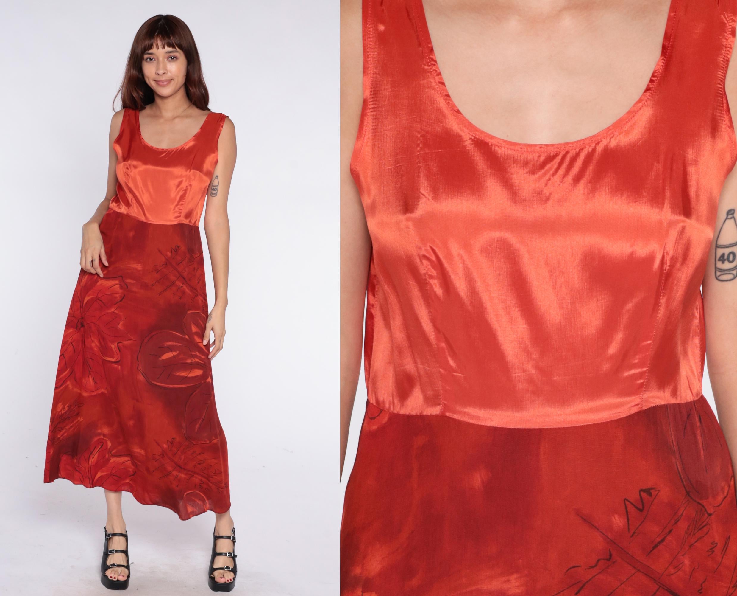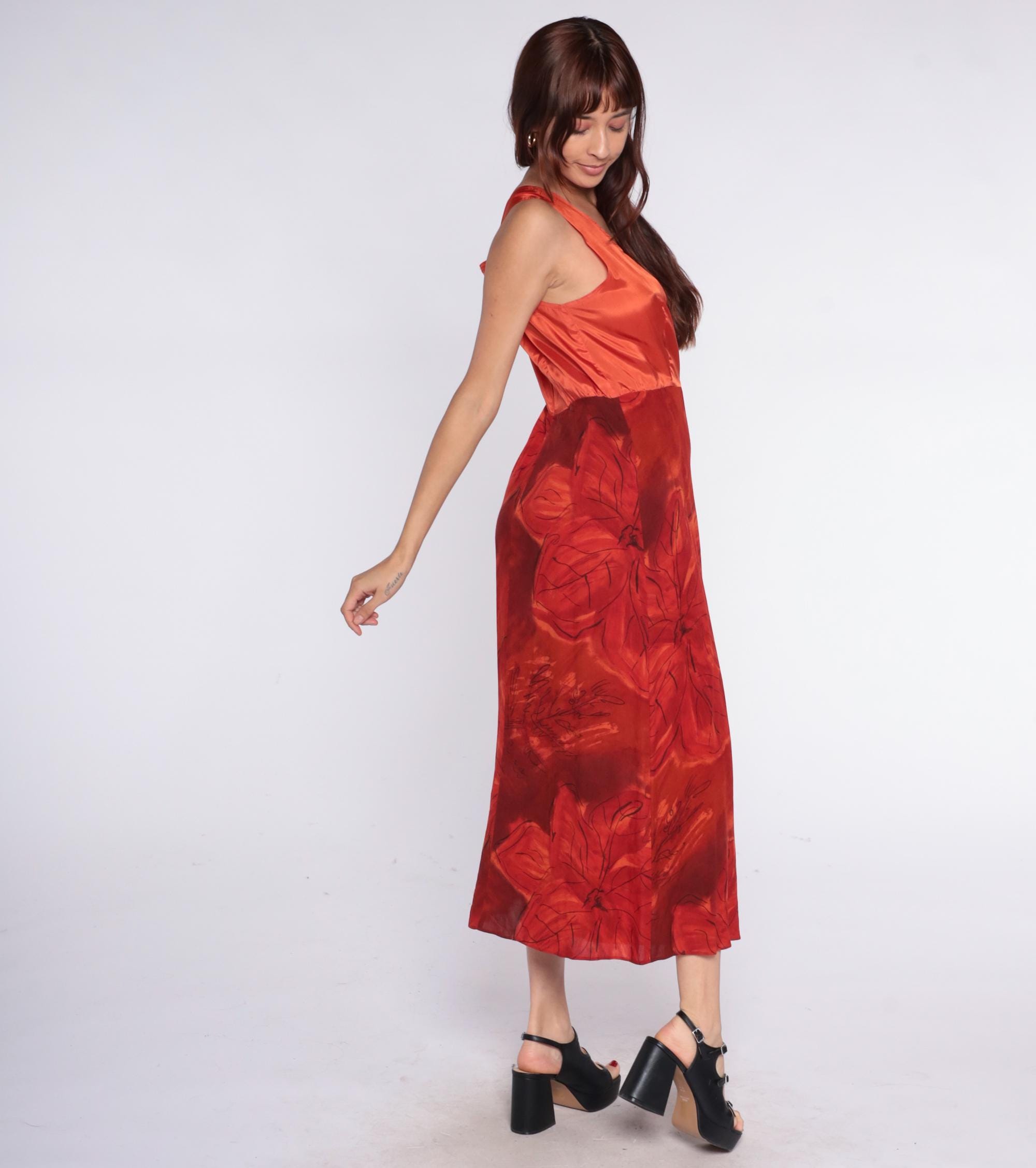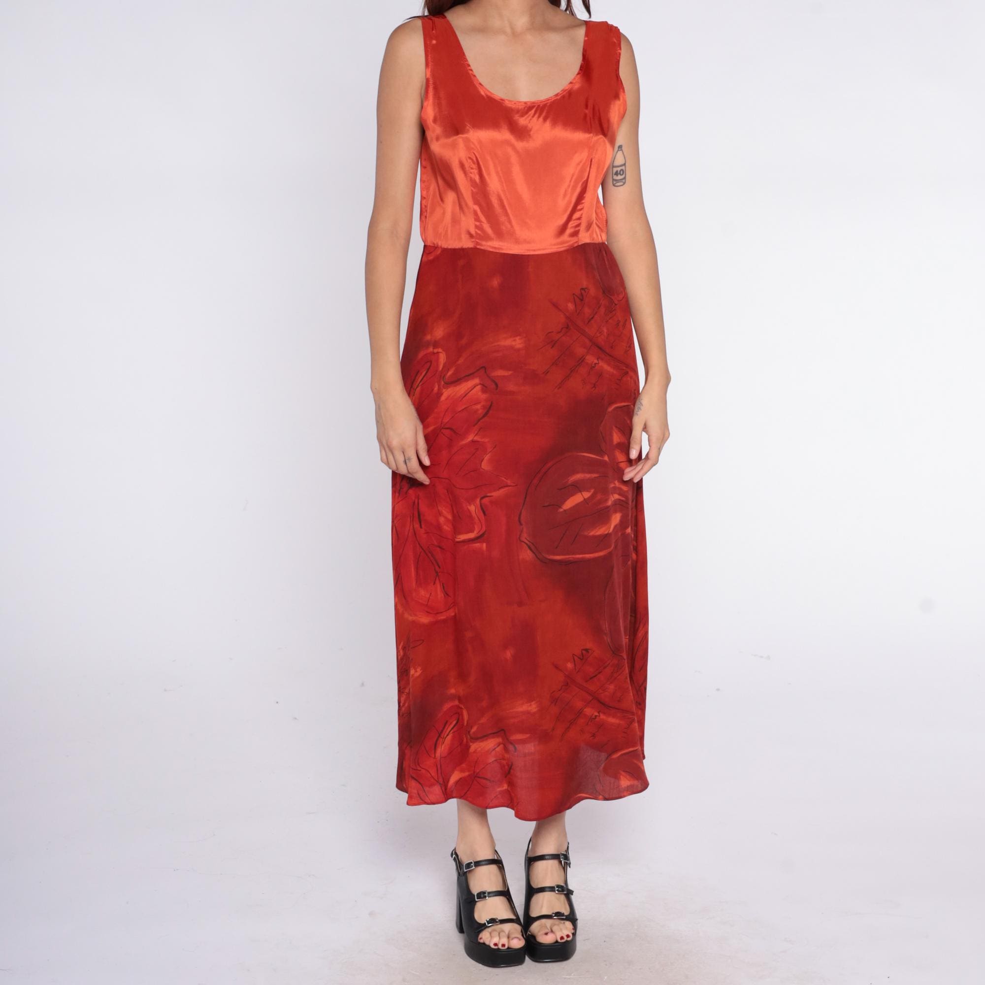 90s red and orange color-blocked maxi dress from Positivity Attitude with sleeveless scoop neck bodice in coral satin, darker red skirt with large-scale floral print. Fitted bodice, ankle-length skirt, back zipper closure.