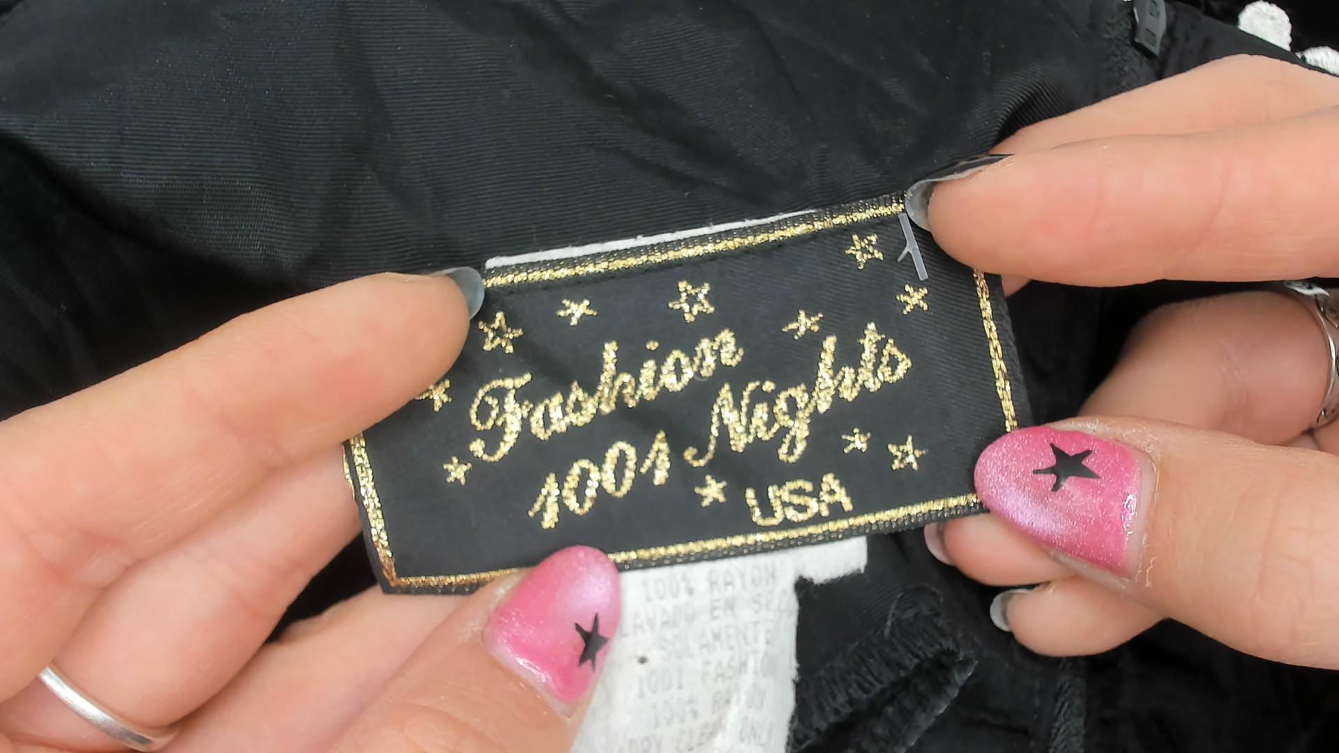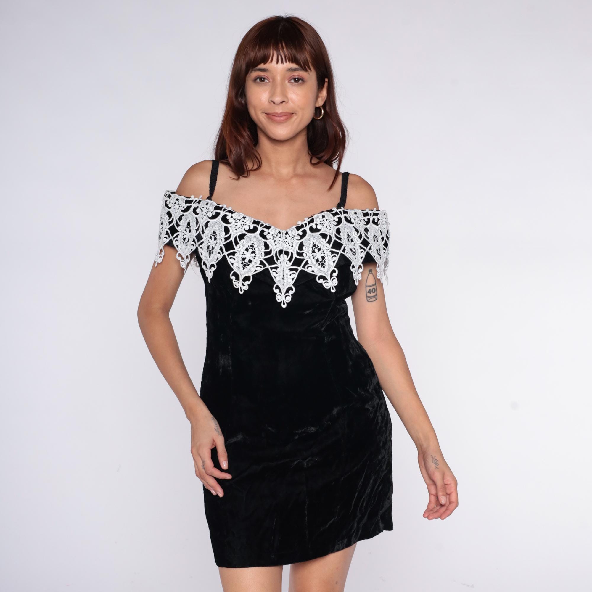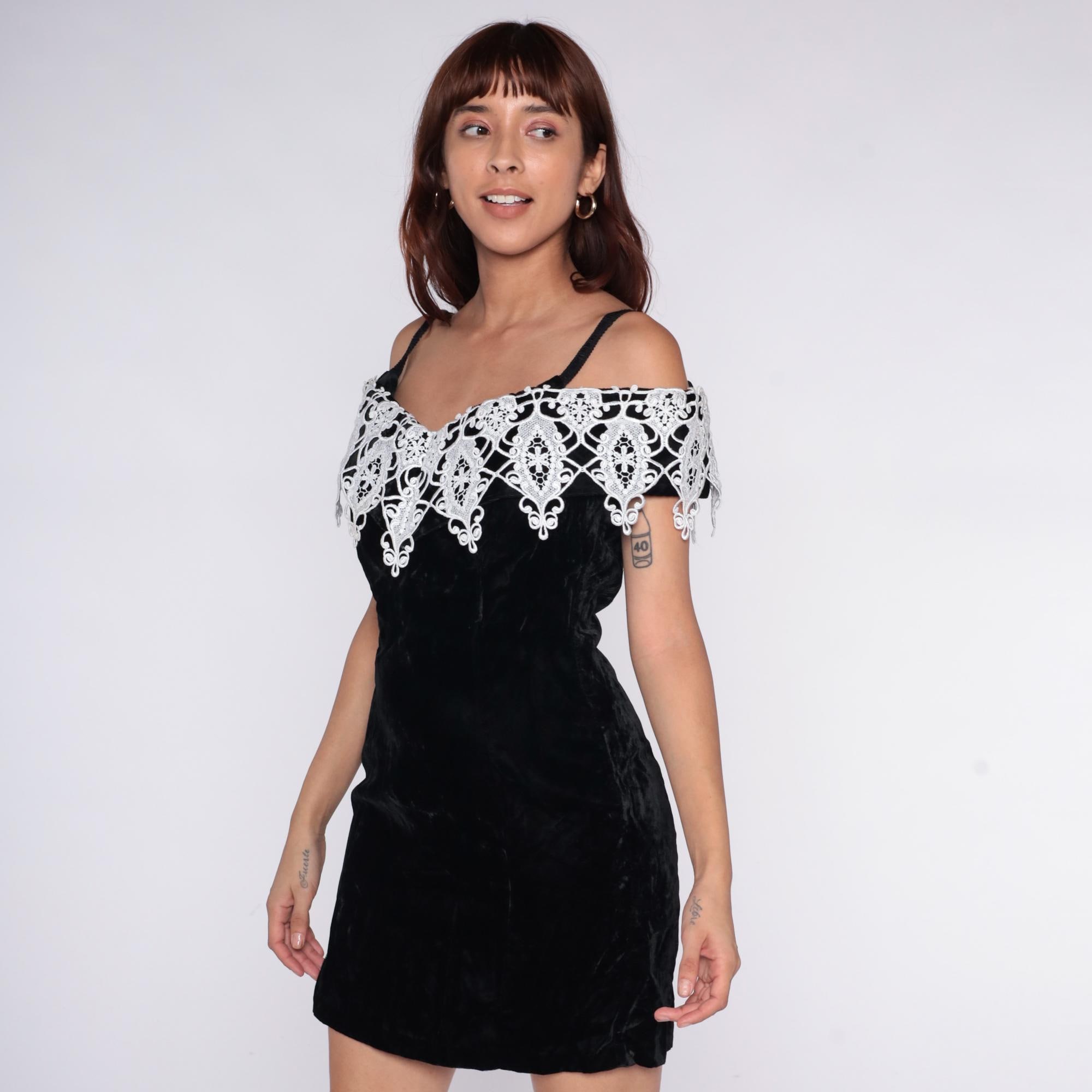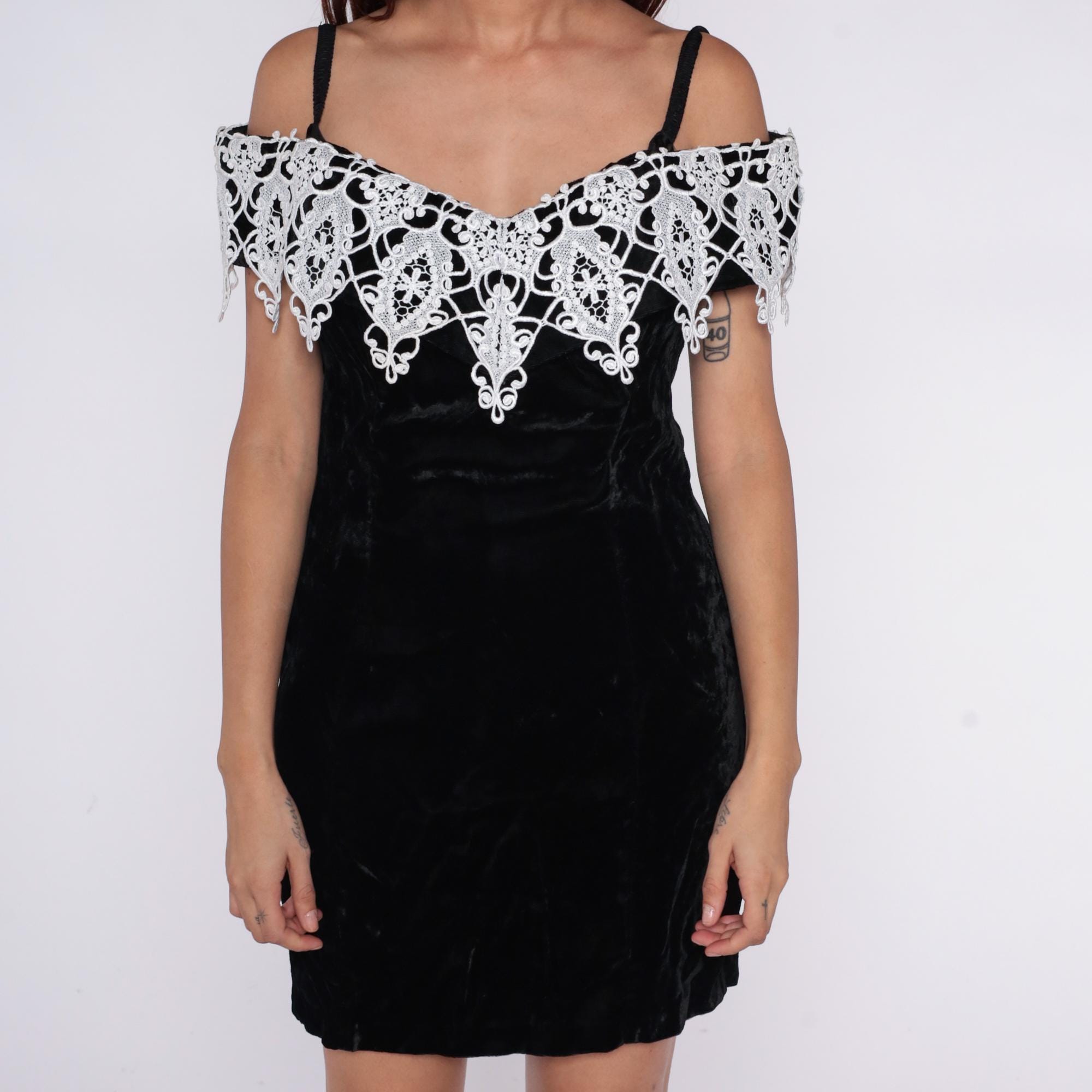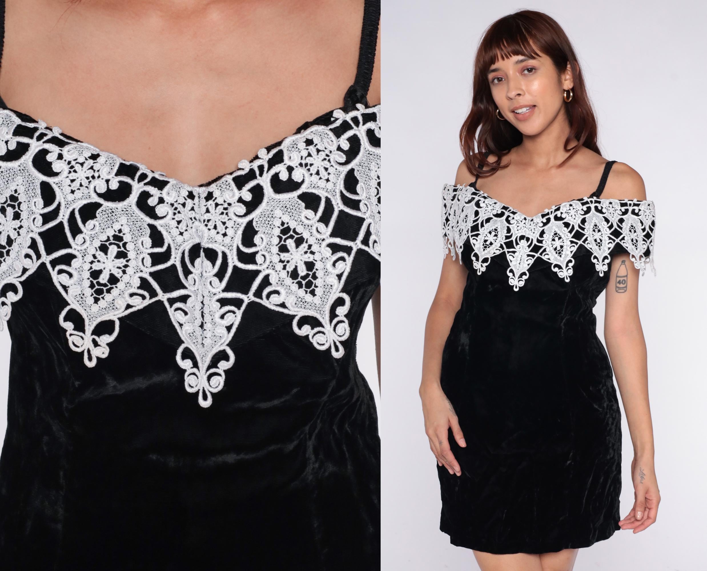 90s black mini dress from Fashion 1001 Nights with ornate white lace collar overlay and scalloped trim across the neckline and shoulders. Off-shoulder style with black spaghetti straps and fitted velvet body.