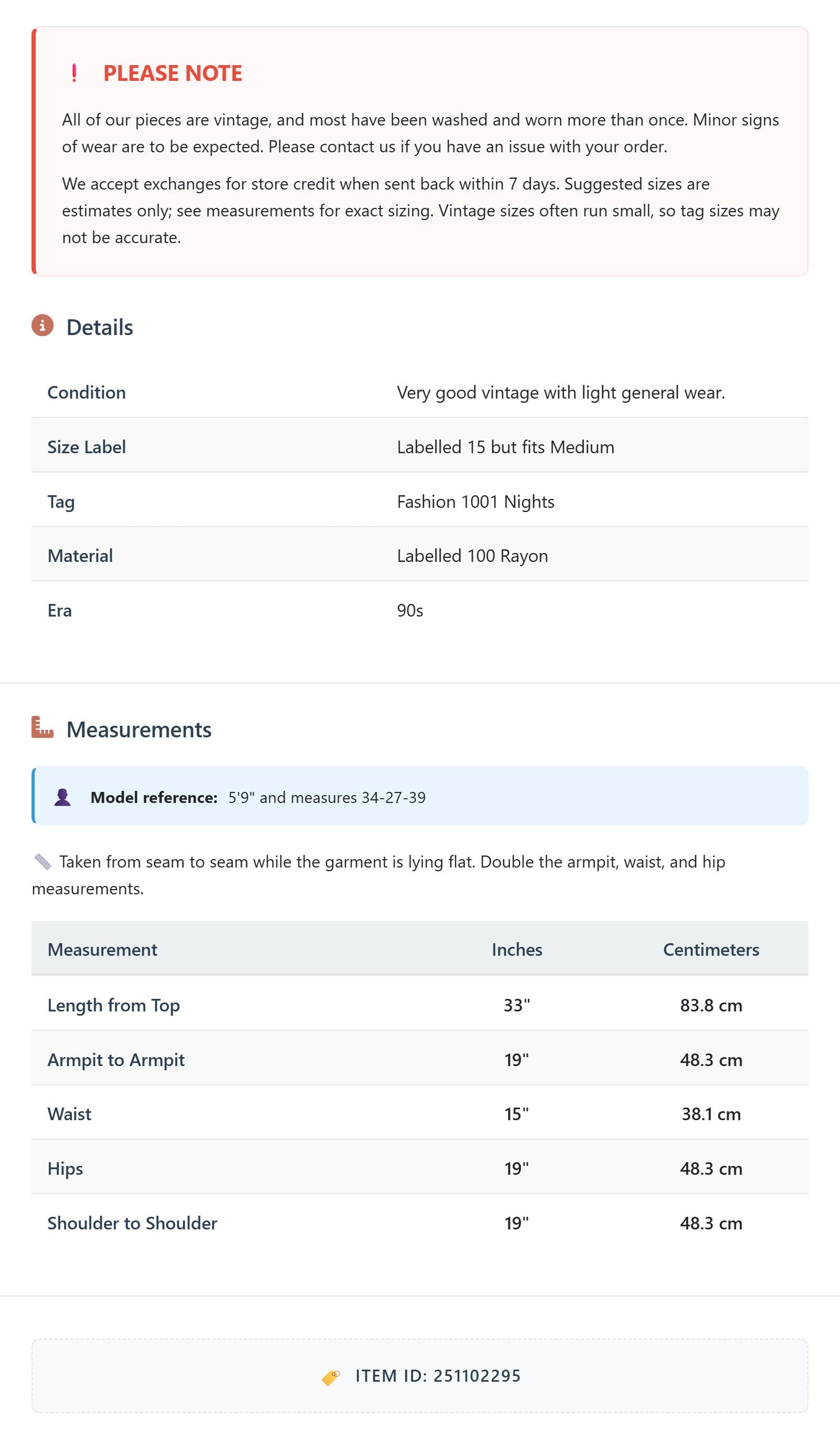 Suggested sizes are estimates only; see measurements for exact sizing. Vintage sizes often run small, so tag sizes may not be accurate.