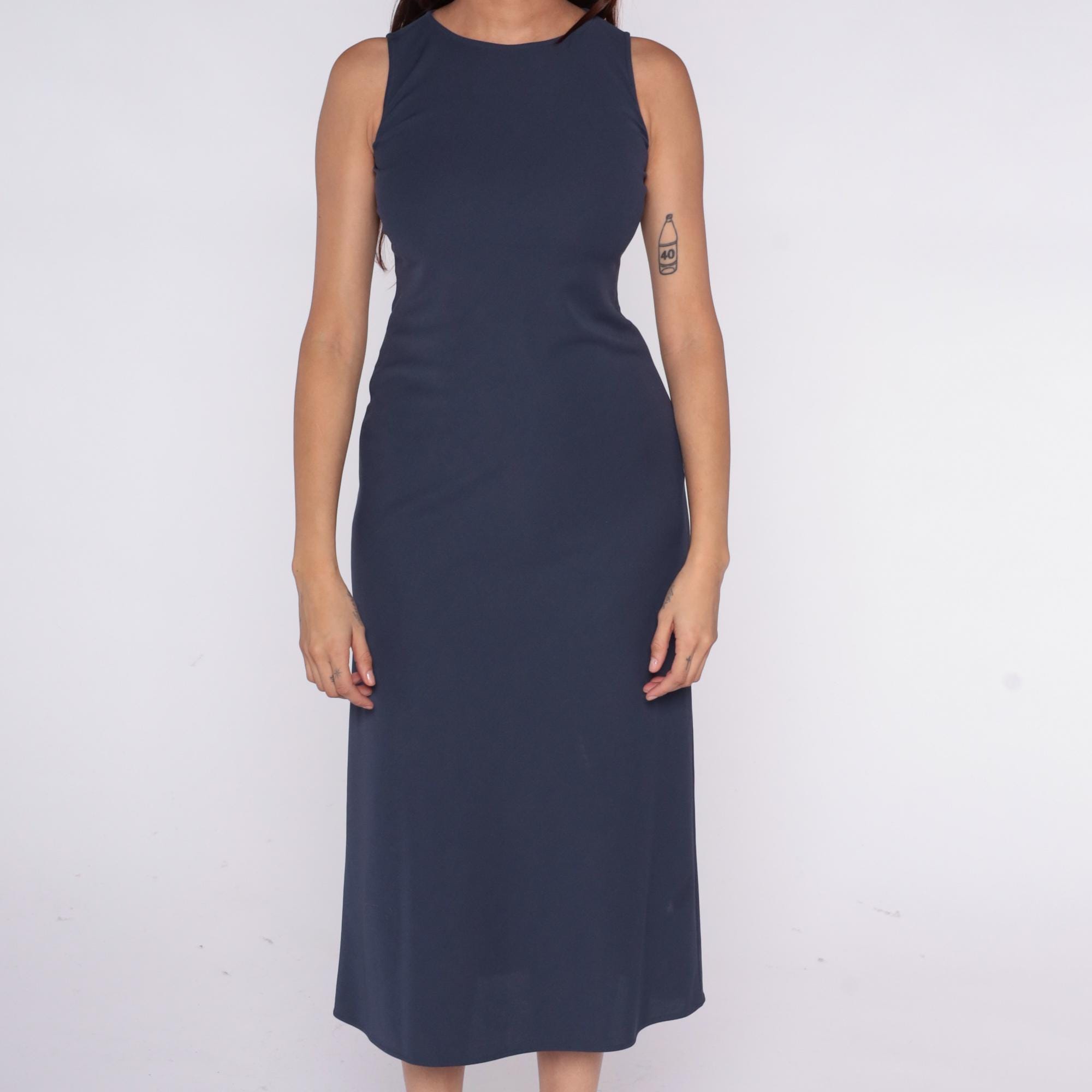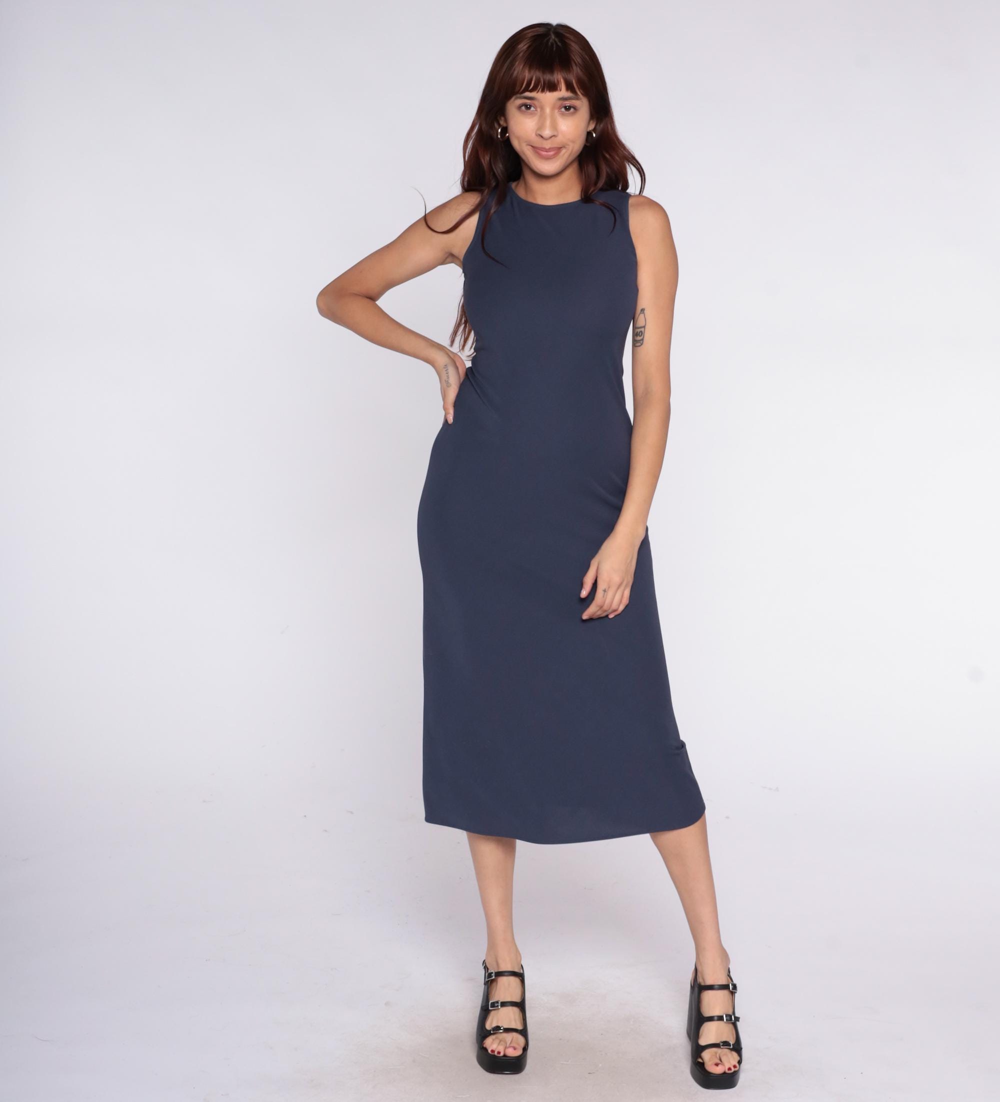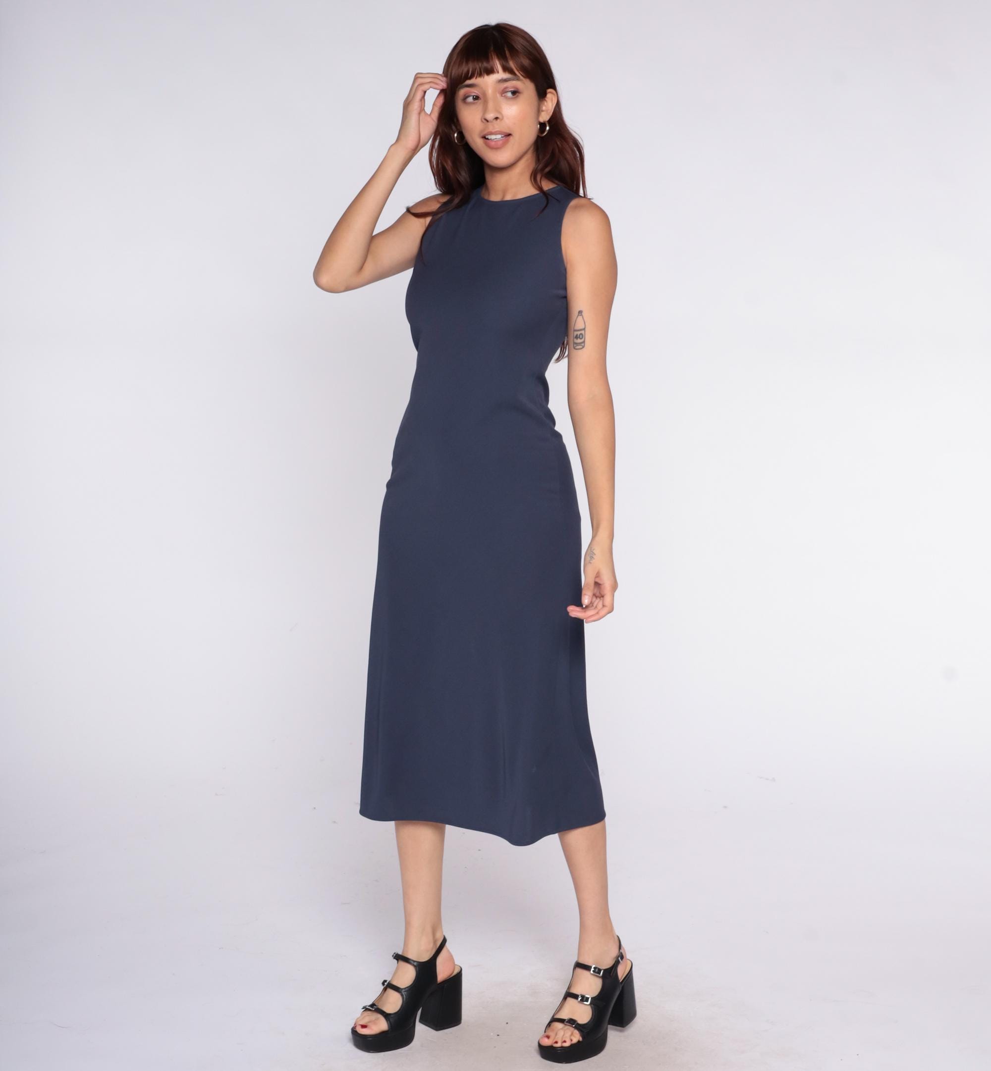 90s navy sleeveless midi dress from Jones New York with high round neckline and fitted silhouette through the body. Small keyhole opening with button closure at back neck.
