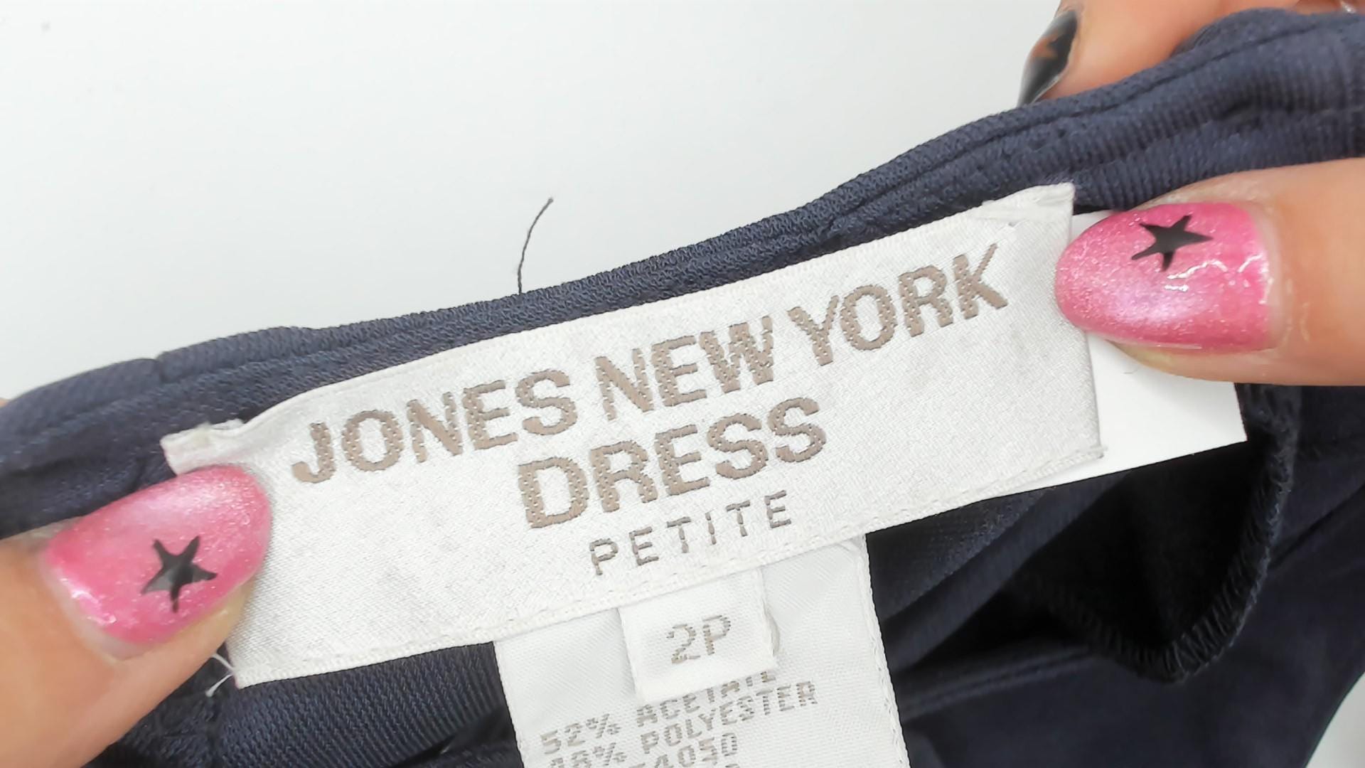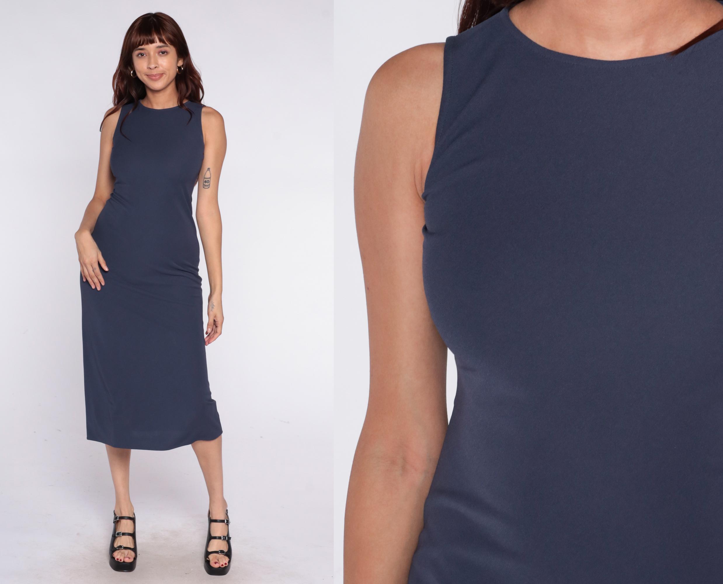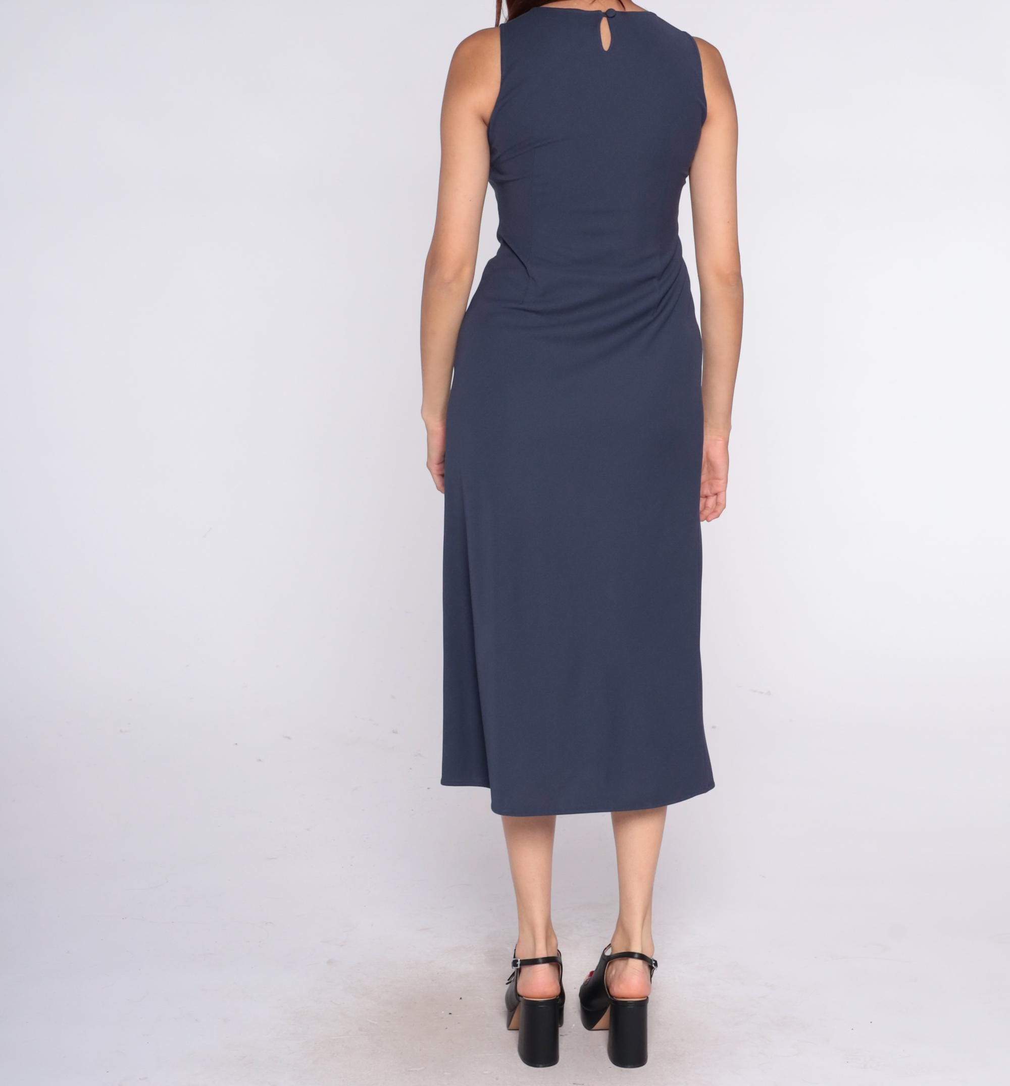 90s navy sleeveless midi dress from Jones New York with high round neckline and fitted silhouette through the body. Small keyhole opening with button closure at back neck.