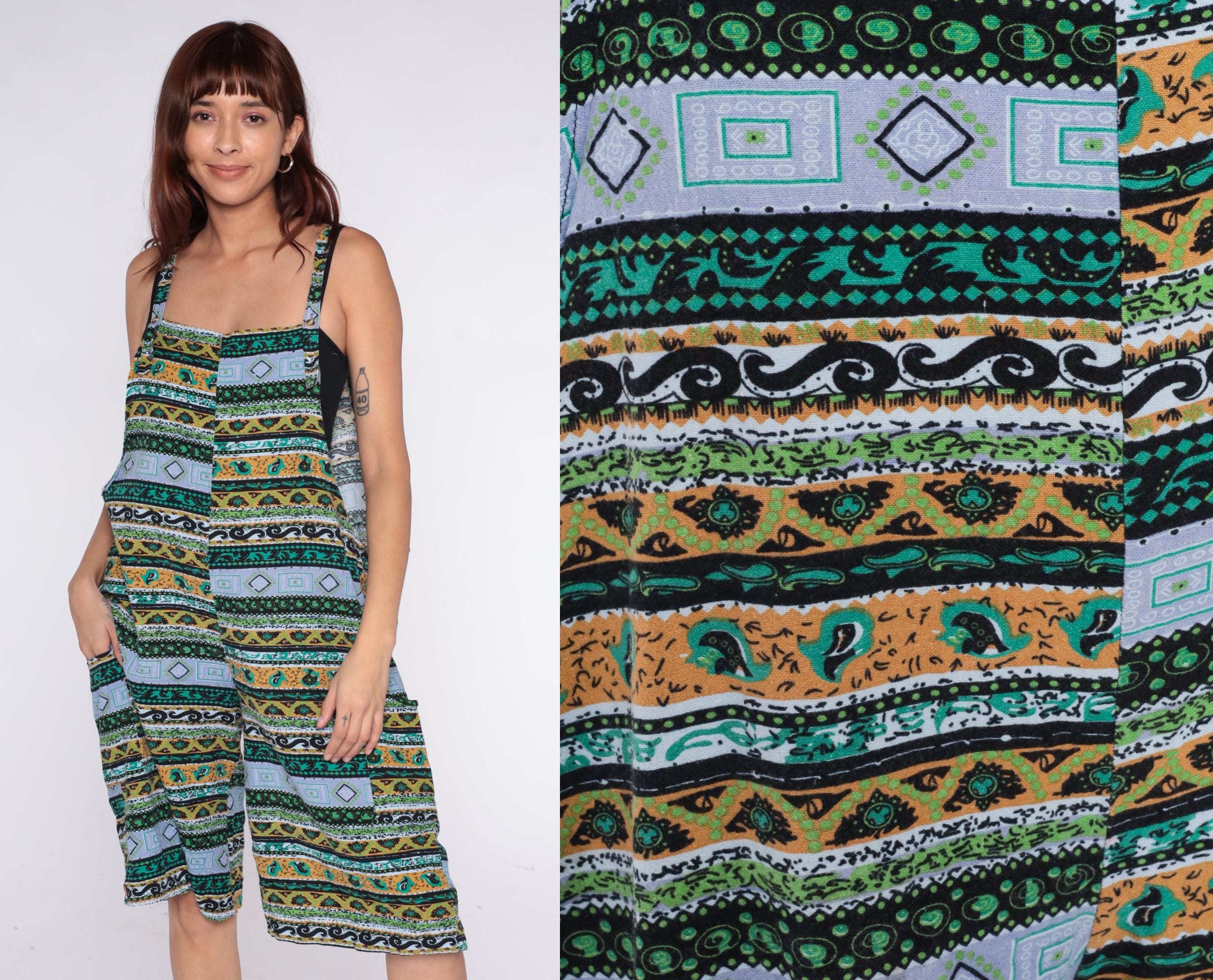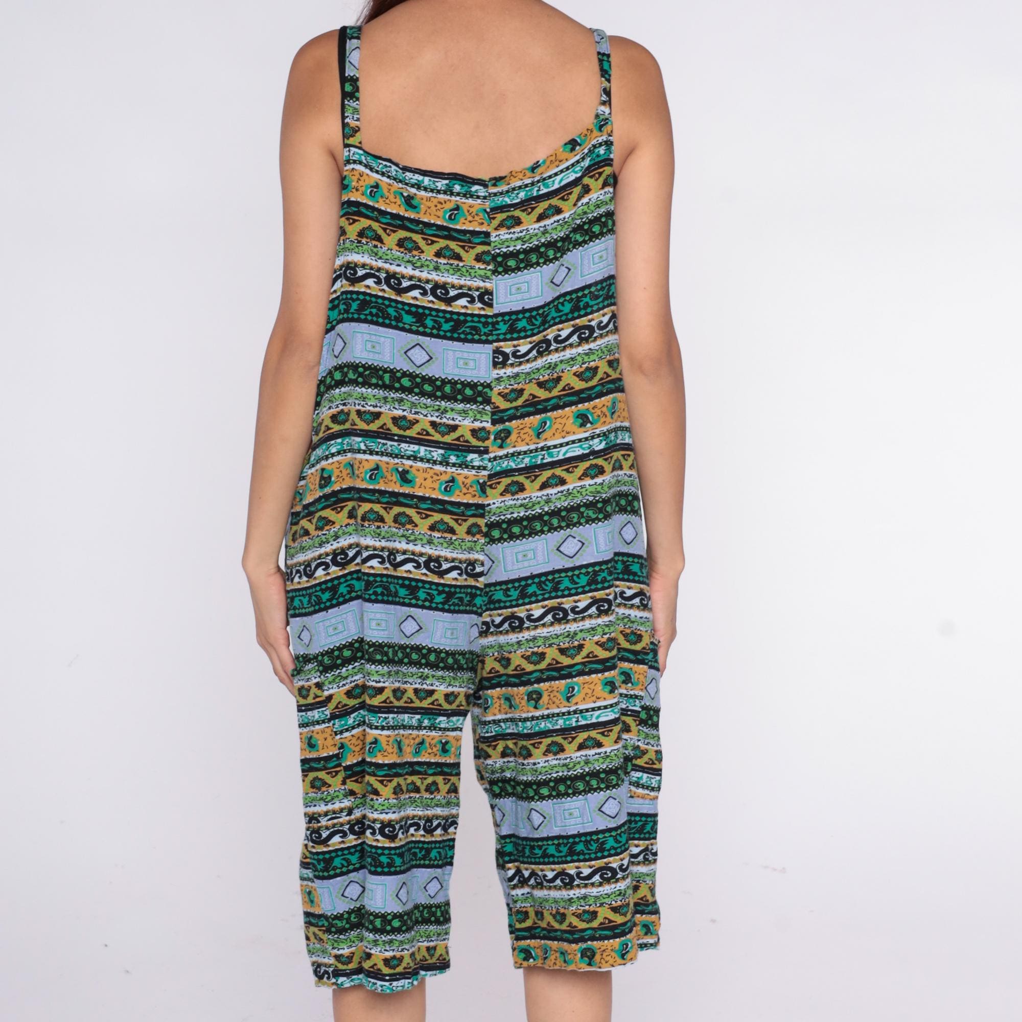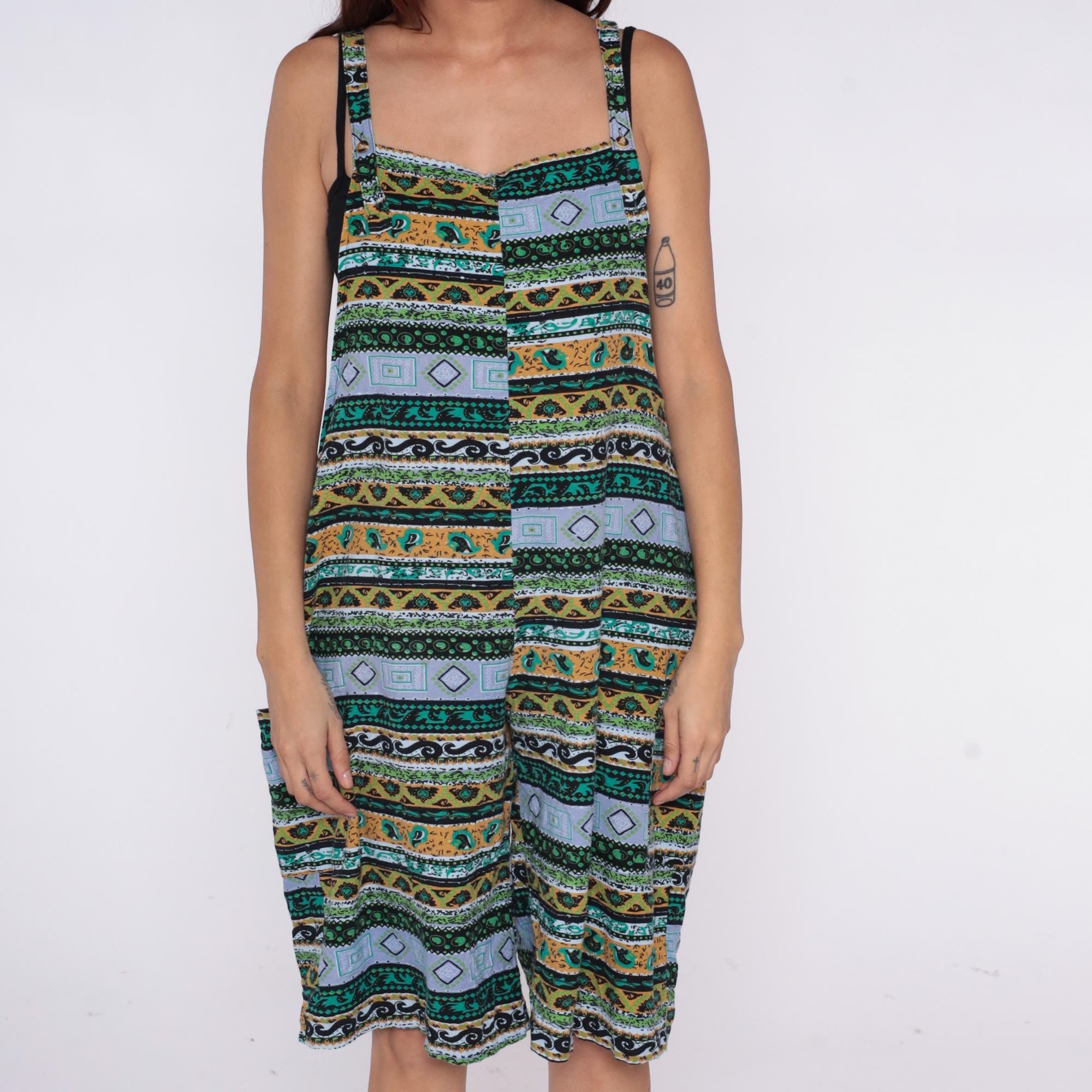 Y2k sleeveless romper with horizontal striped pattern in teal, orange, mustard, green, black, and light purple geometric bands across the fabric. Tank-style straps, scoop neckline, fitted bodice with elastic waistband, knee-length shorts.