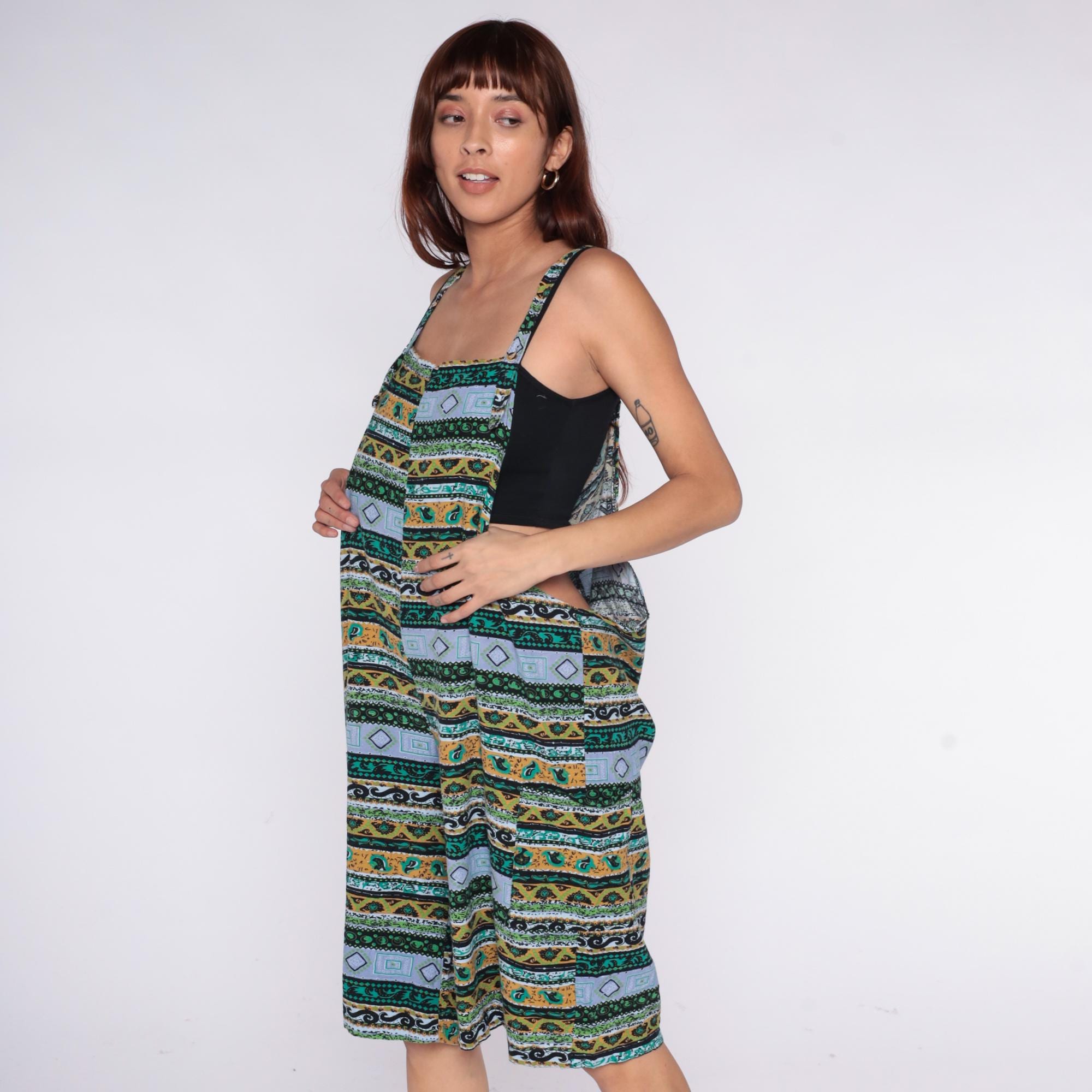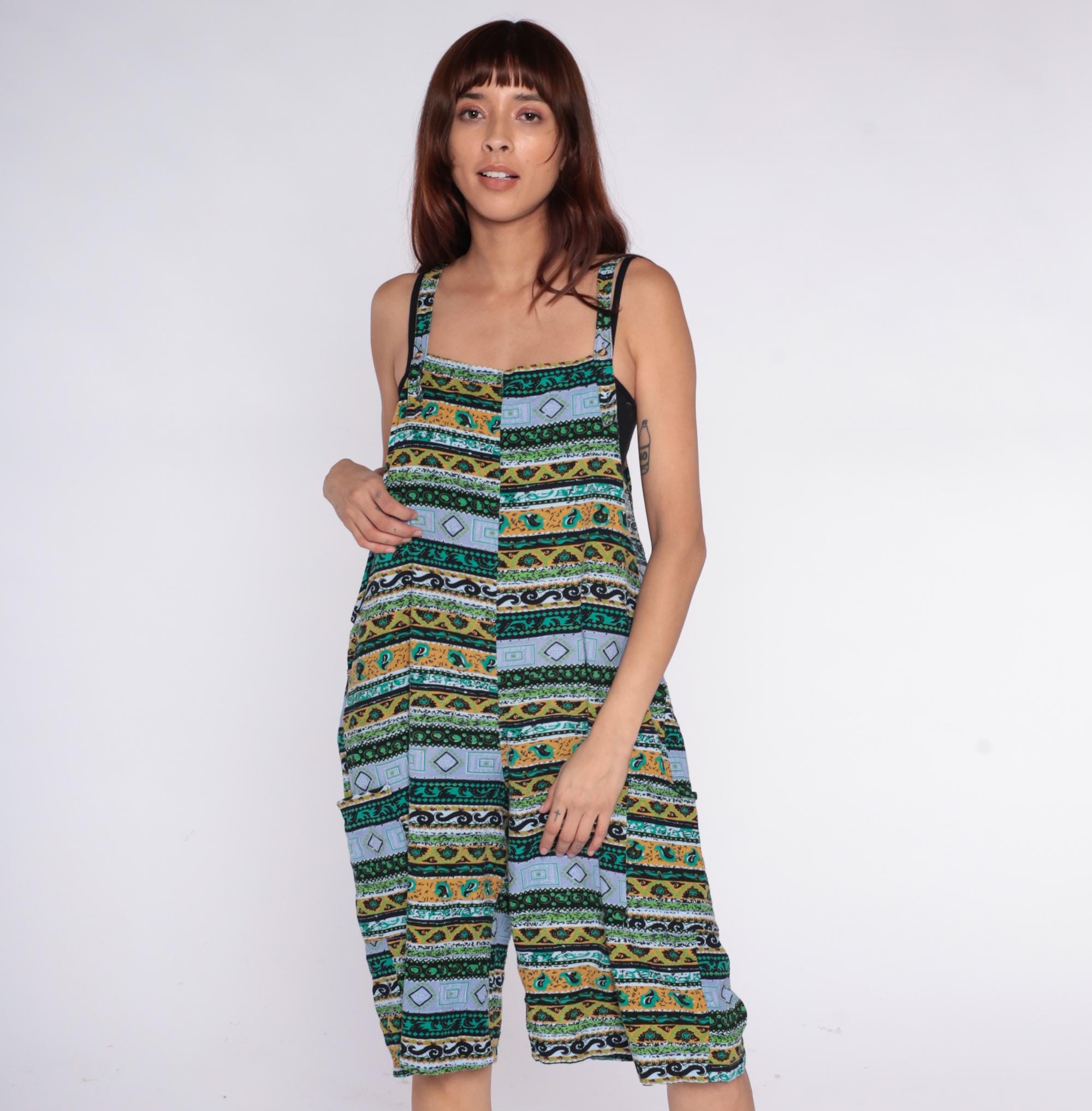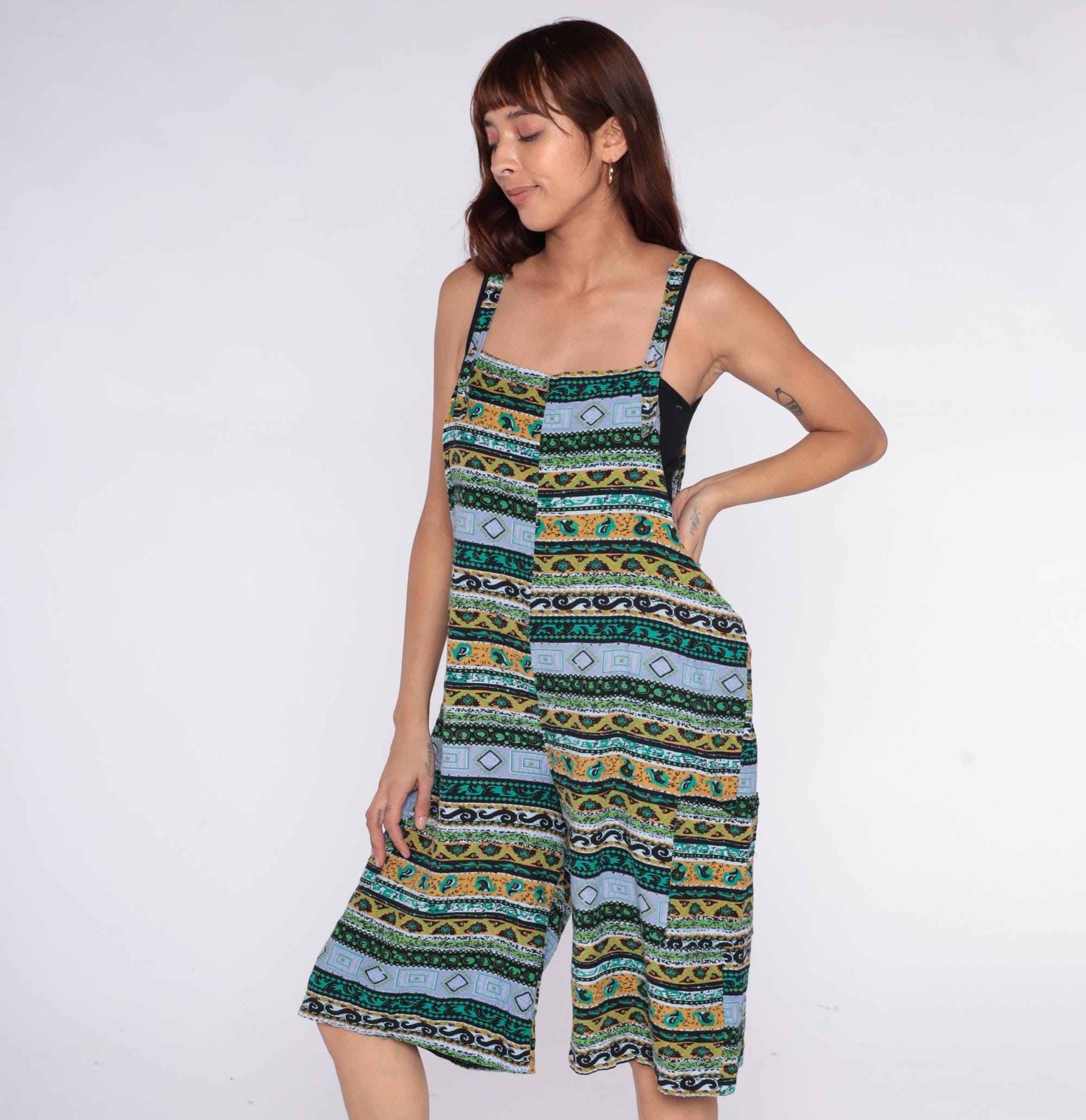 Y2k sleeveless romper with horizontal striped pattern in teal, orange, mustard, green, black, and light purple geometric bands across the fabric. Tank-style straps, scoop neckline, fitted bodice with elastic waistband, knee-length shorts.