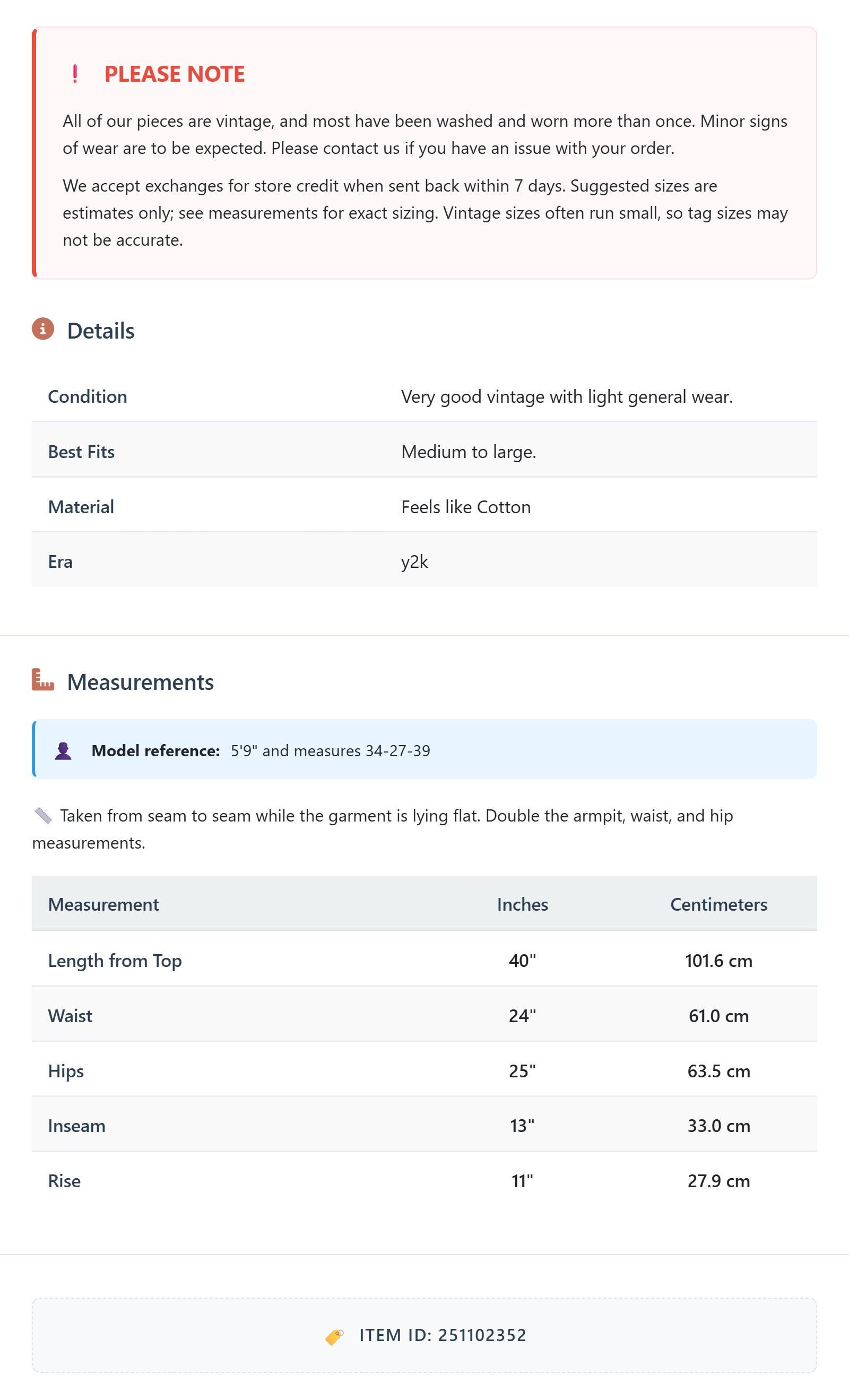 Suggested sizes are estimates only; see measurements for exact sizing. Vintage sizes often run small, so tag sizes may not be accurate.