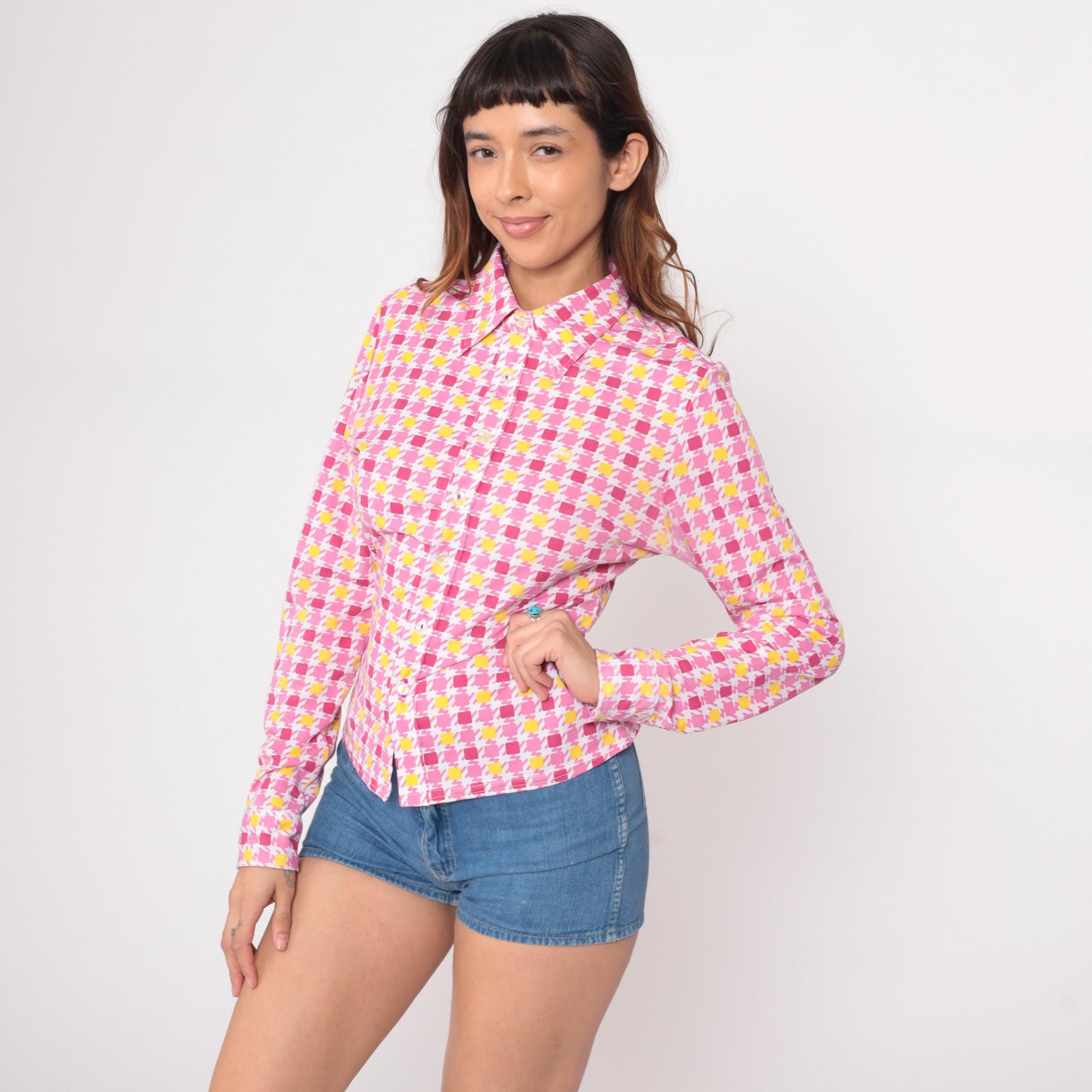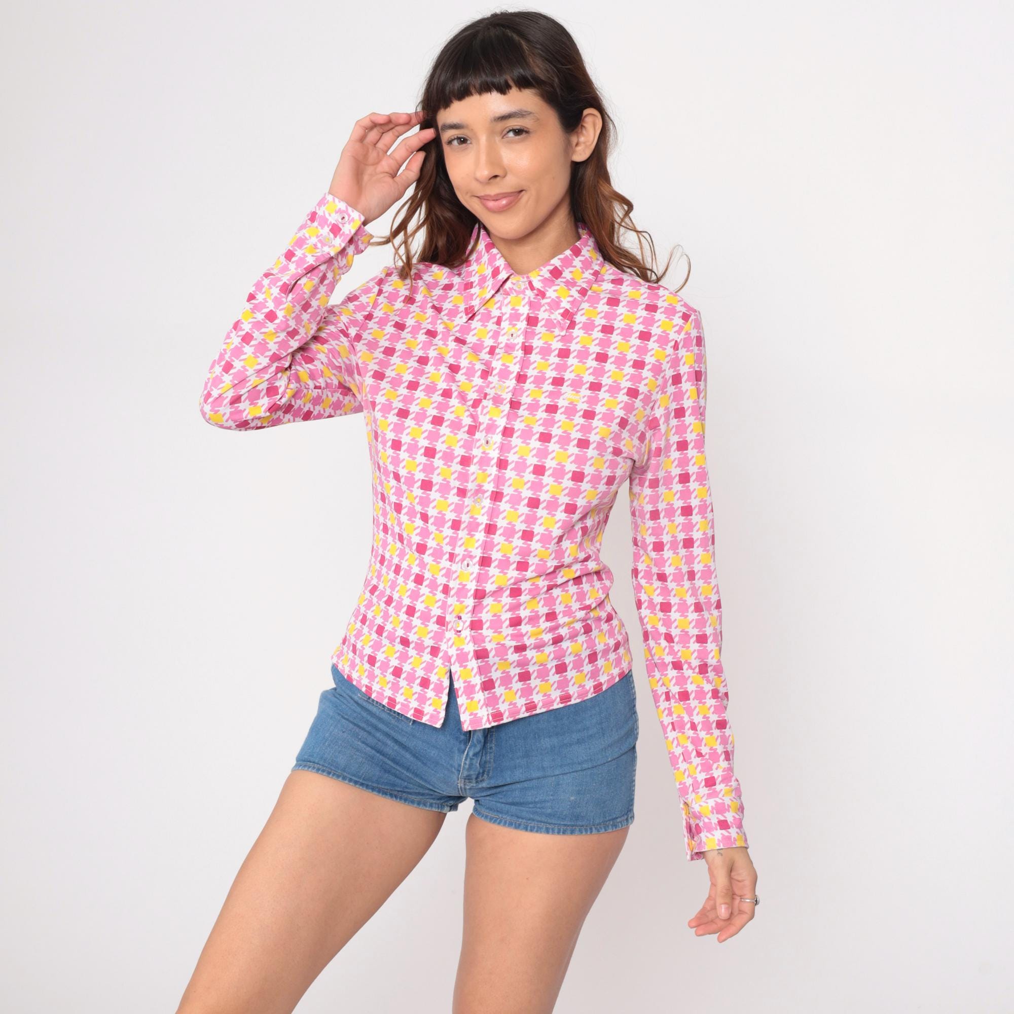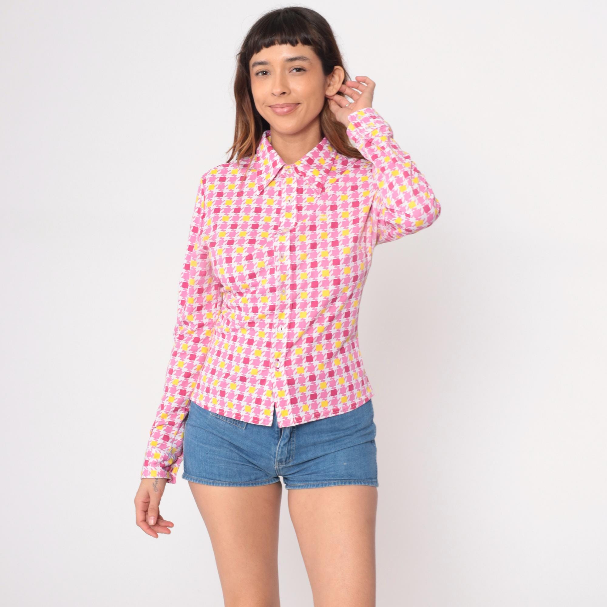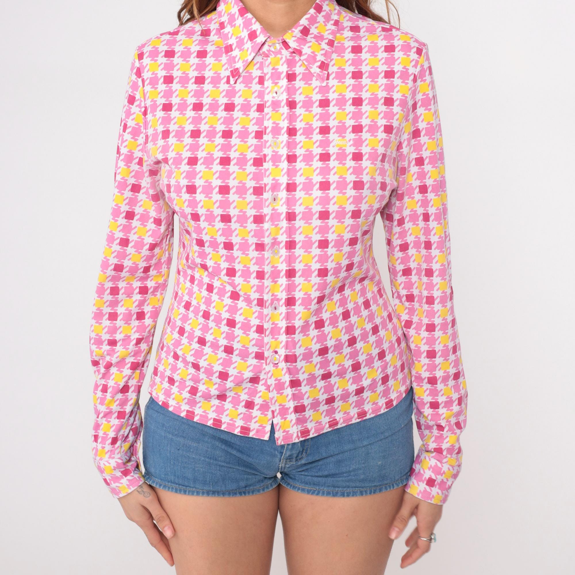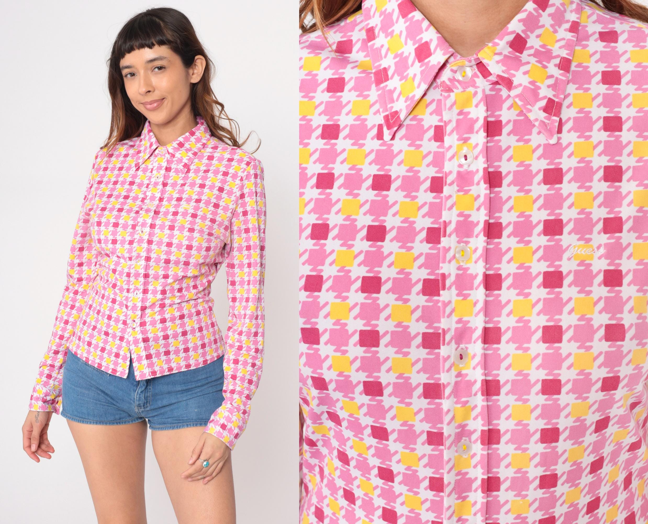 90s pink and yellow geometric square print blouse from Guess with point collar and long sleeves. Button front closure with fitted silhouette. Repeating pattern of darker pink, lighter pink, and yellow squares across white background.