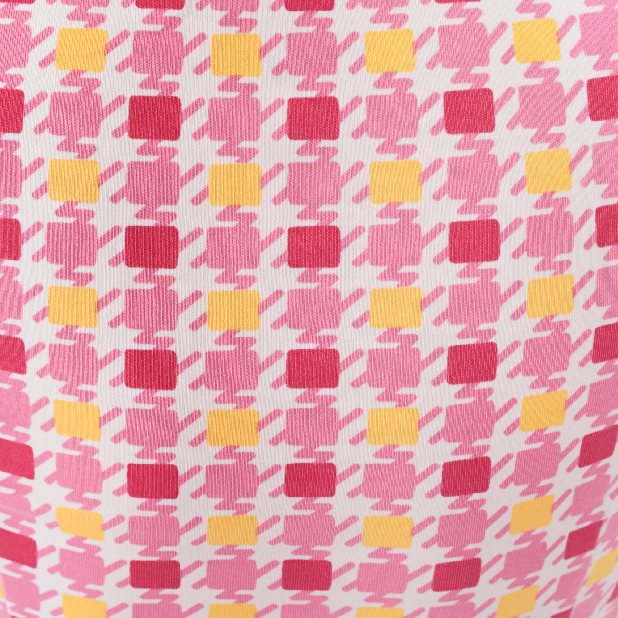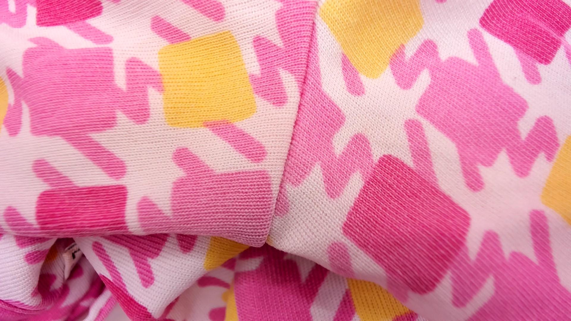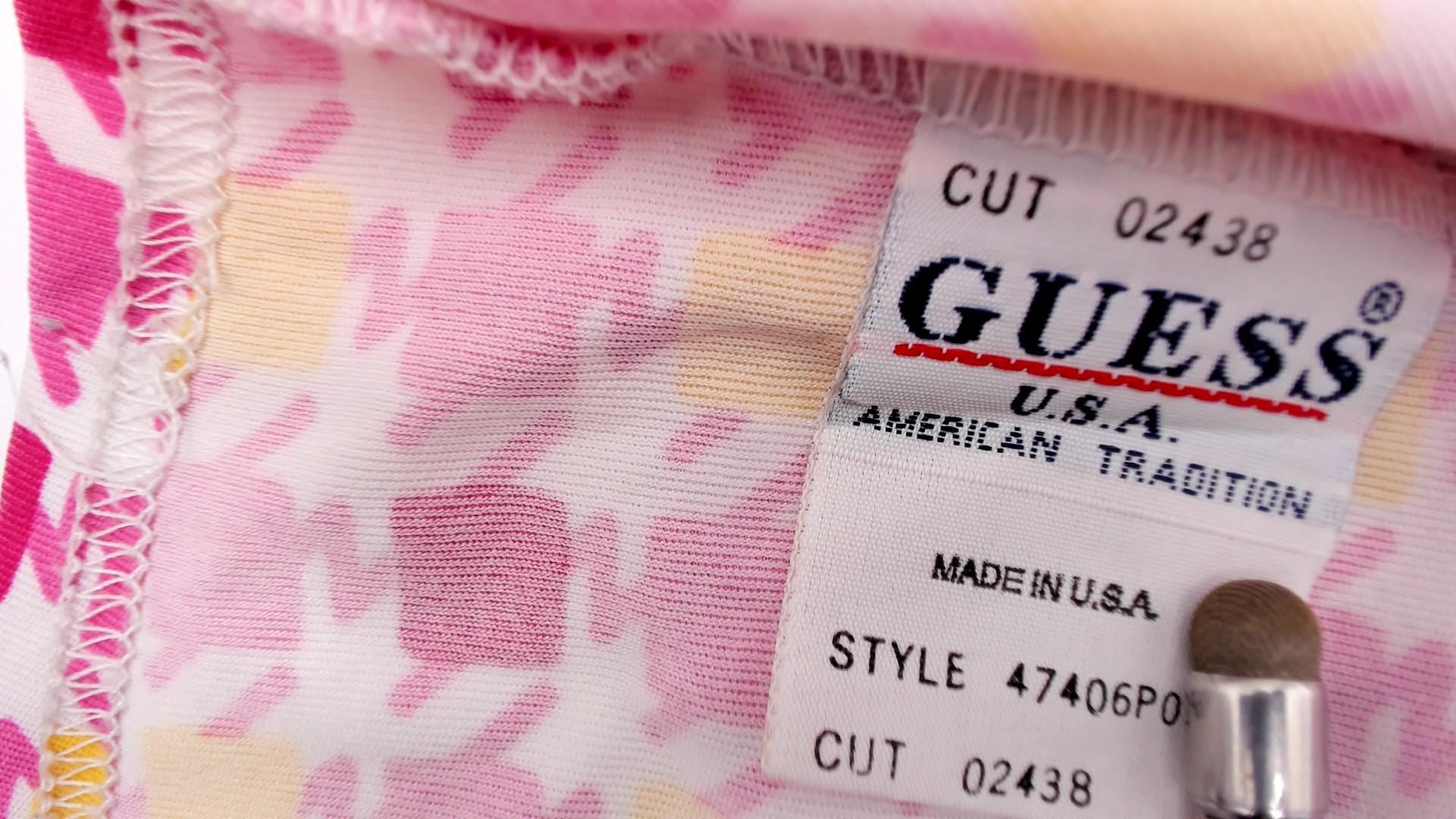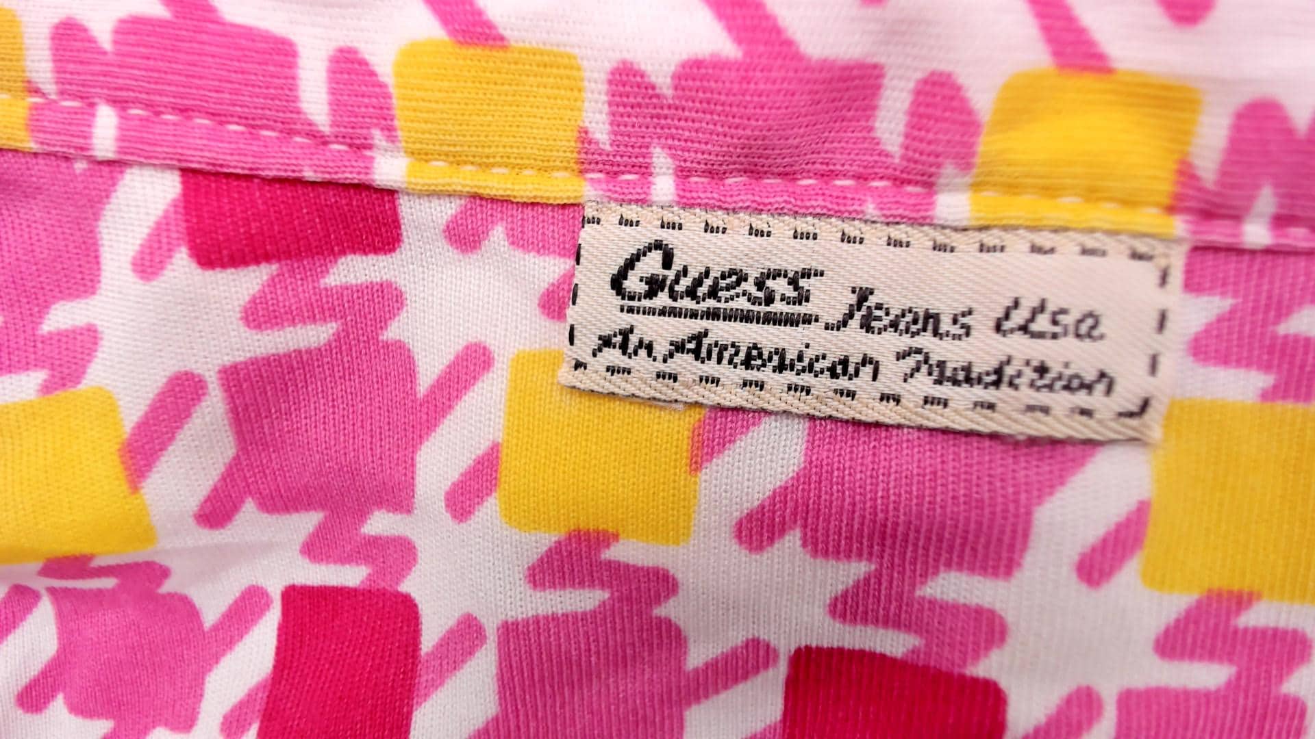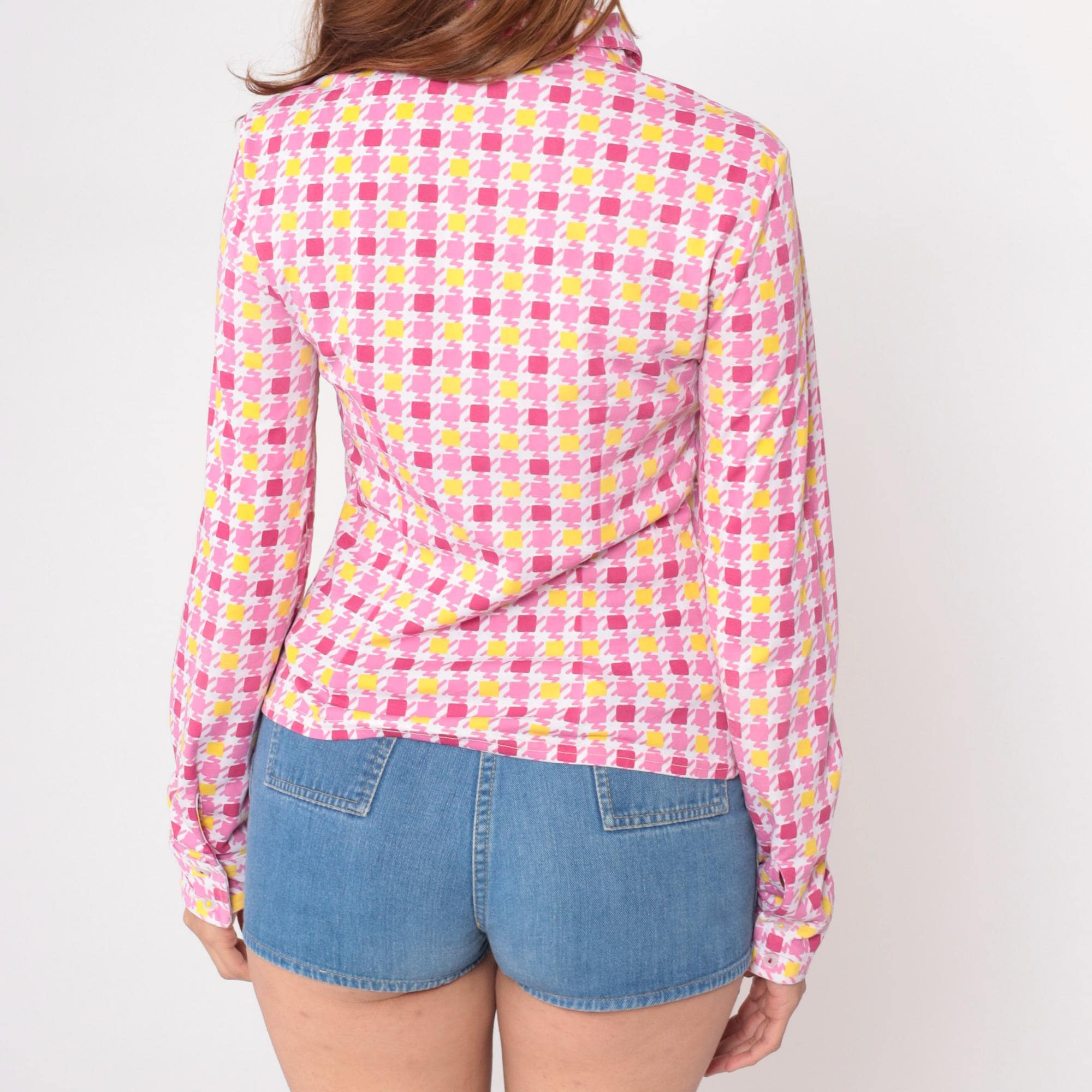 90s pink and yellow geometric square print blouse from Guess with point collar and long sleeves. Button front closure with fitted silhouette. Repeating pattern of darker pink, lighter pink, and yellow squares across white background.