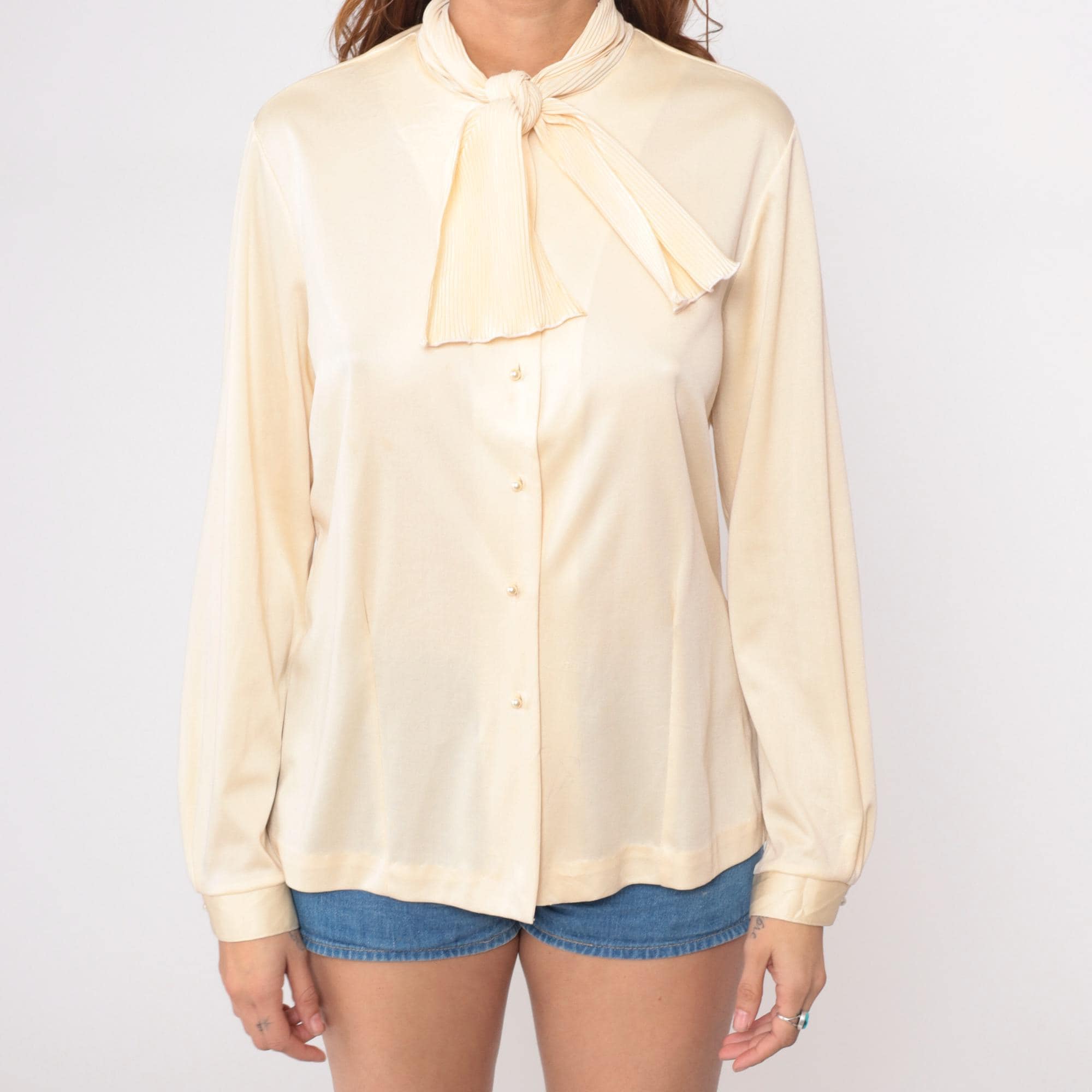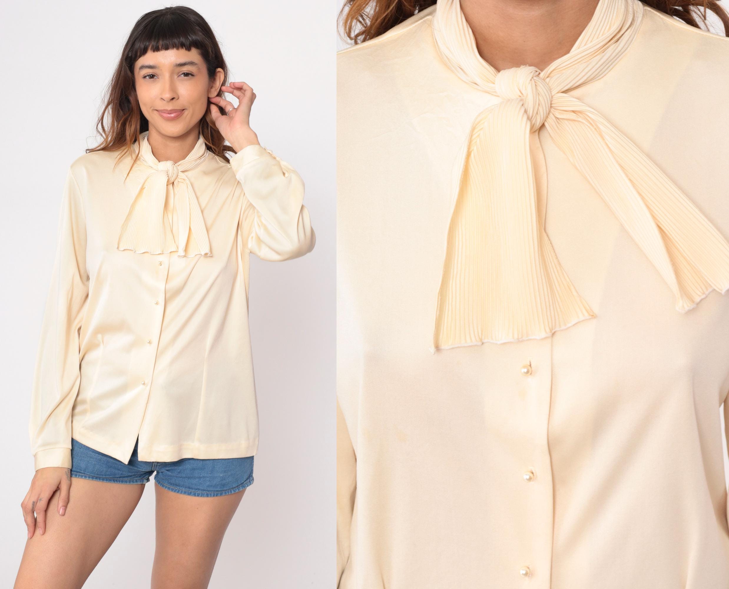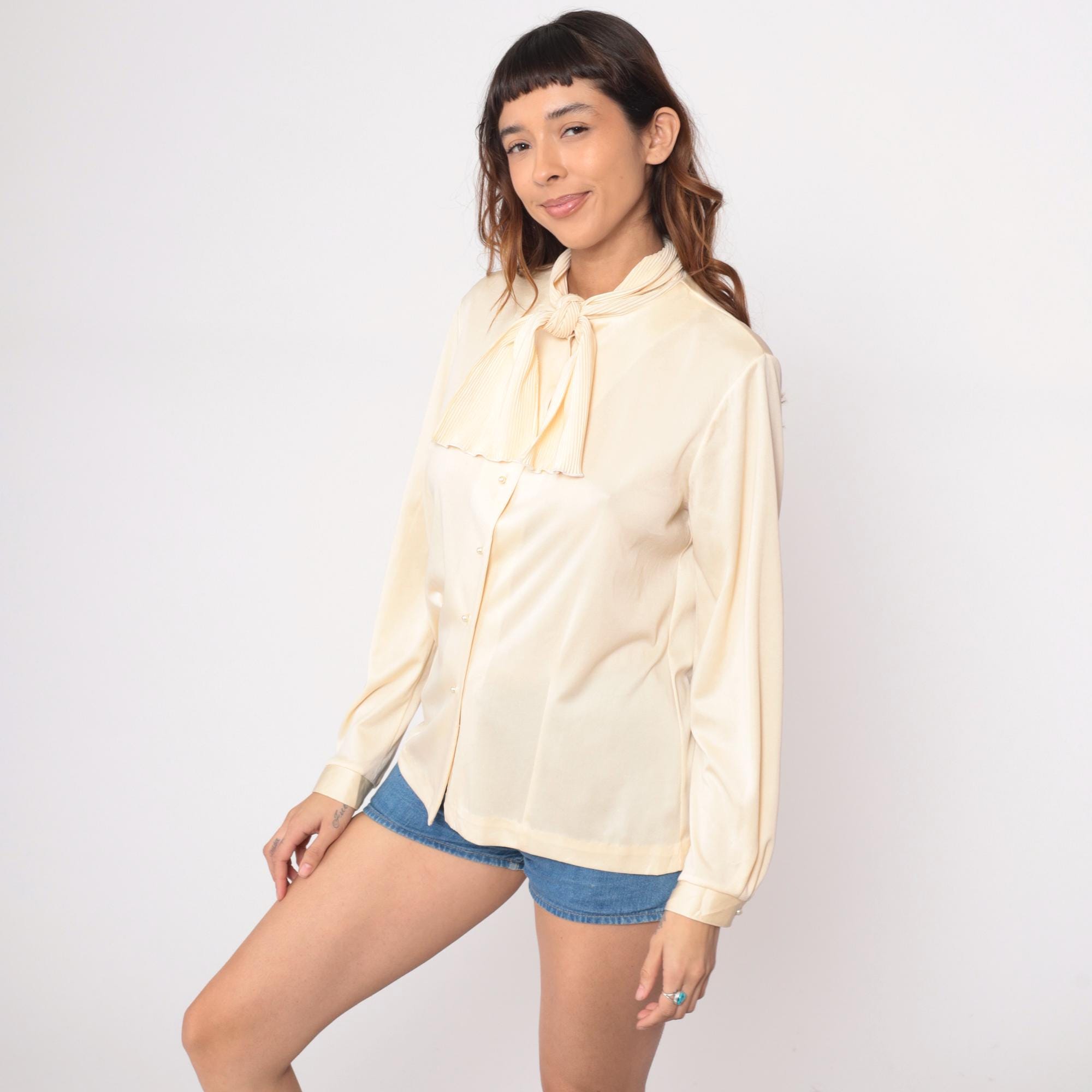 80s cream pussy bow blouse from perception with long pleated tie straps at the neckline. Button front closure with long sleeves and button cuffs.