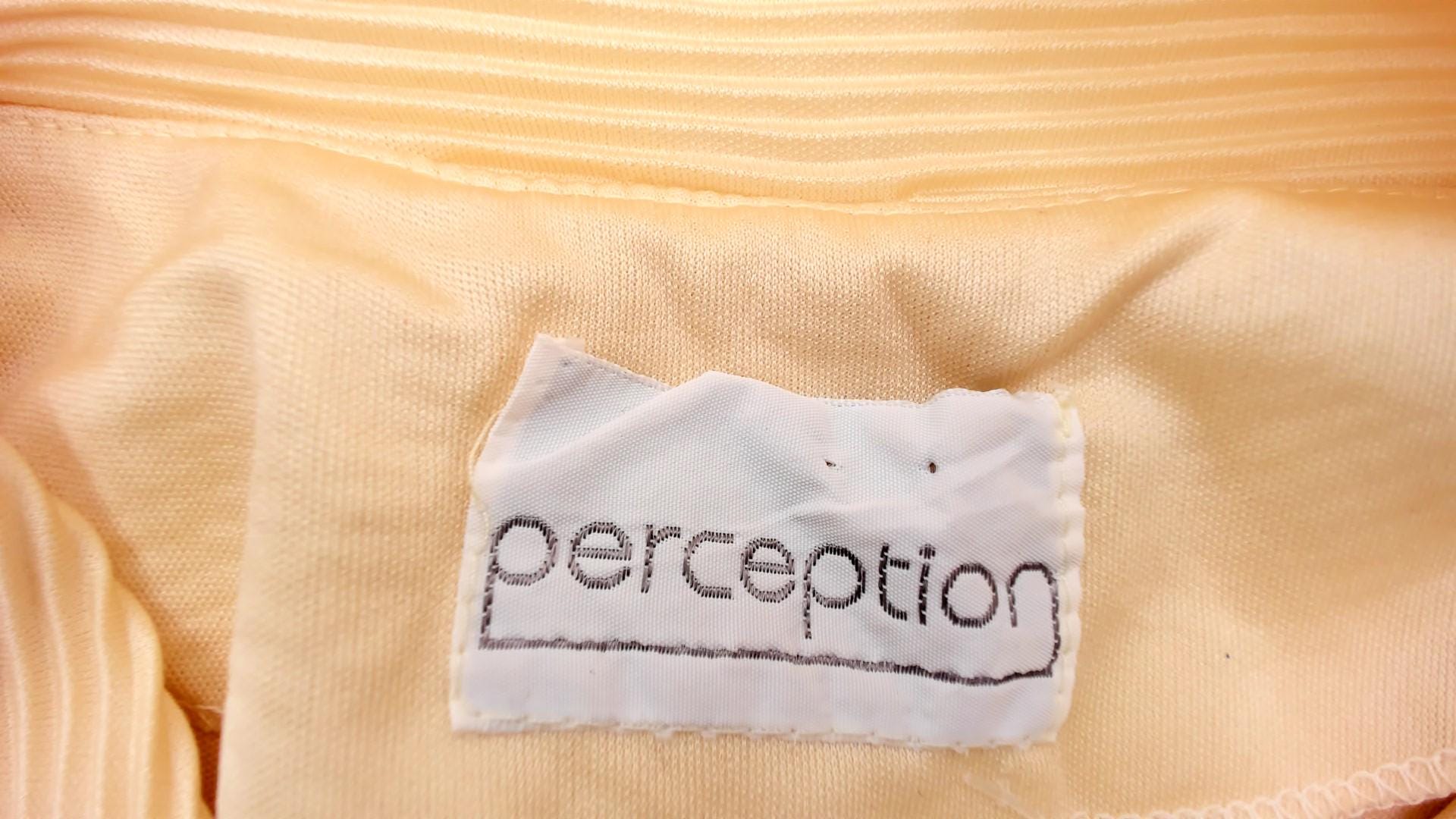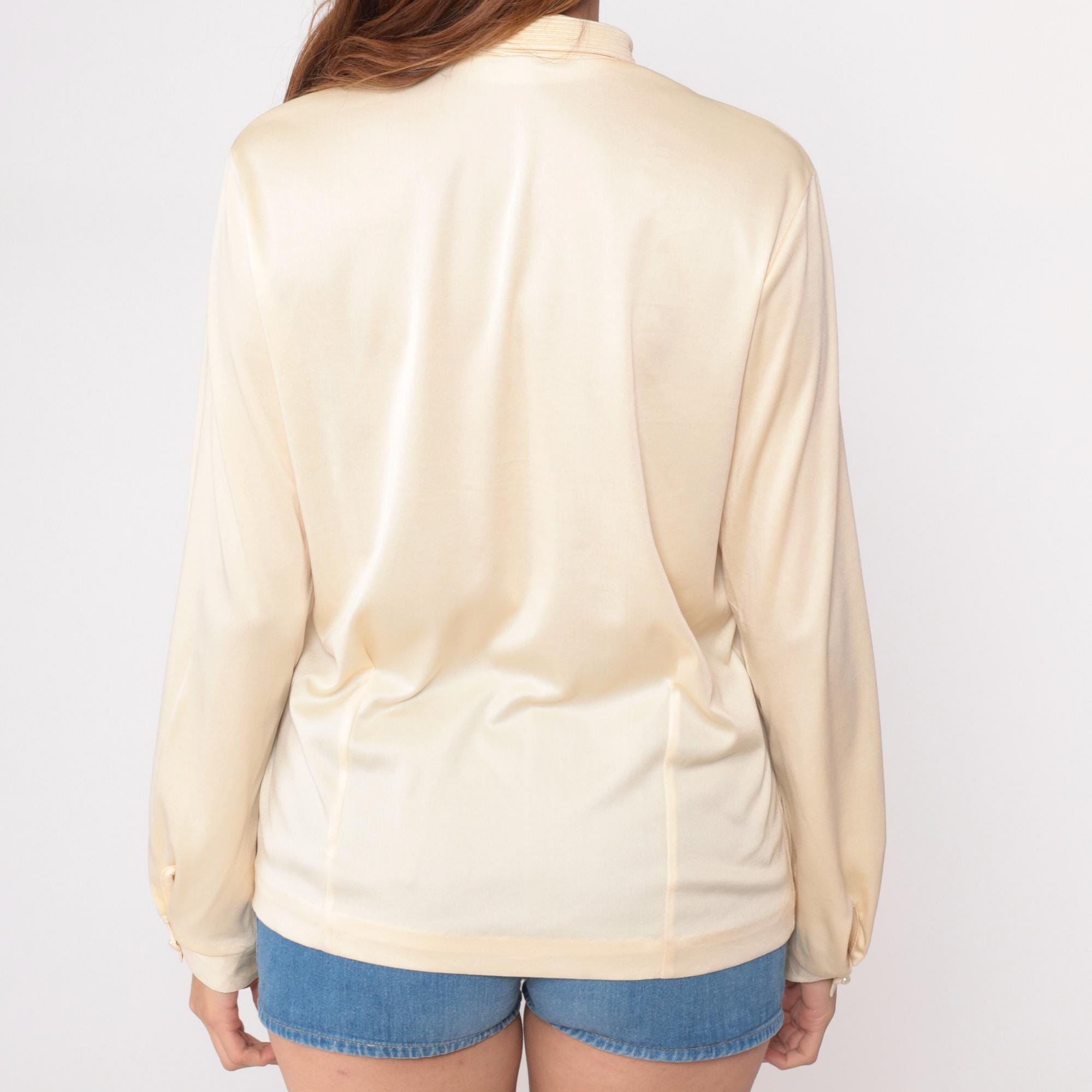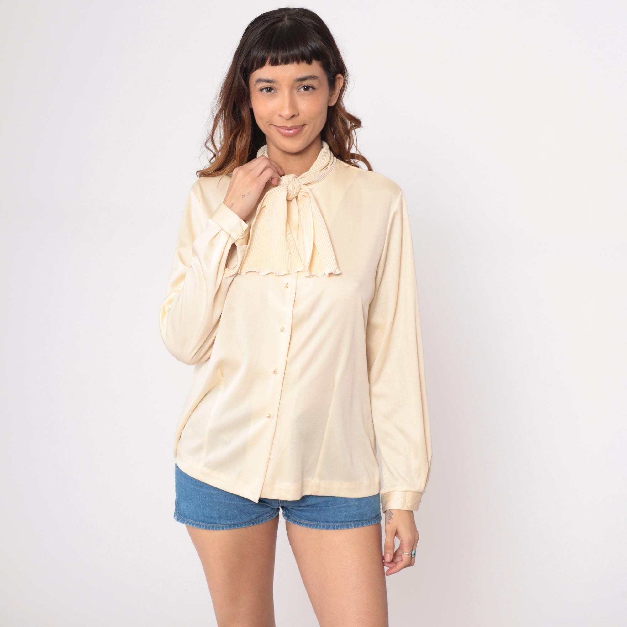 80s cream pussy bow blouse from perception with long pleated tie straps at the neckline. Button front closure with long sleeves and button cuffs.