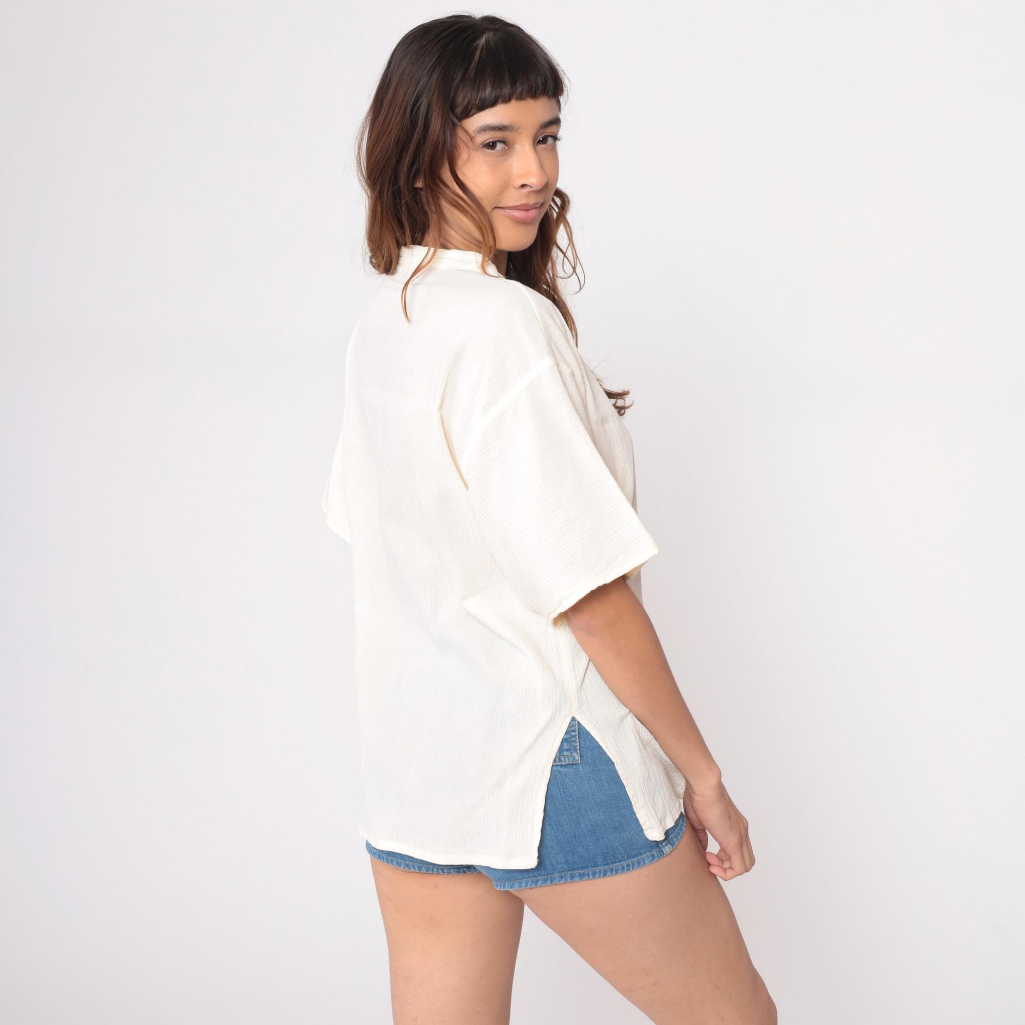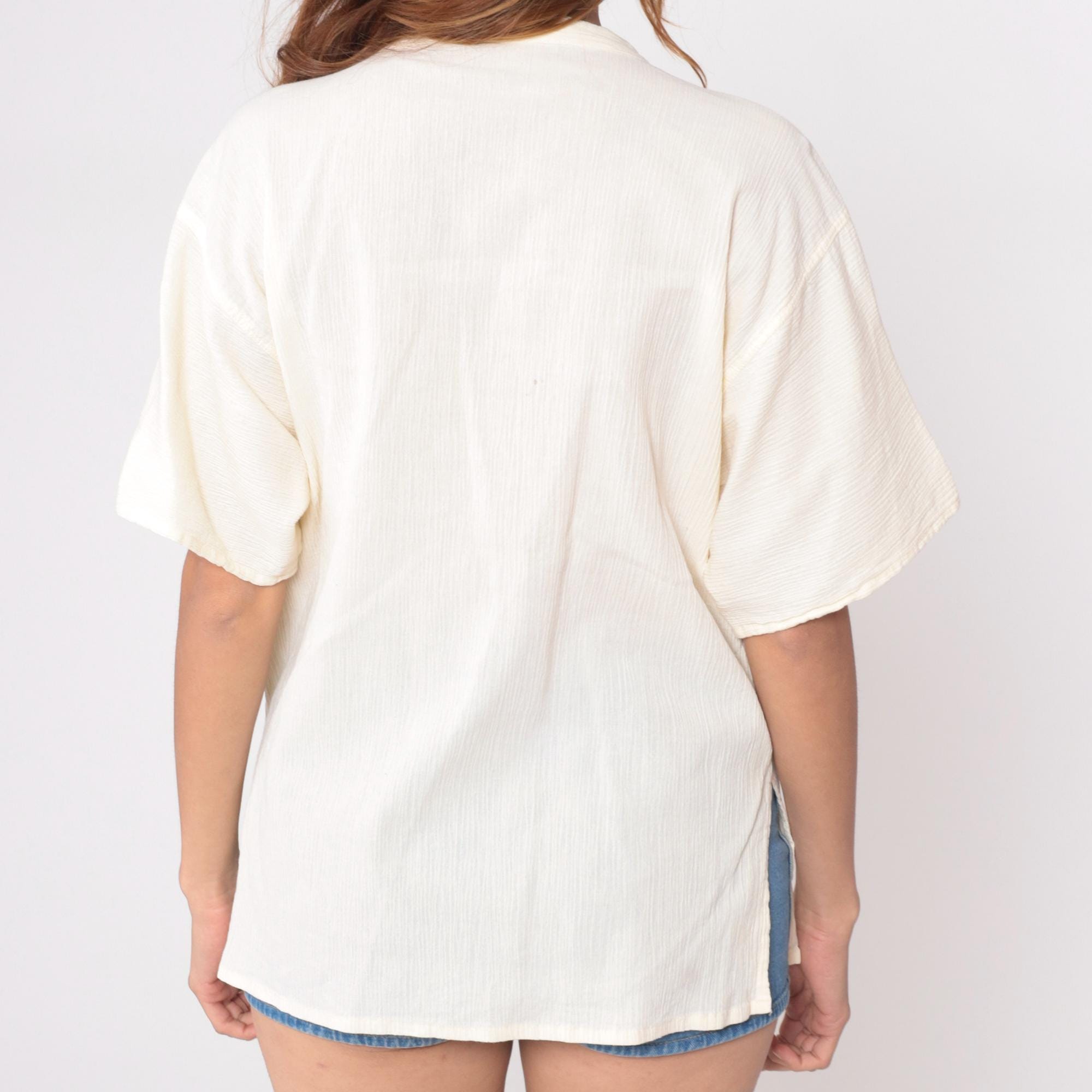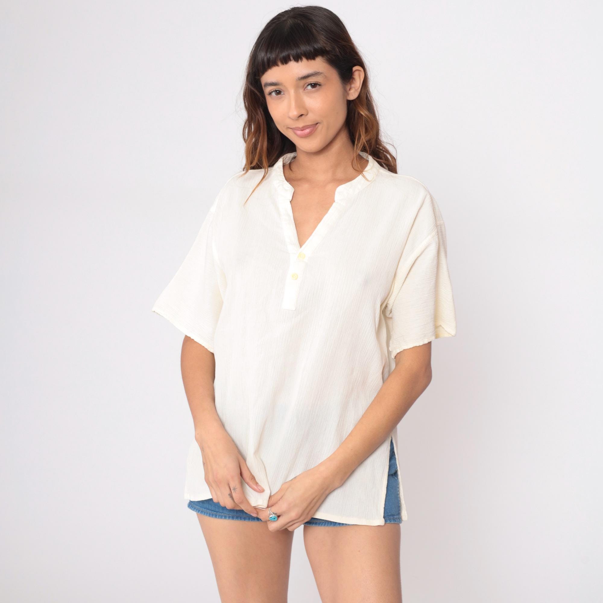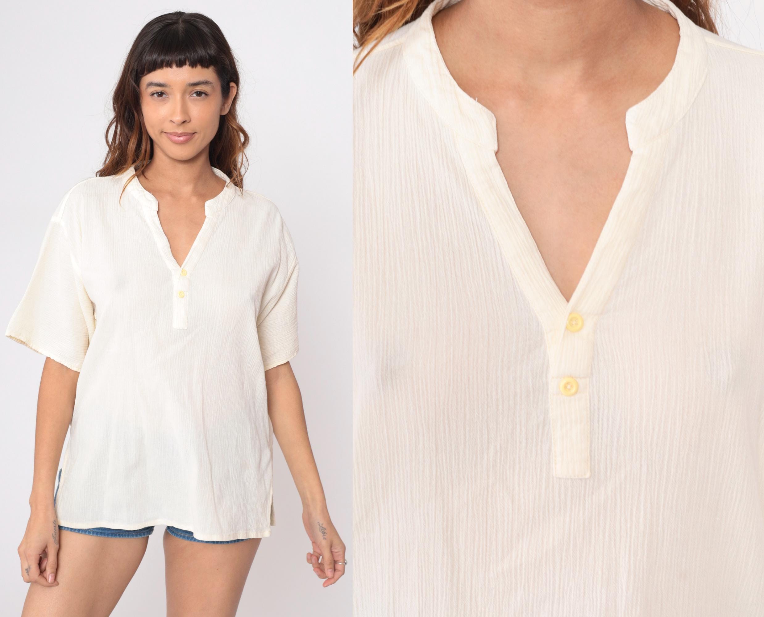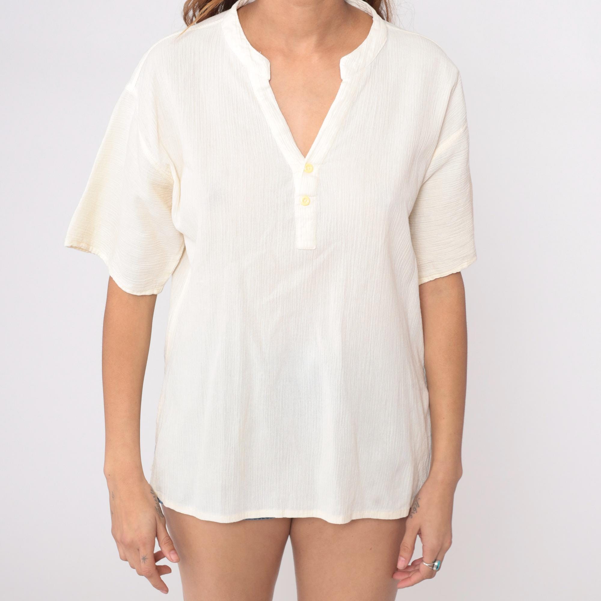 80s cream top with split V-neckline, two-button placket, and short sleeves. Boxy, relaxed fit with textured crinkle fabric throughout.