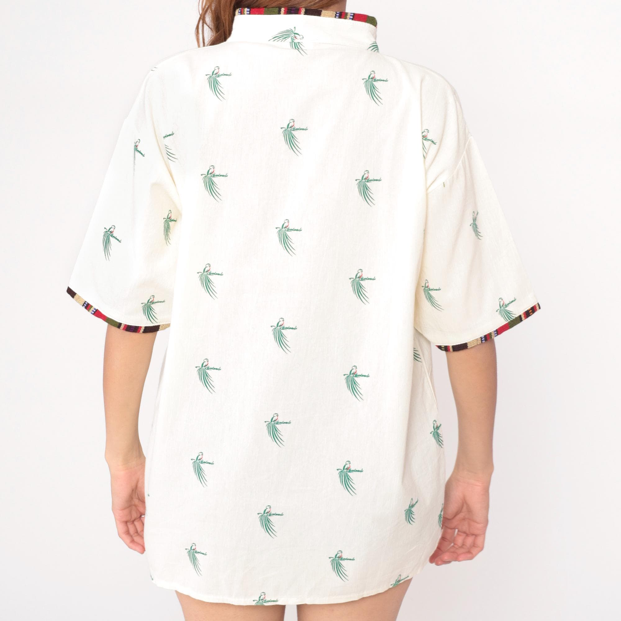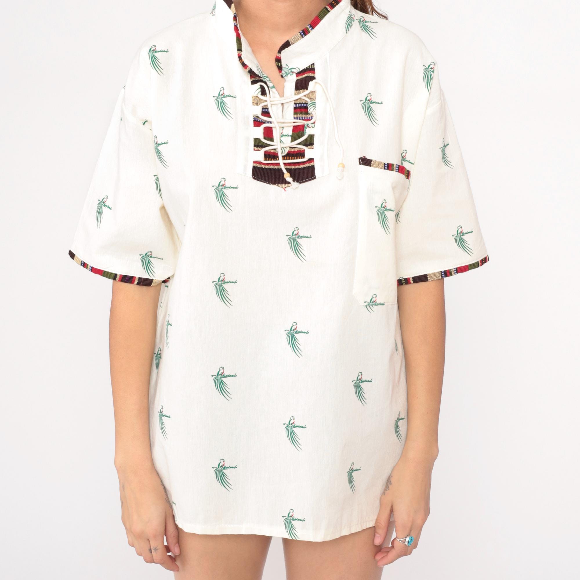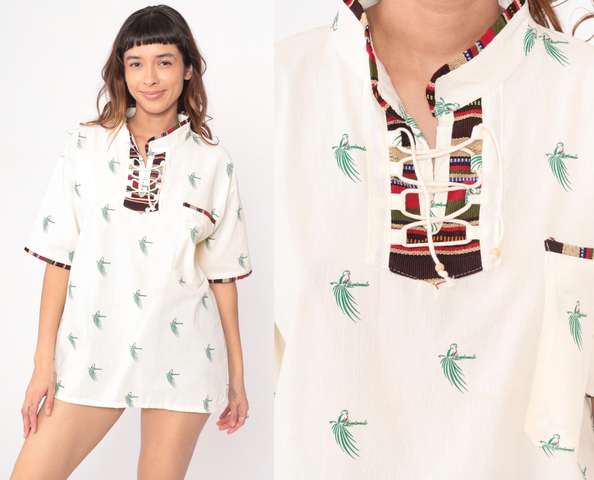 Y2K cream tunic shirt with all-over green quetzal bird print and "Guatemala" text pattern throughout. Lace-up front closure with woven striped tape ties in burgundy, tan, olive, blue, and red. Short sleeves and chest pocket both trimmed with matching multicolor striped binding.