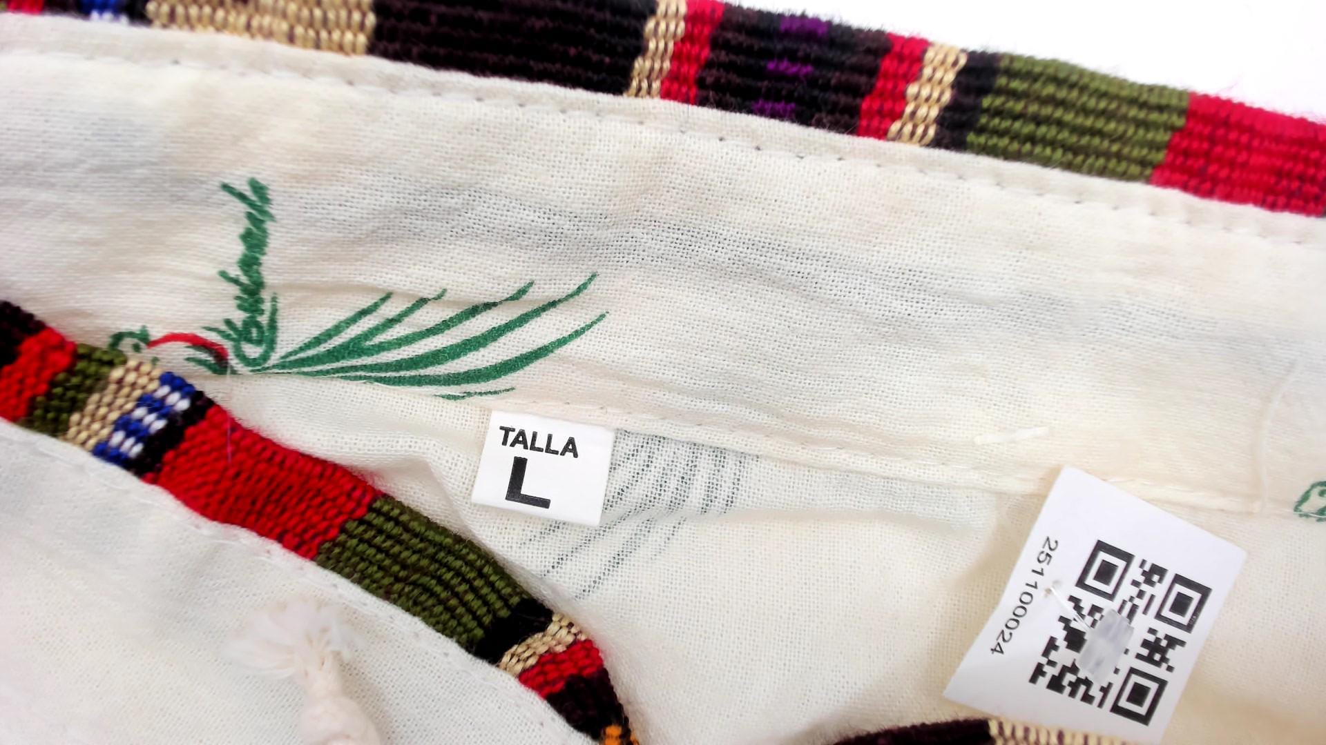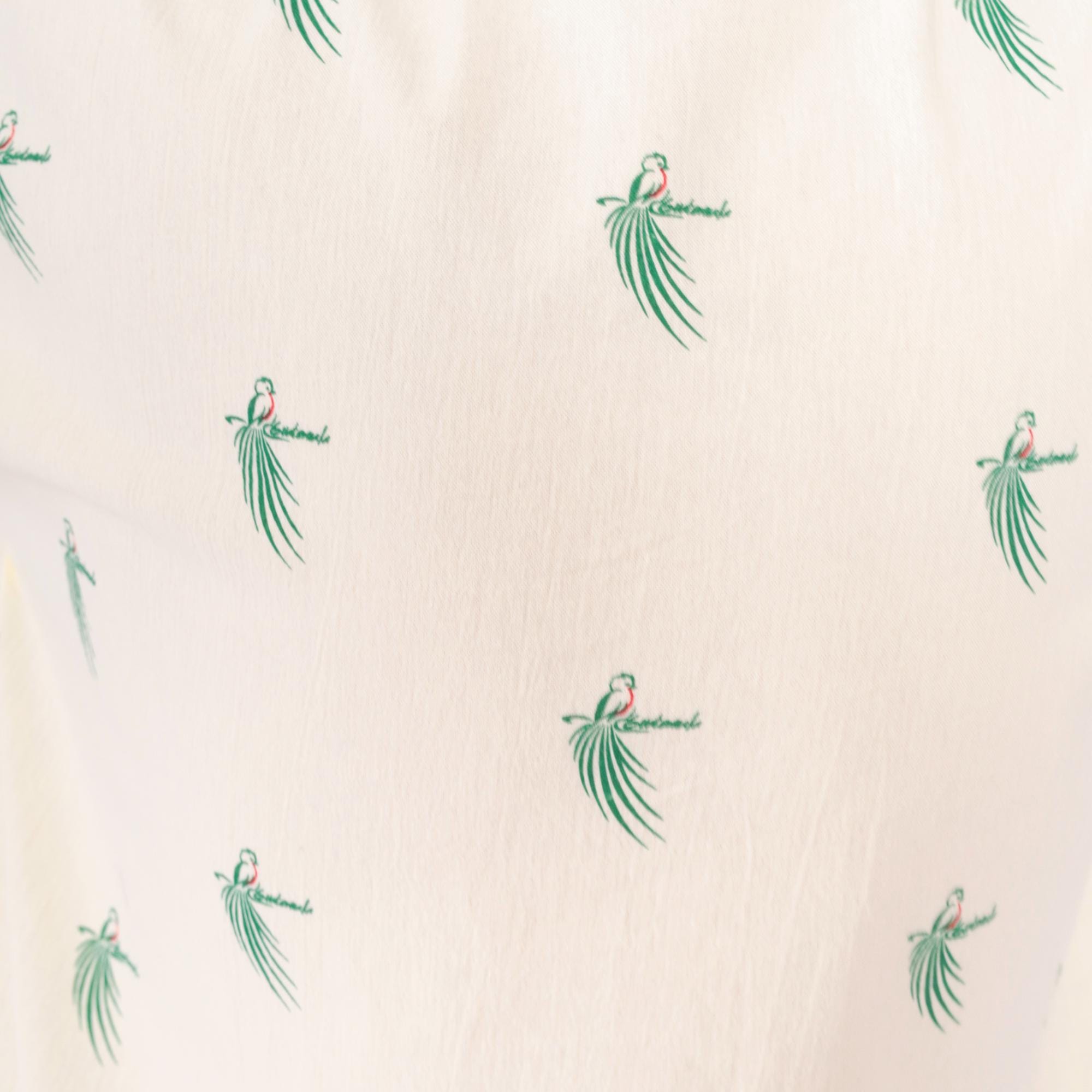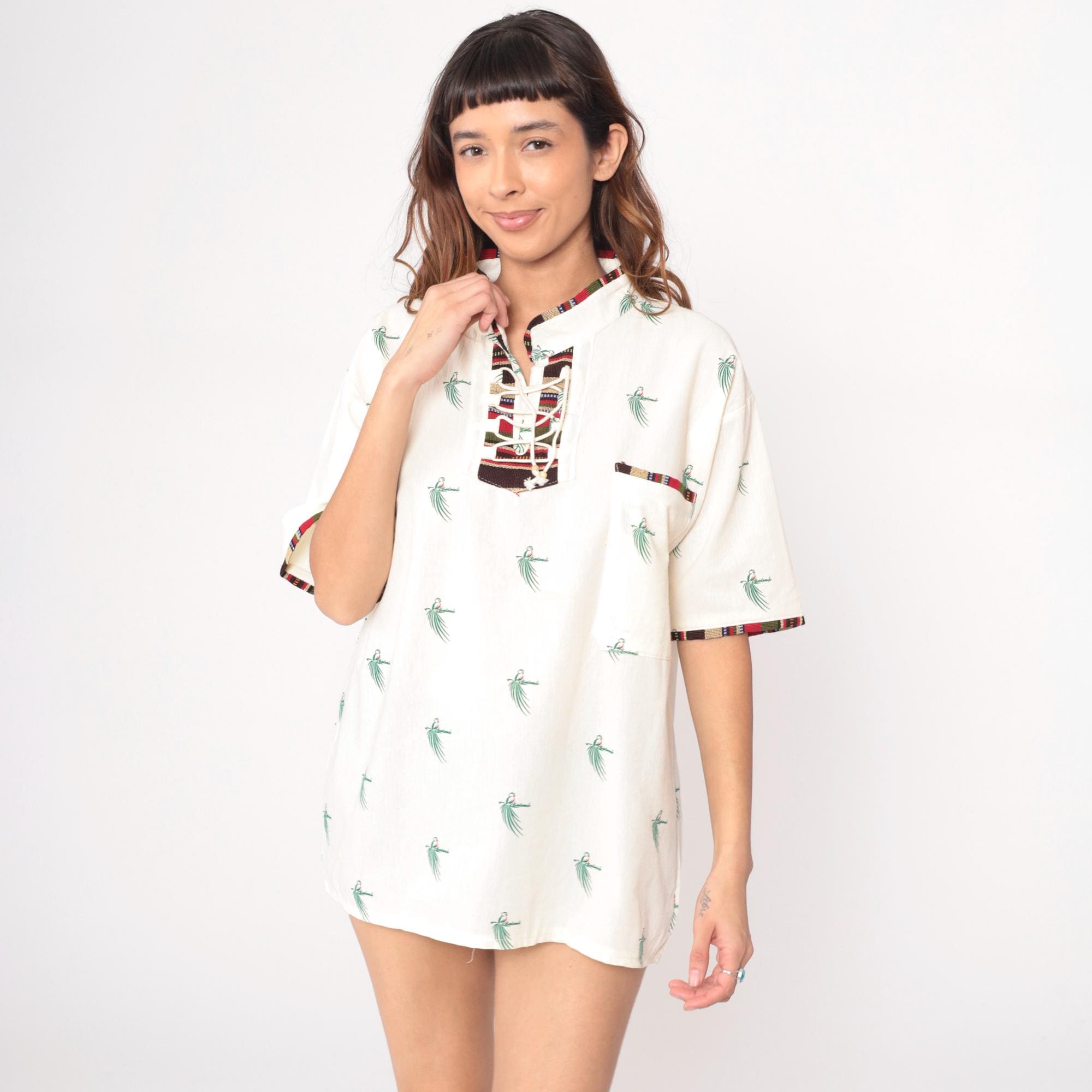 Y2K cream tunic shirt with all-over green quetzal bird print and "Guatemala" text pattern throughout. Lace-up front closure with woven striped tape ties in burgundy, tan, olive, blue, and red. Short sleeves and chest pocket both trimmed with matching multicolor striped binding.