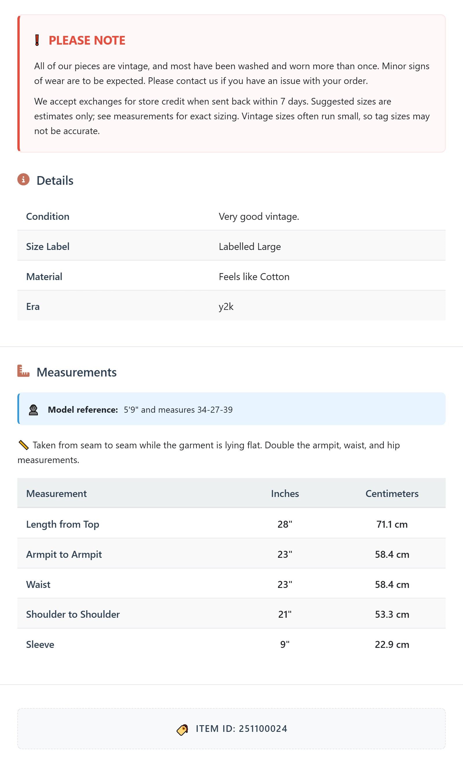 Suggested sizes are estimates only; see measurements for exact sizing. Vintage sizes often run small, so tag sizes may not be accurate.