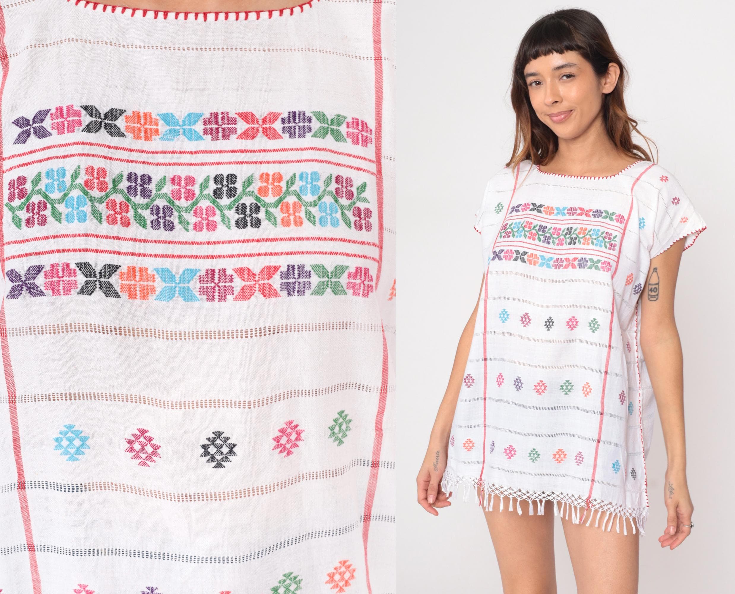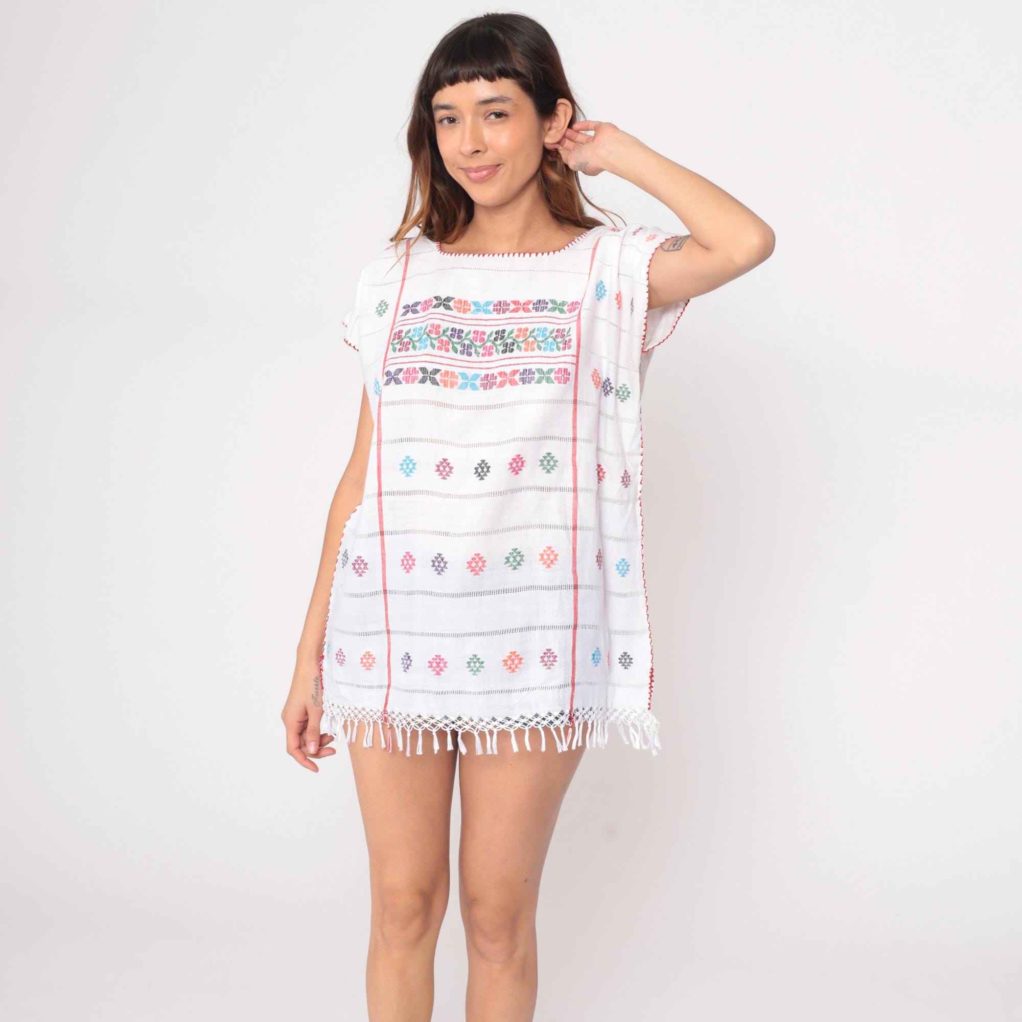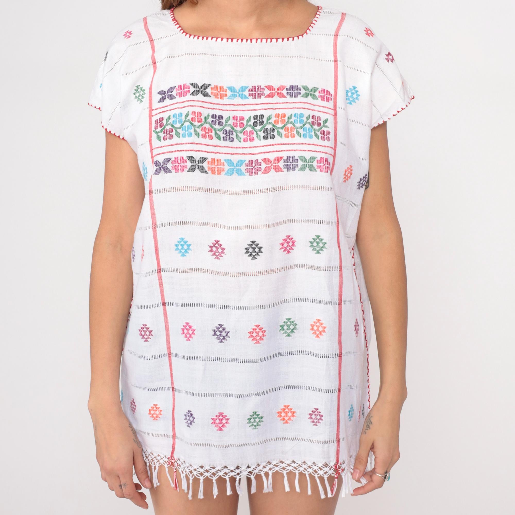 80s white embroidered tunic top with colorful cross-stitch geometric patterns in pink, blue, green, orange, purple, and black. Horizontal bands feature butterfly and floral motifs at chest, diamond patterns below, with red trim at scoop neckline and short sleeves. Fringe hem, side slits with matching red trim. Feels like cotton.