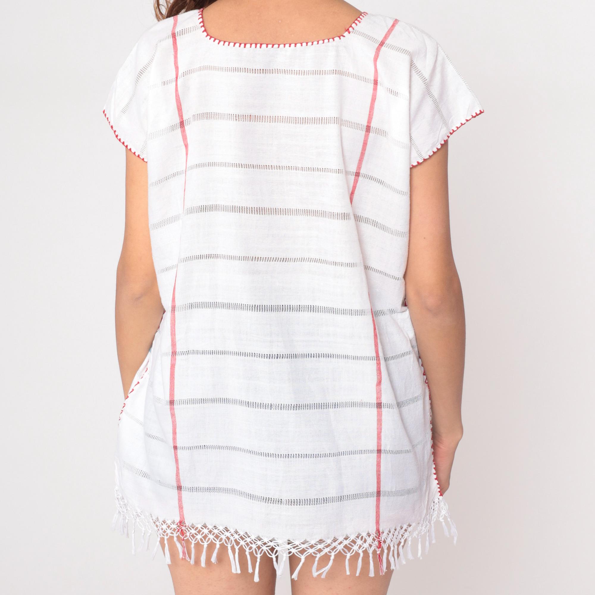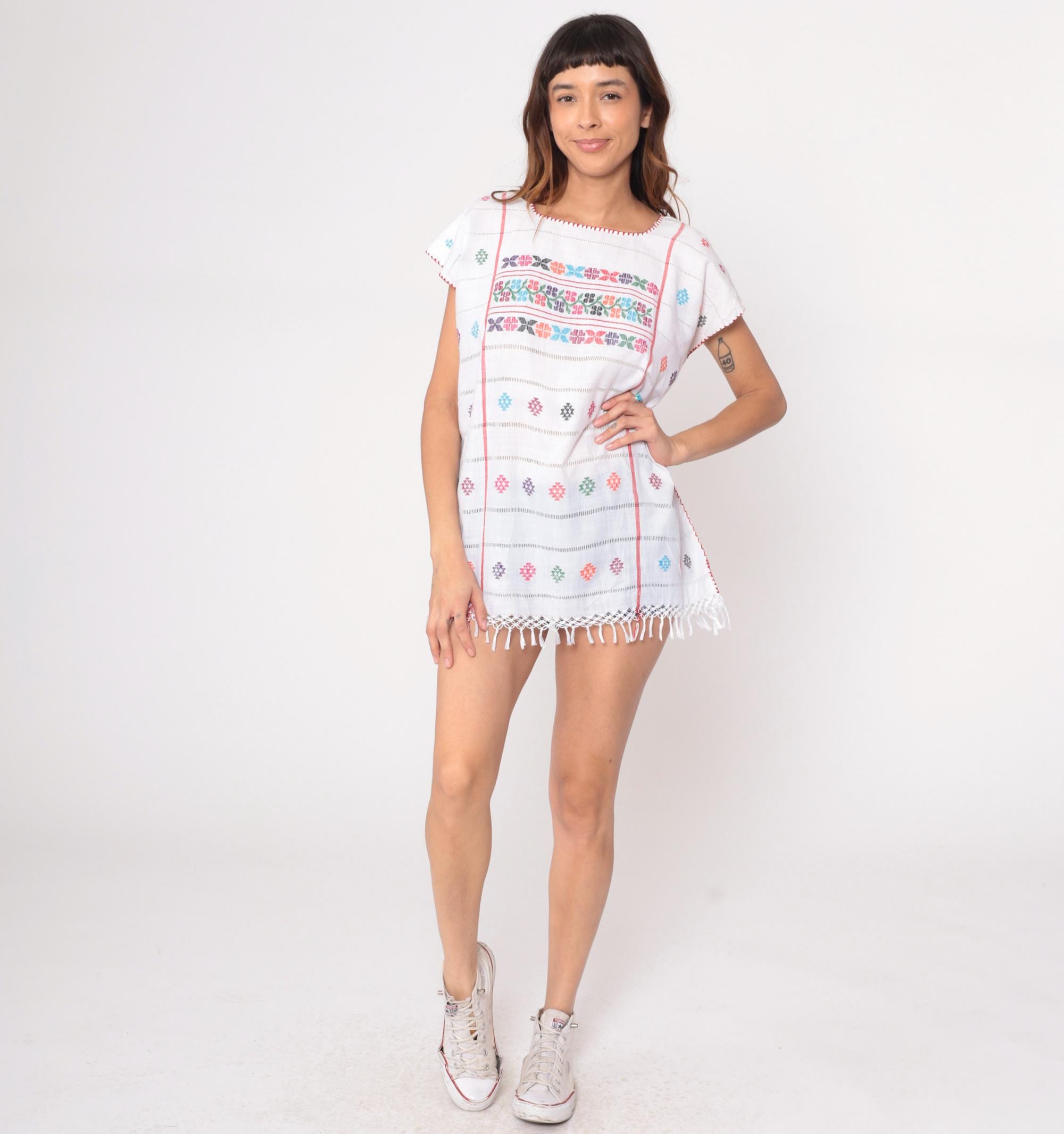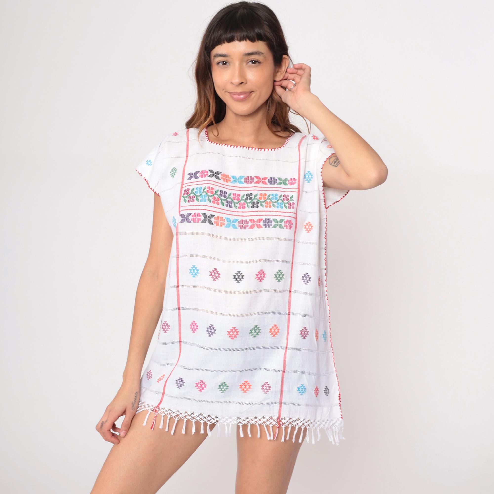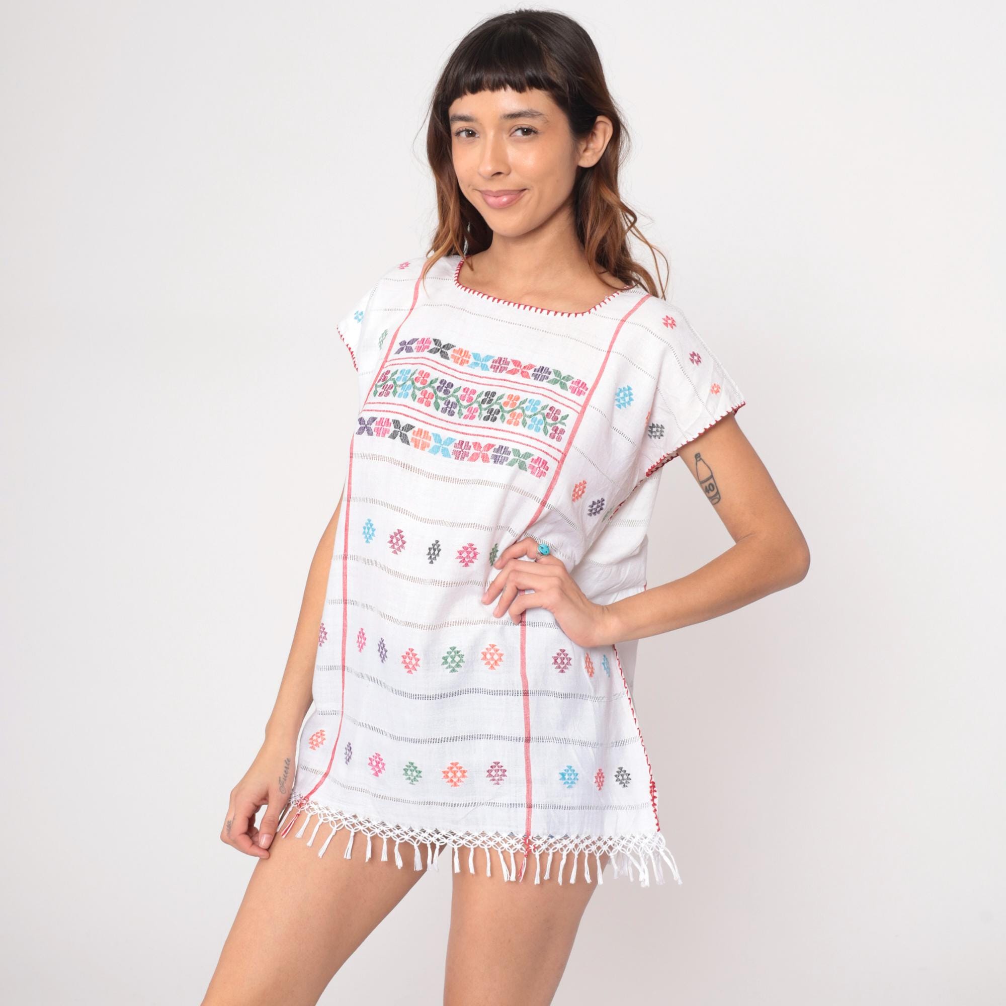 80s white embroidered tunic top with colorful cross-stitch geometric patterns in pink, blue, green, orange, purple, and black. Horizontal bands feature butterfly and floral motifs at chest, diamond patterns below, with red trim at scoop neckline and short sleeves. Fringe hem, side slits with matching red trim. Feels like cotton.