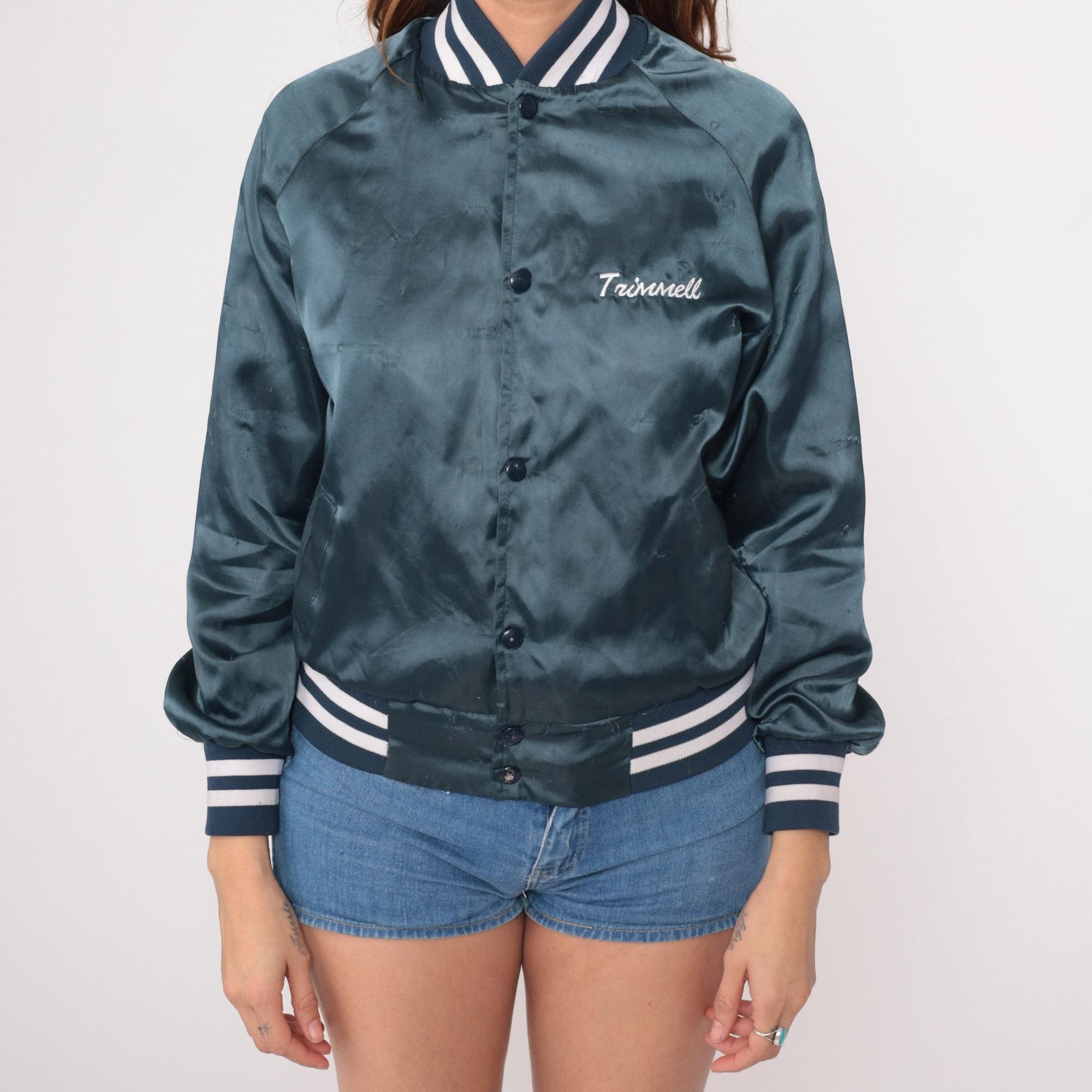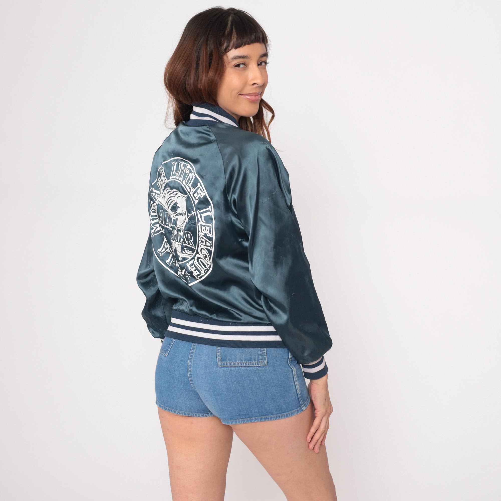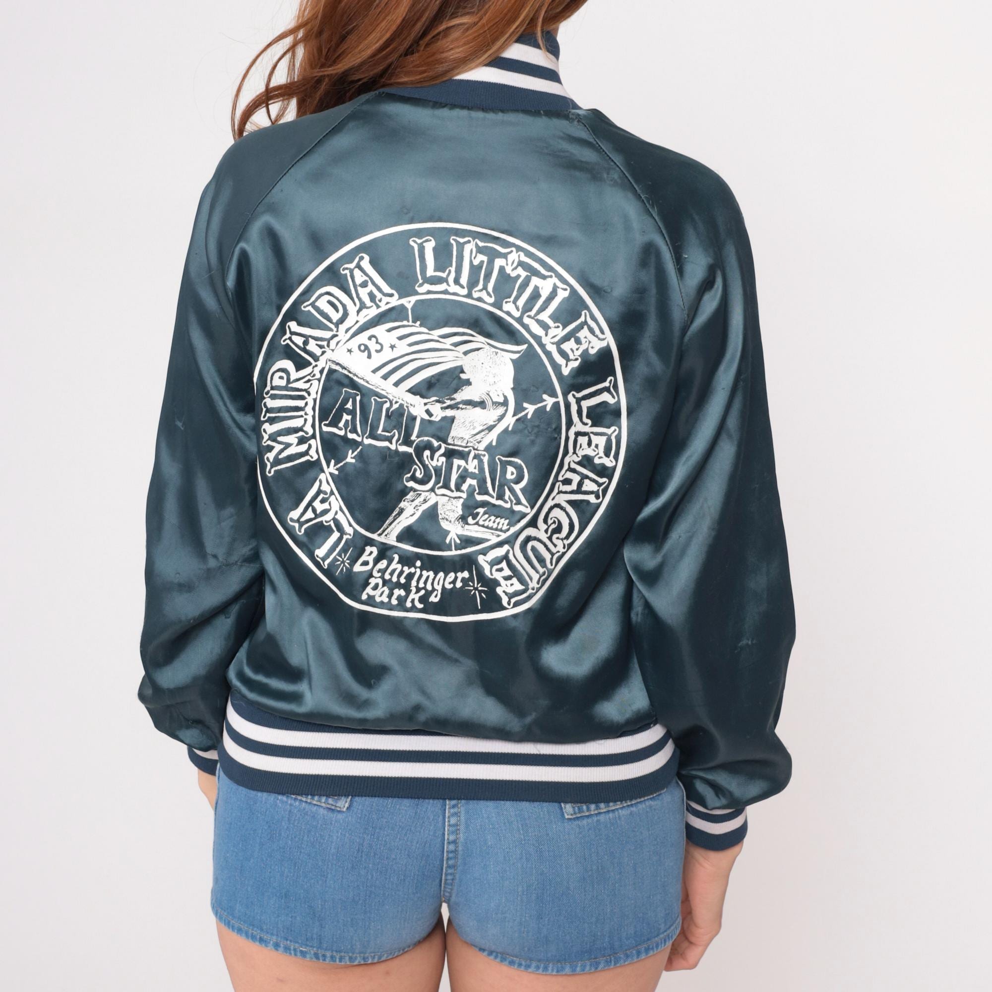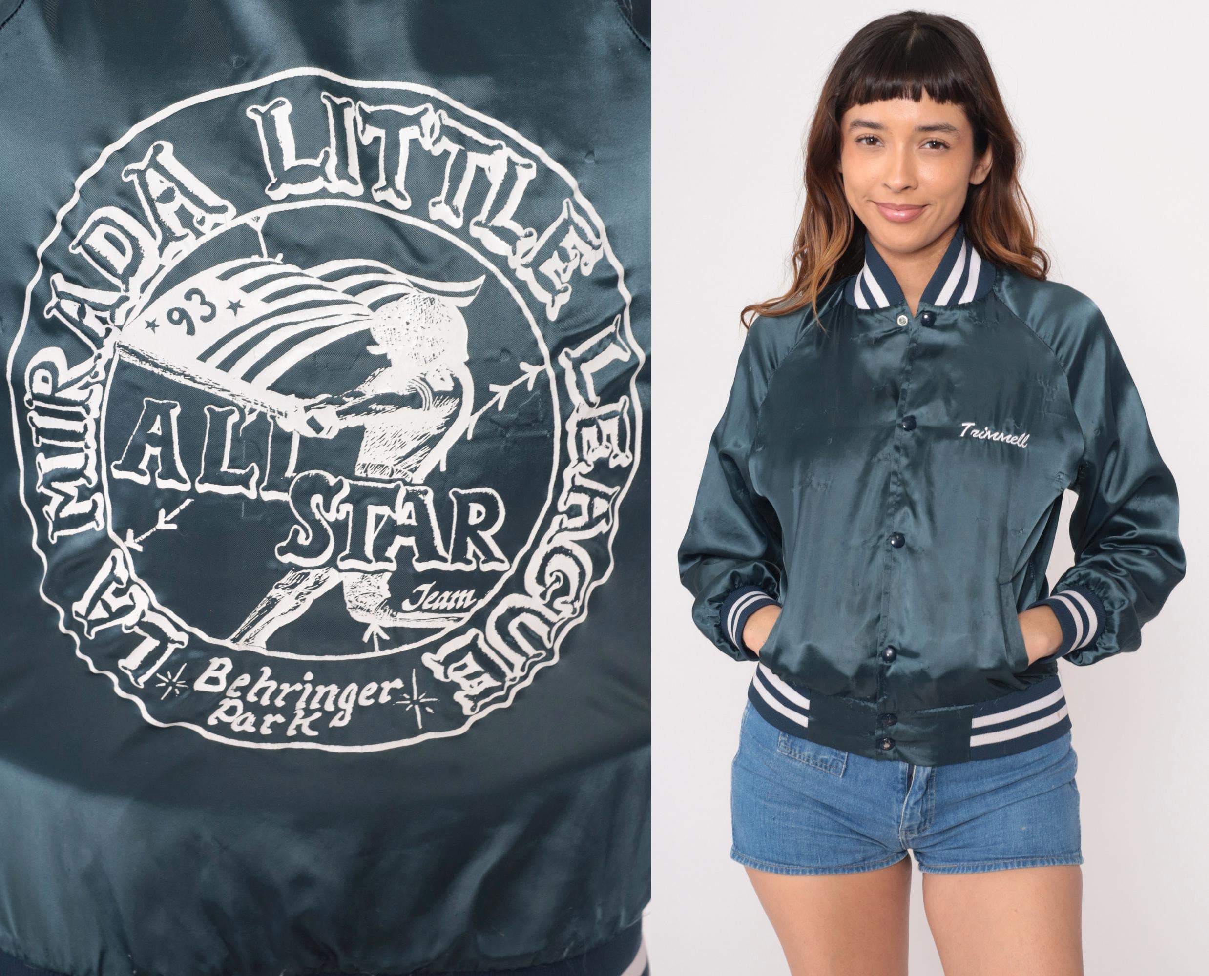 Navy baseball jacket from the 90s with "La Mirada Little League All Star" team logo on back and "Trimmell" embroidered on front chest. Snap button front closure with navy and white striped ribbed collar, cuffs, and waistband. Side pockets and classic bomber jacket silhouette. Nylon satin material. Tagged youth large fits adult extra small.