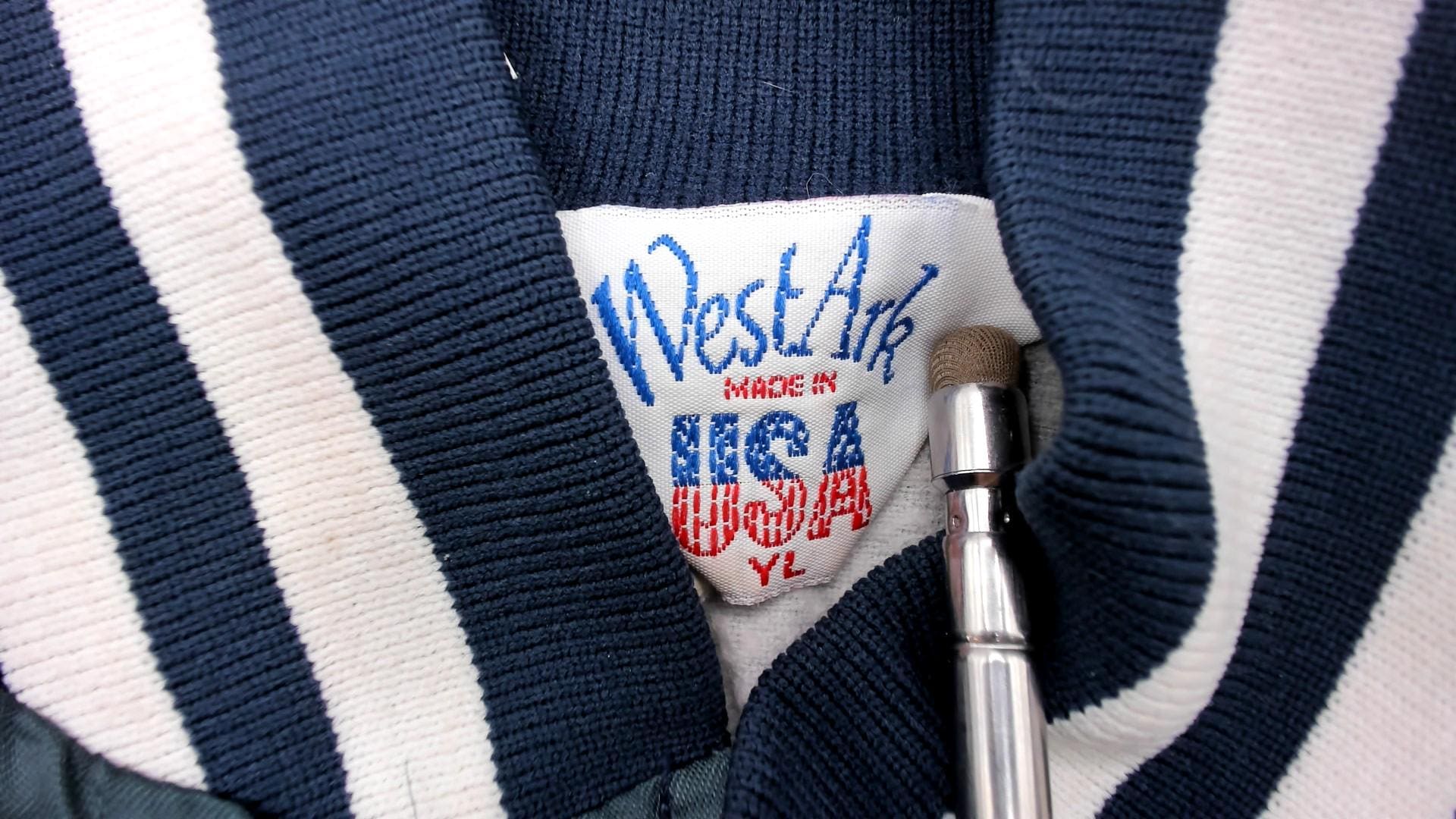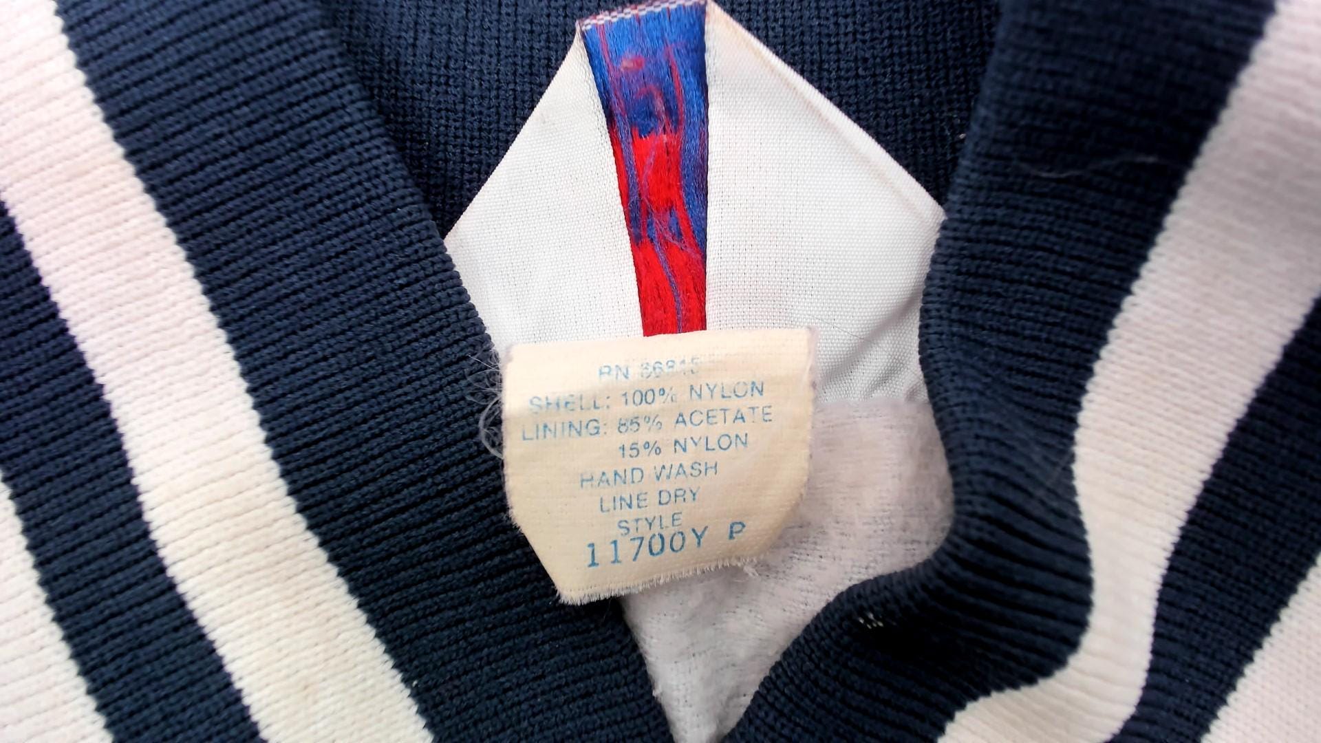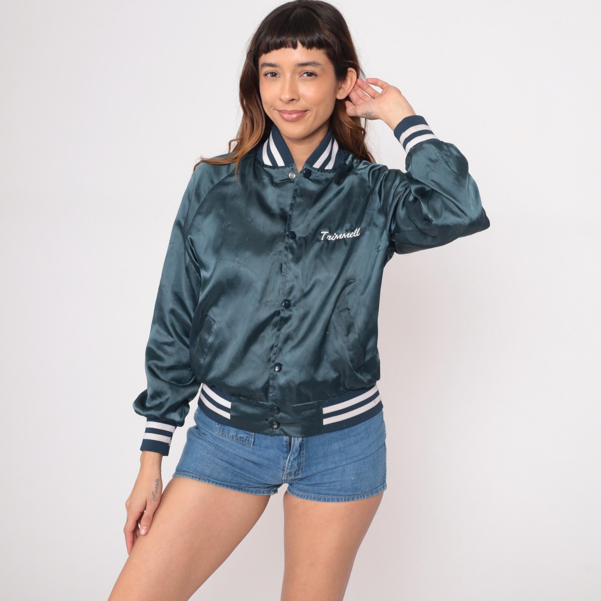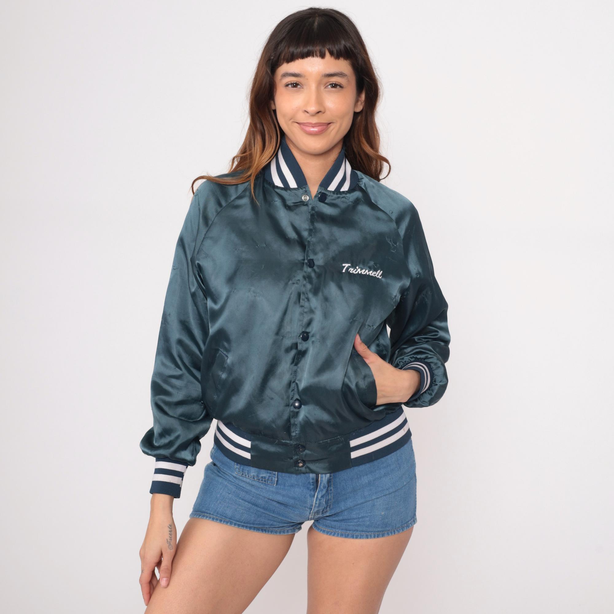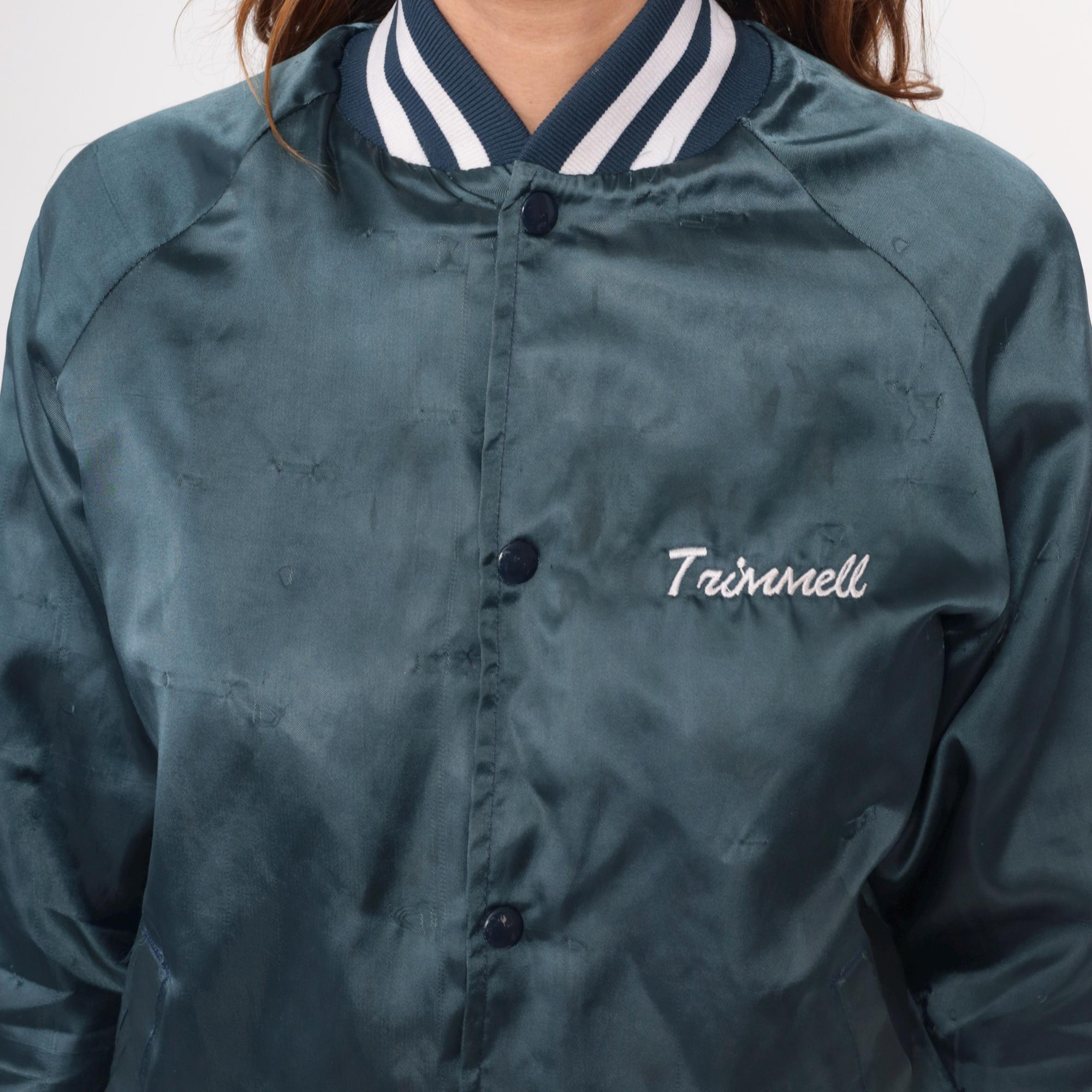 Navy baseball jacket from the 90s with "La Mirada Little League All Star" team logo on back and "Trimmell" embroidered on front chest. Snap button front closure with navy and white striped ribbed collar, cuffs, and waistband. Side pockets and classic bomber jacket silhouette. Nylon satin material. Tagged youth large fits adult extra small.